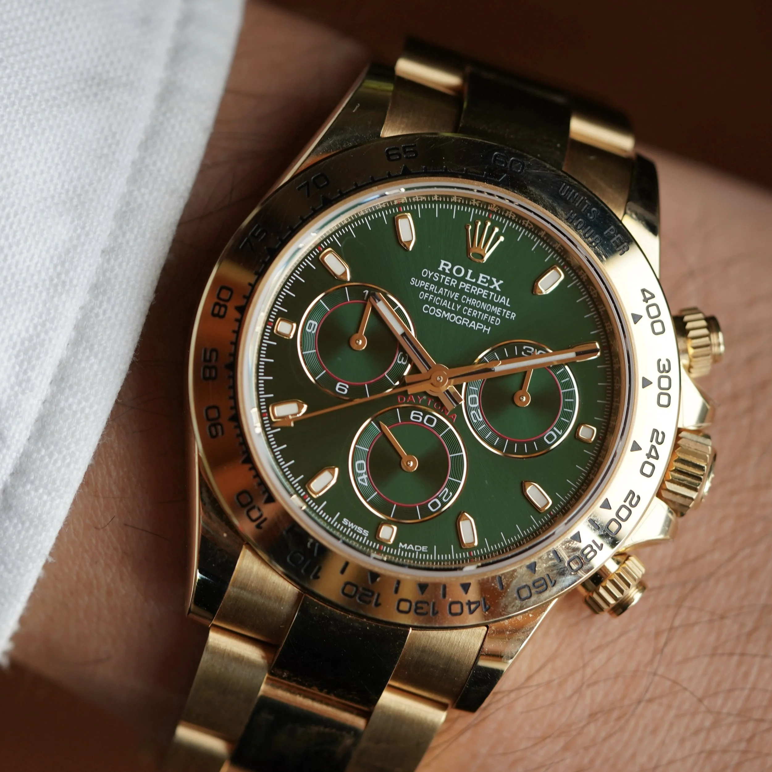 Nicknamed for the 2nd appearance on HODINKEE Talking Watches, this Rolex Daytona reference 116508 with green anniversary dial would take on the rockstar nickname "John Mayer". Despite being a departure from the Daytona’s utility-based nature, this model has become admired amongst a range of Rolex collectors and has been spotted on many other notable wrists including Jonah Hill’s. The case measures 40mm in diameter. The watch is unpolished.