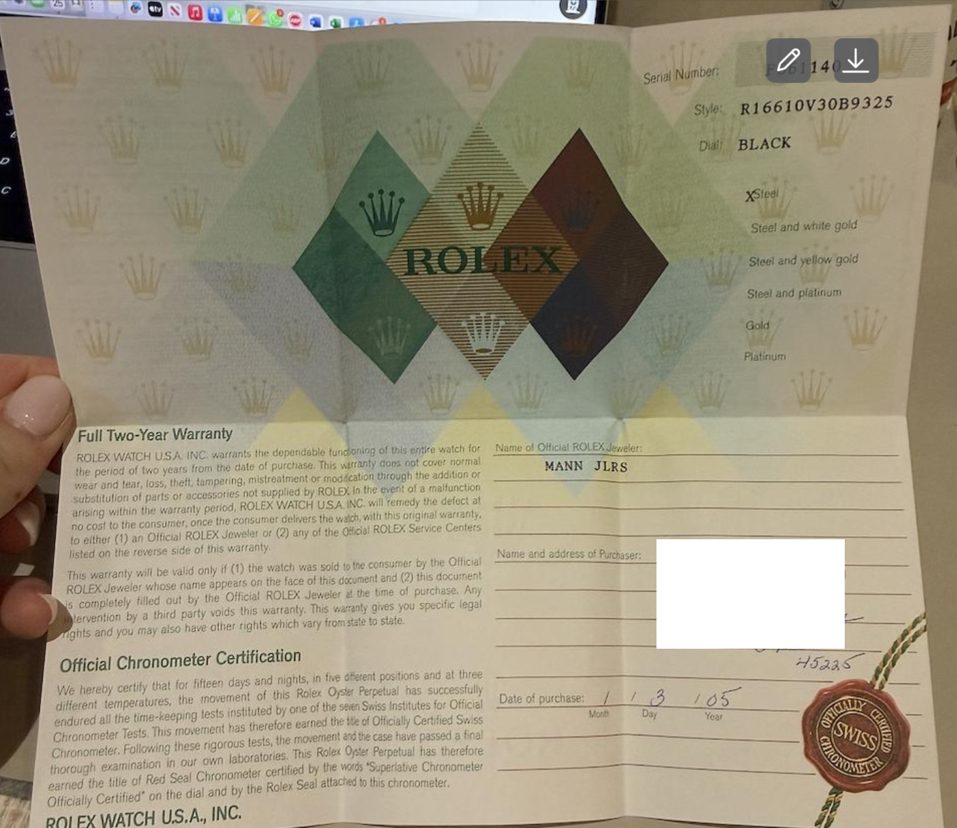 The watch comes with box and papers. We do not know the service history but it is running well. It recently passed a water resistance test of 5 bar.