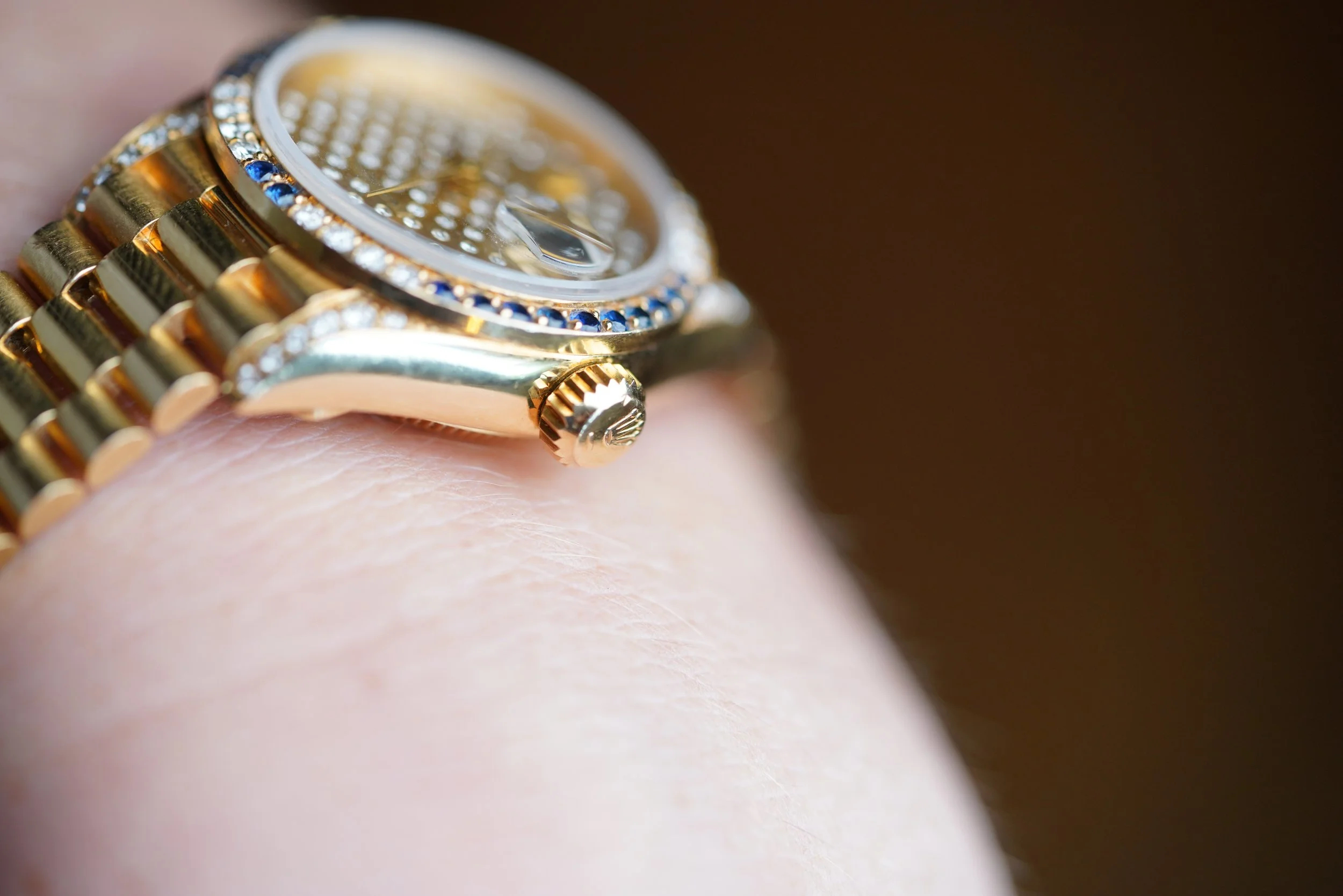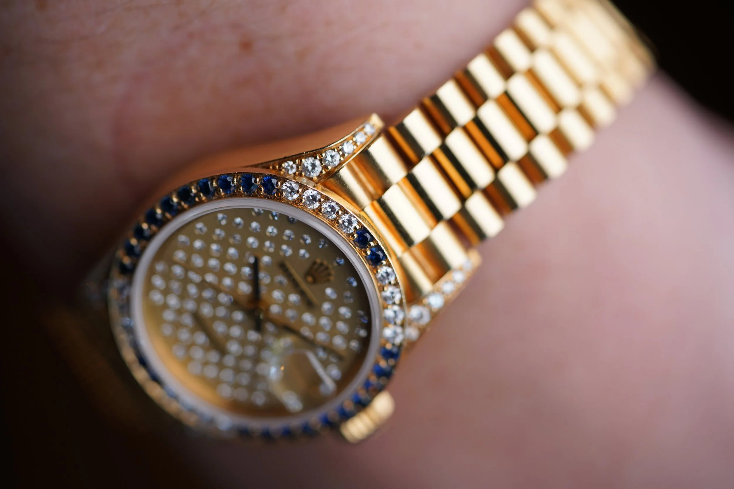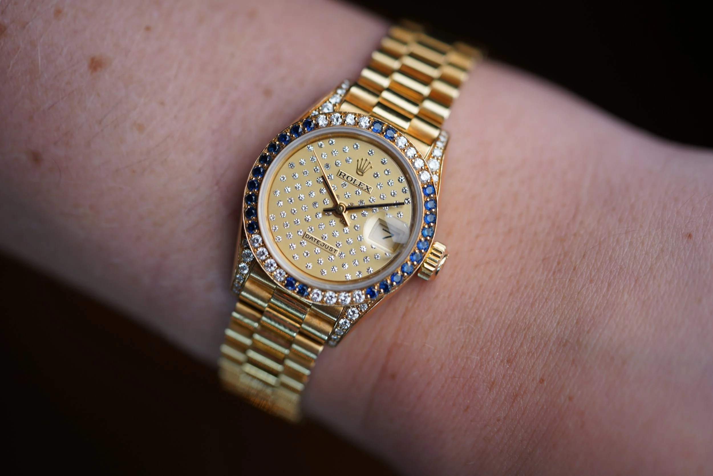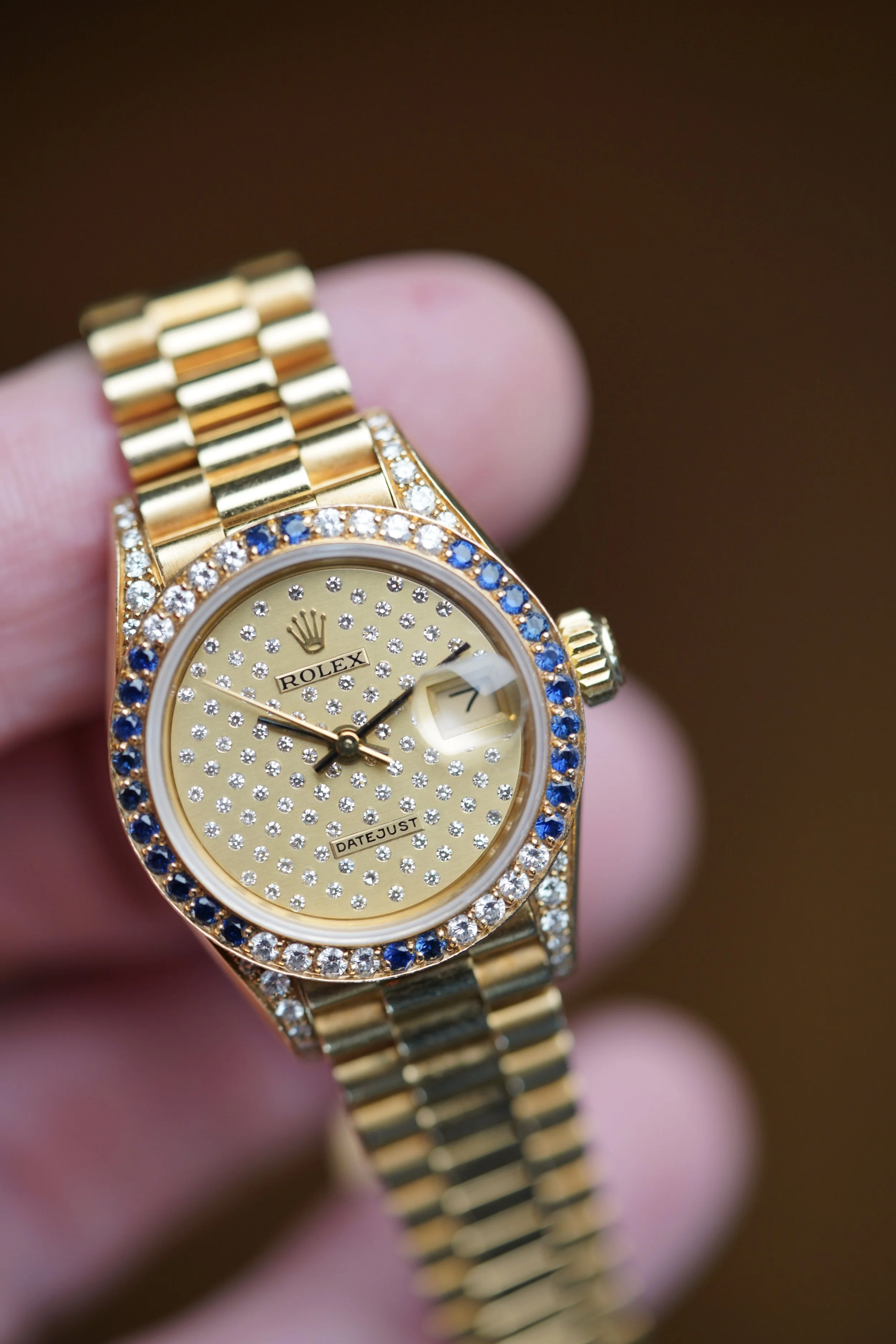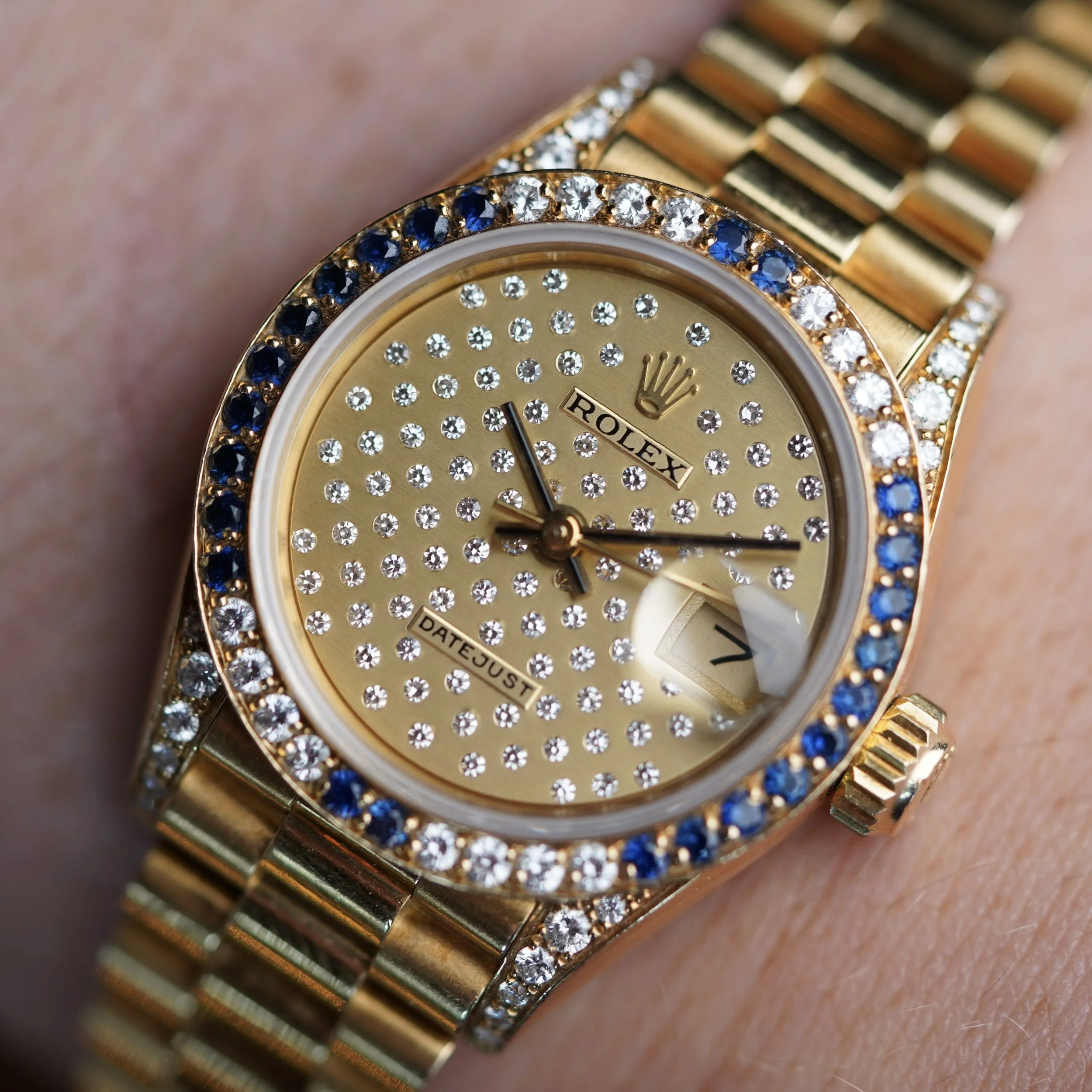 This Rolex Ladies Datejust reference 69038 is an exceptional watch. It features a rare pleiades dial with diamonds. The bezel is set with diamonds and sapphires and the lugs are set with diamonds. The watch is paired on a firm presidential bracelet. Both the watch and bracelet are made of 18k yellow gold. The watch measures approximately 26mm in diameter and 32.5mm lug-to-lug. These watches were a fortune back in the day at retail. The serial is a 9.5M dating to circa 1988.