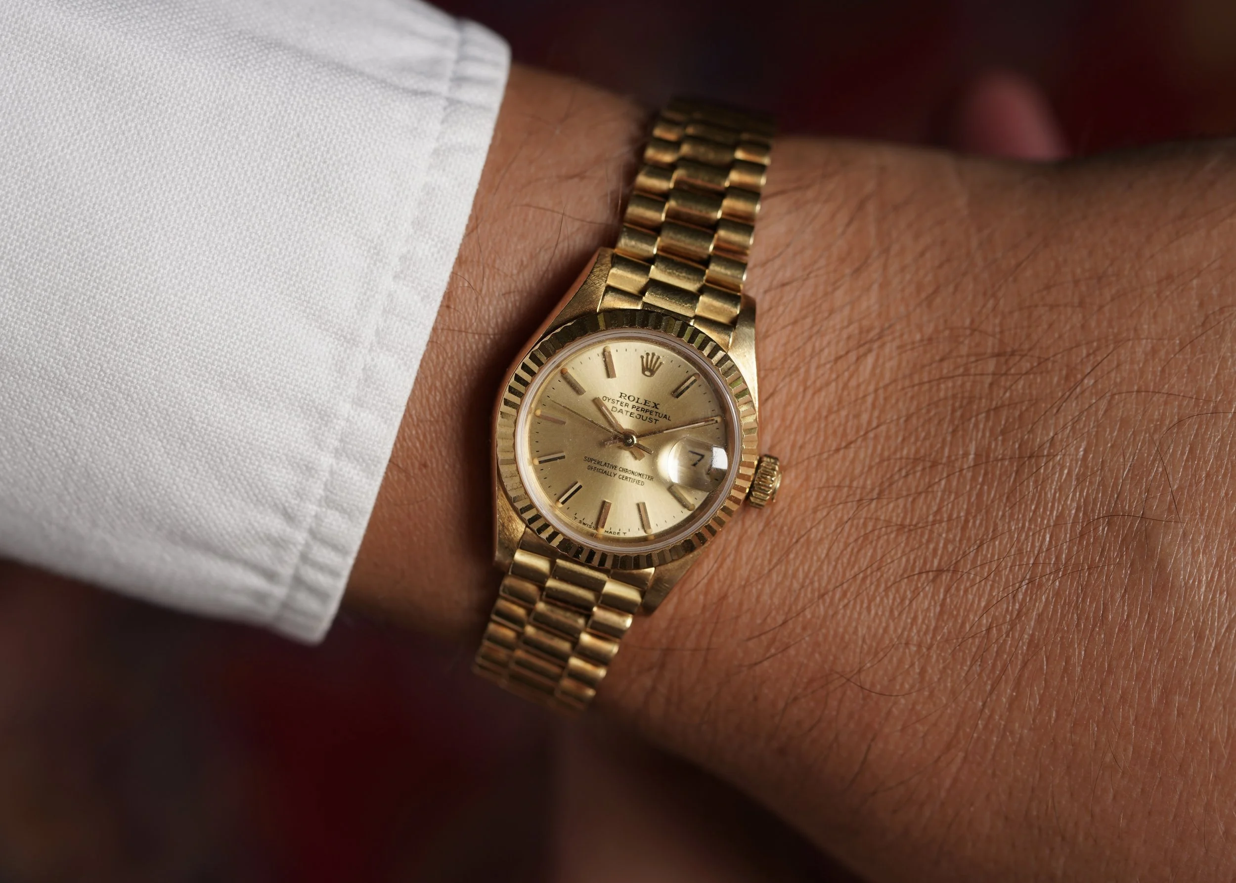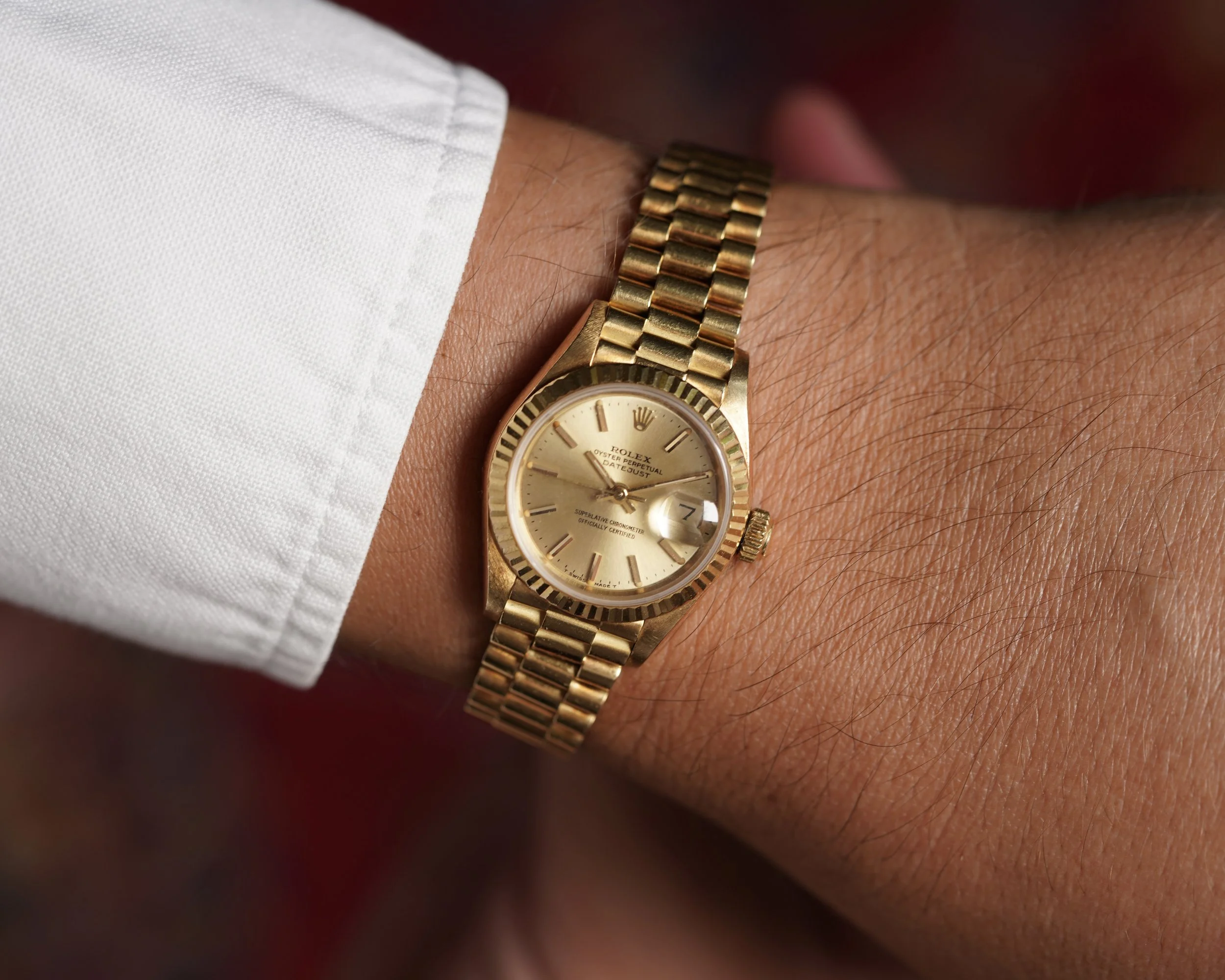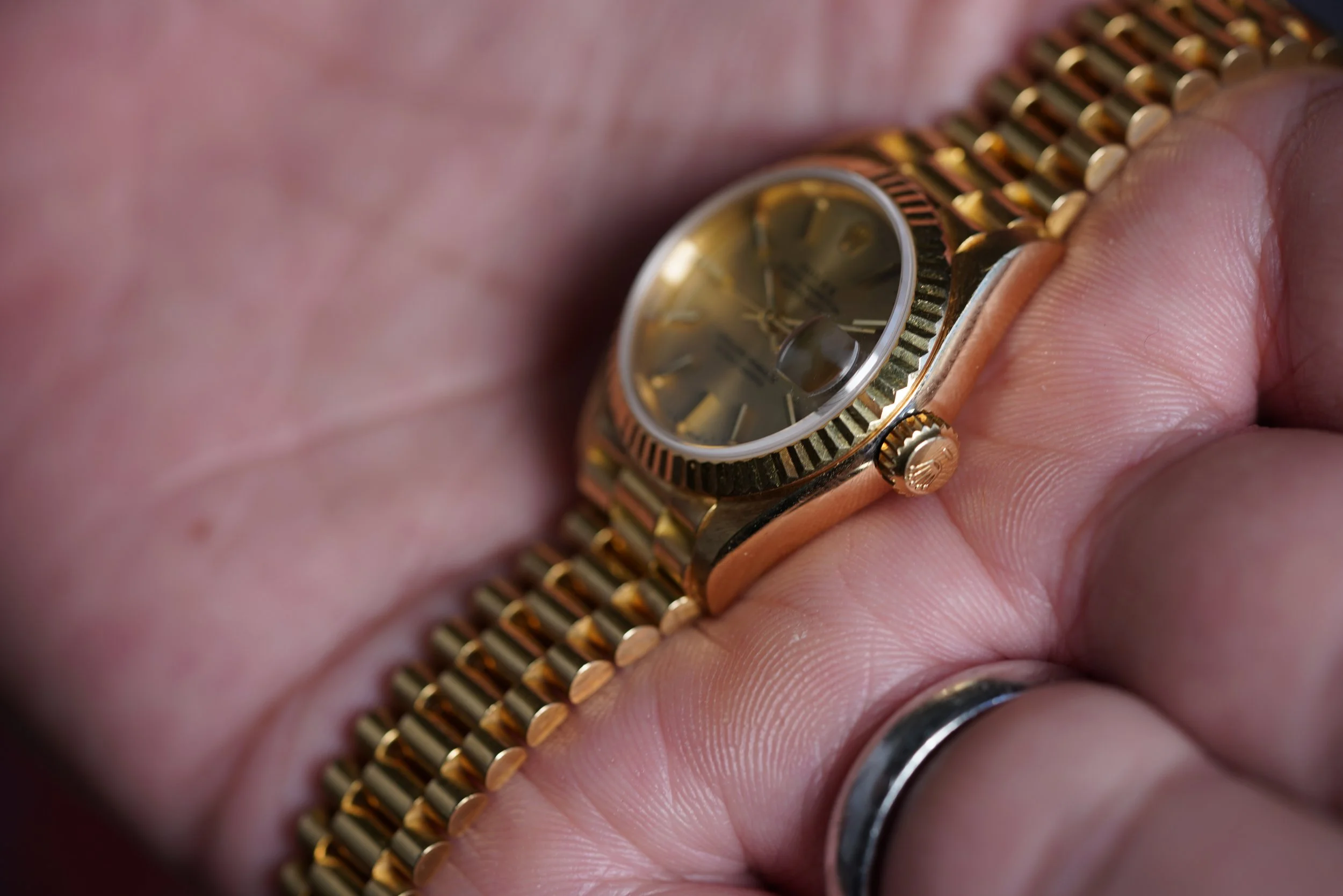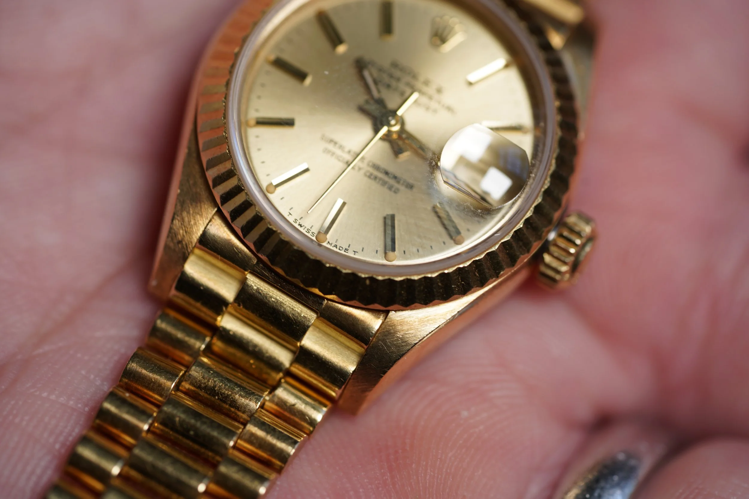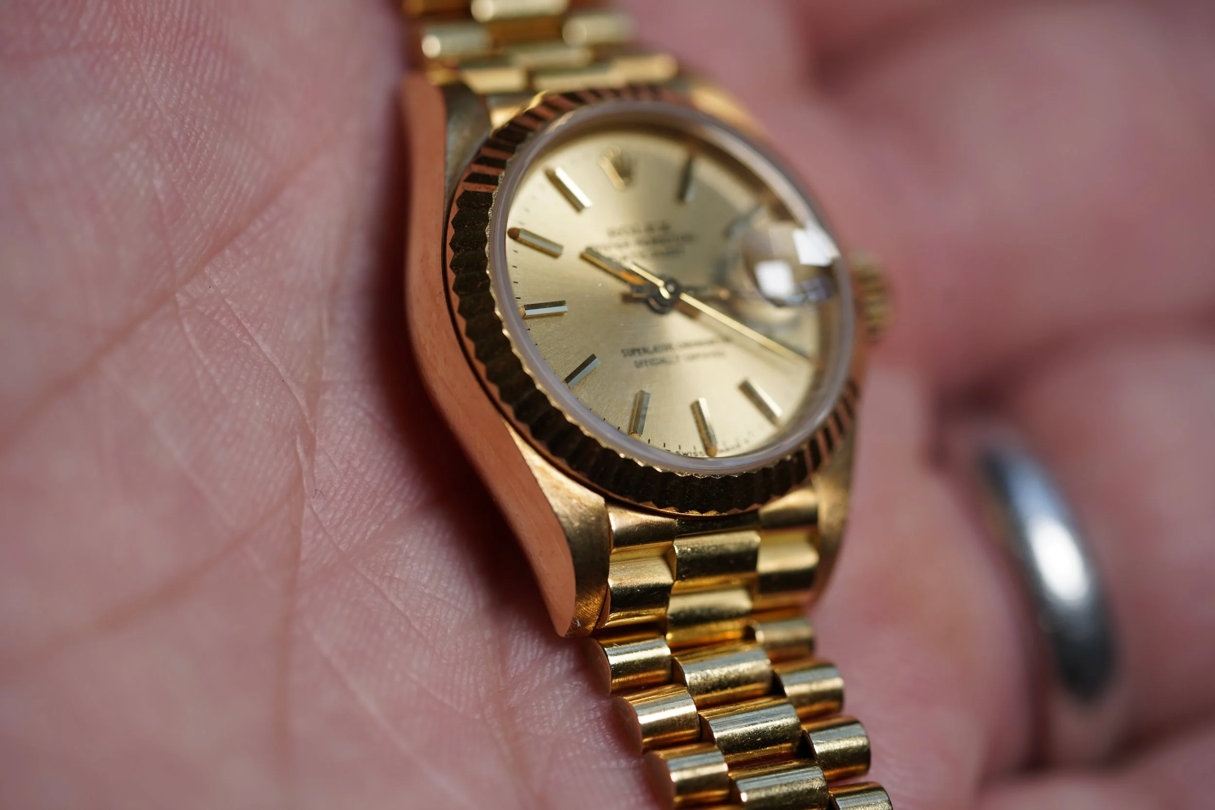 We are thrilled to offer this very exceptional Rolex Datejust reference 69178. It is a stunning example and is 18k yellow gold. We believe it to be unpolished. The case is 26mm in diameter and 33mm lug-to-lug. It is an absolutely stunning timepiece. It features an 8.8M serial dating to circa 1985.