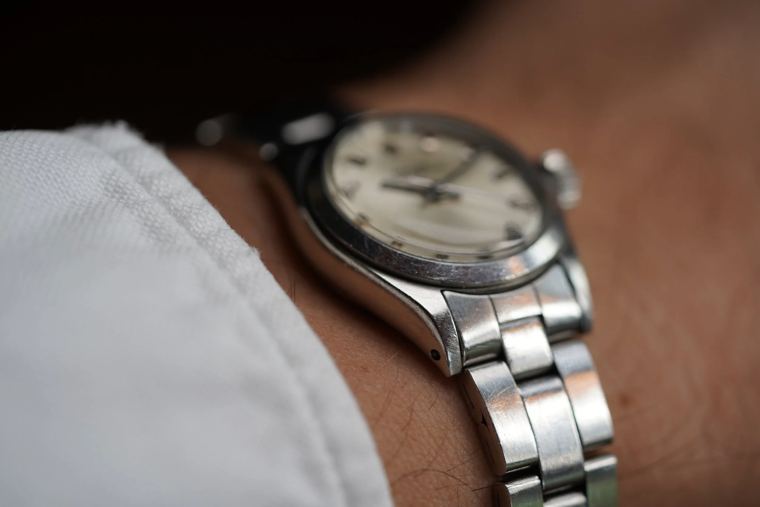 This Oyster Perpetual is a great stainless steel ladies watch. It measures approximately 25mm in diameter. The serial number dates the watch to circa 1970. It is paired on a folded link bracelet and features a silver dial. The watch is in great shape and appears to be unpolished.
