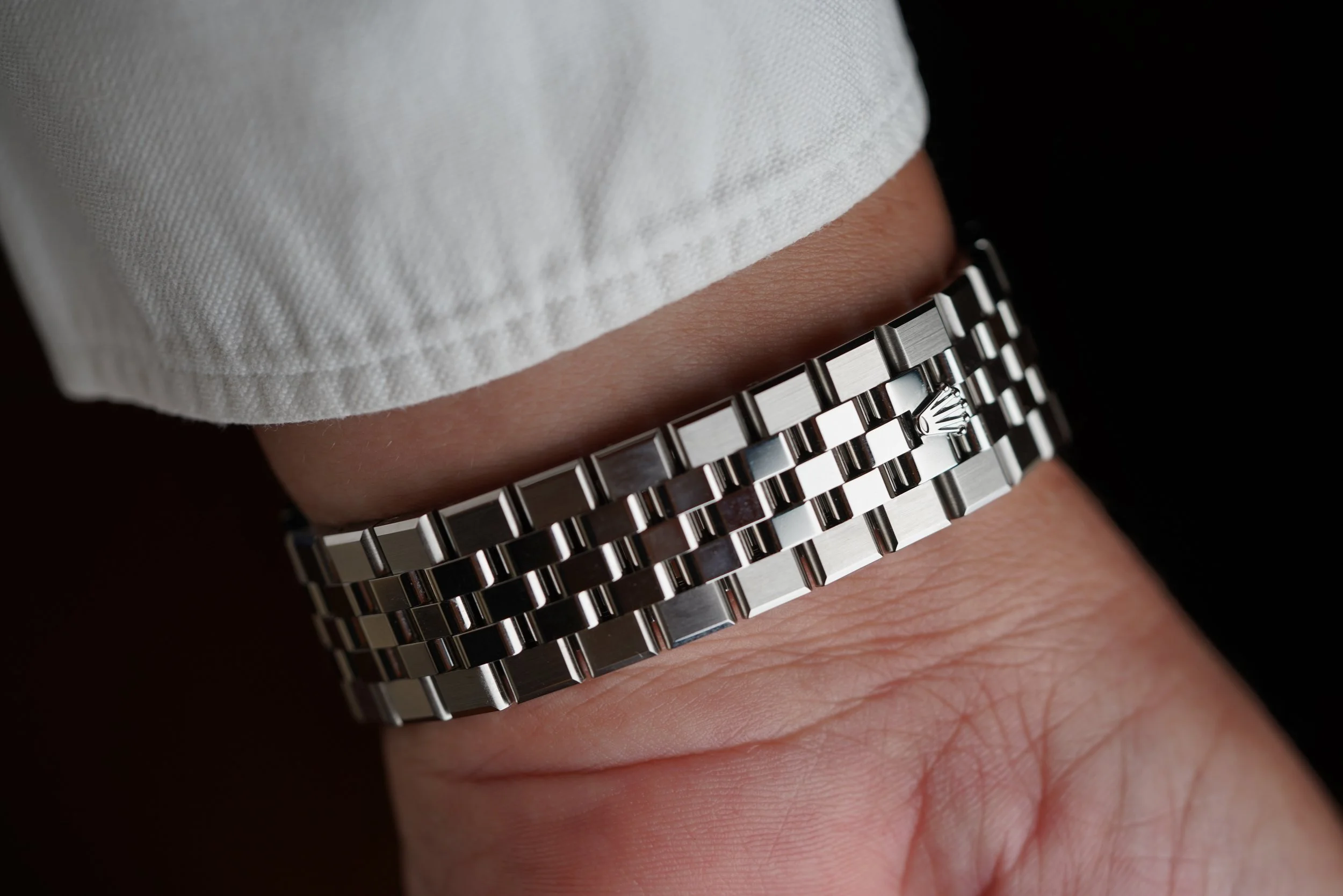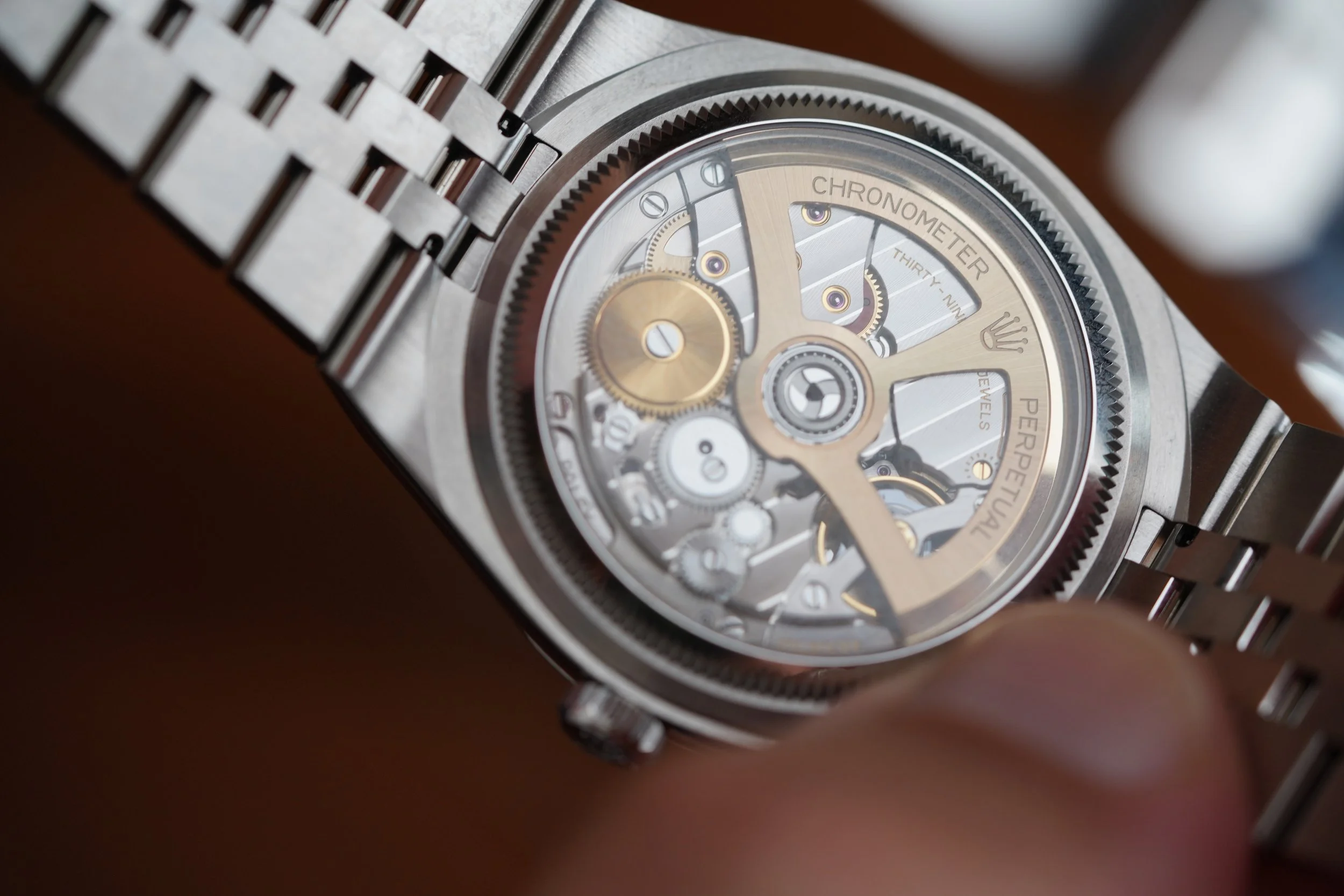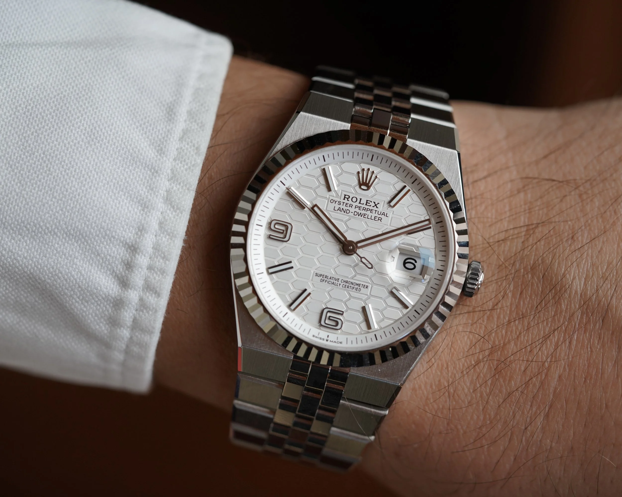 The Rolex Land-Dweller is a monumental new release from the manufacturer with design cues from the Oysterquartz Day-Date and Datejust. The reference 127334 is beautiful 40mm case with one of the most comfortable bracelets. The watch is powered by the Rolex automatic calibre 7135 which is seen in the exhibition caseback. This example is unpolished. It features the beautiful honeycomb dial motif, and the 6 and 9 numerals inspired by the 1950s Rolex dials.