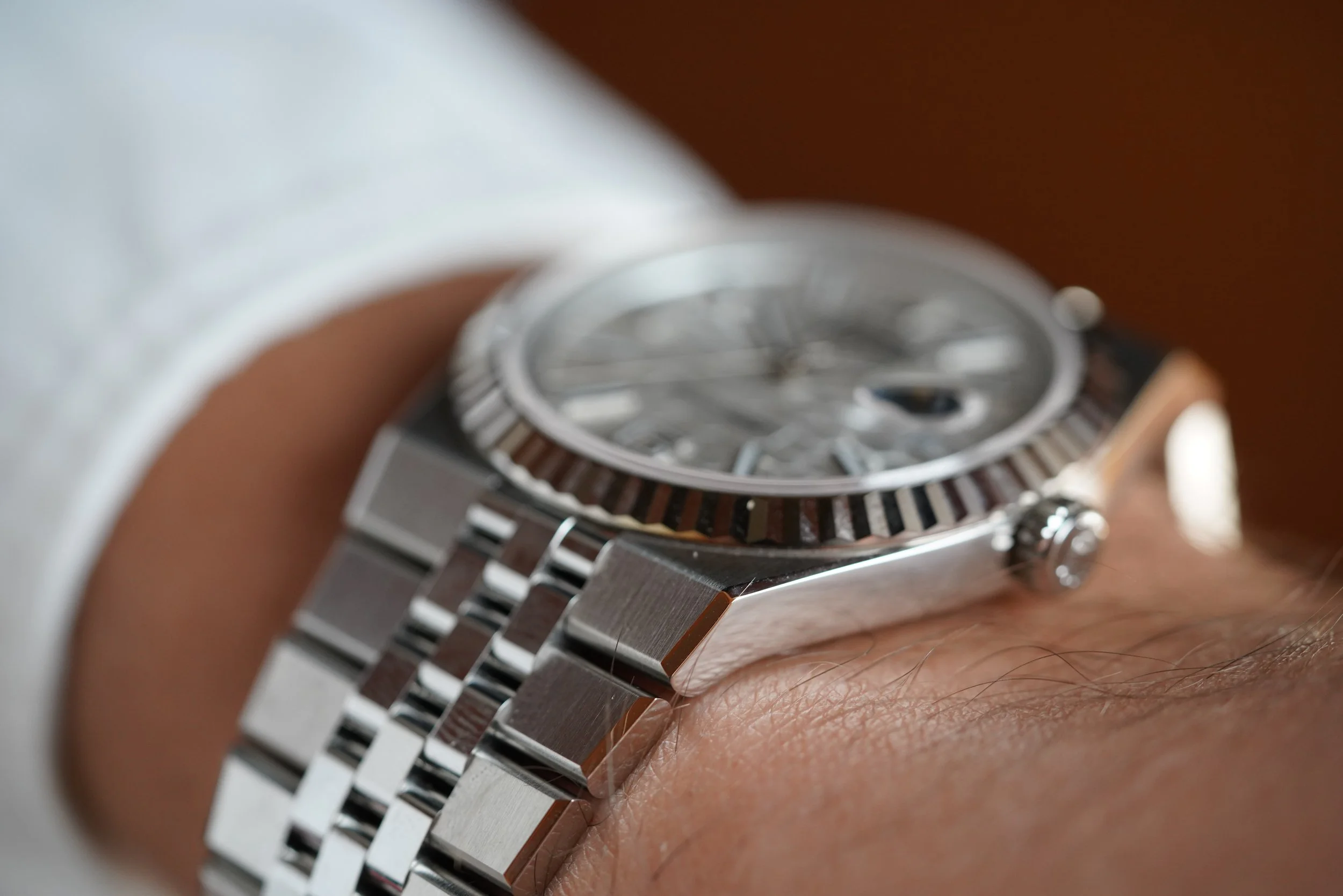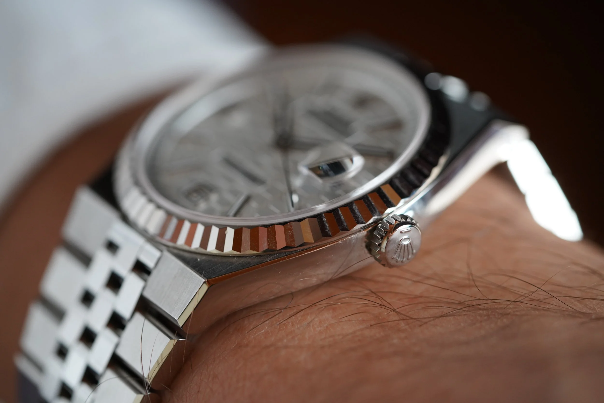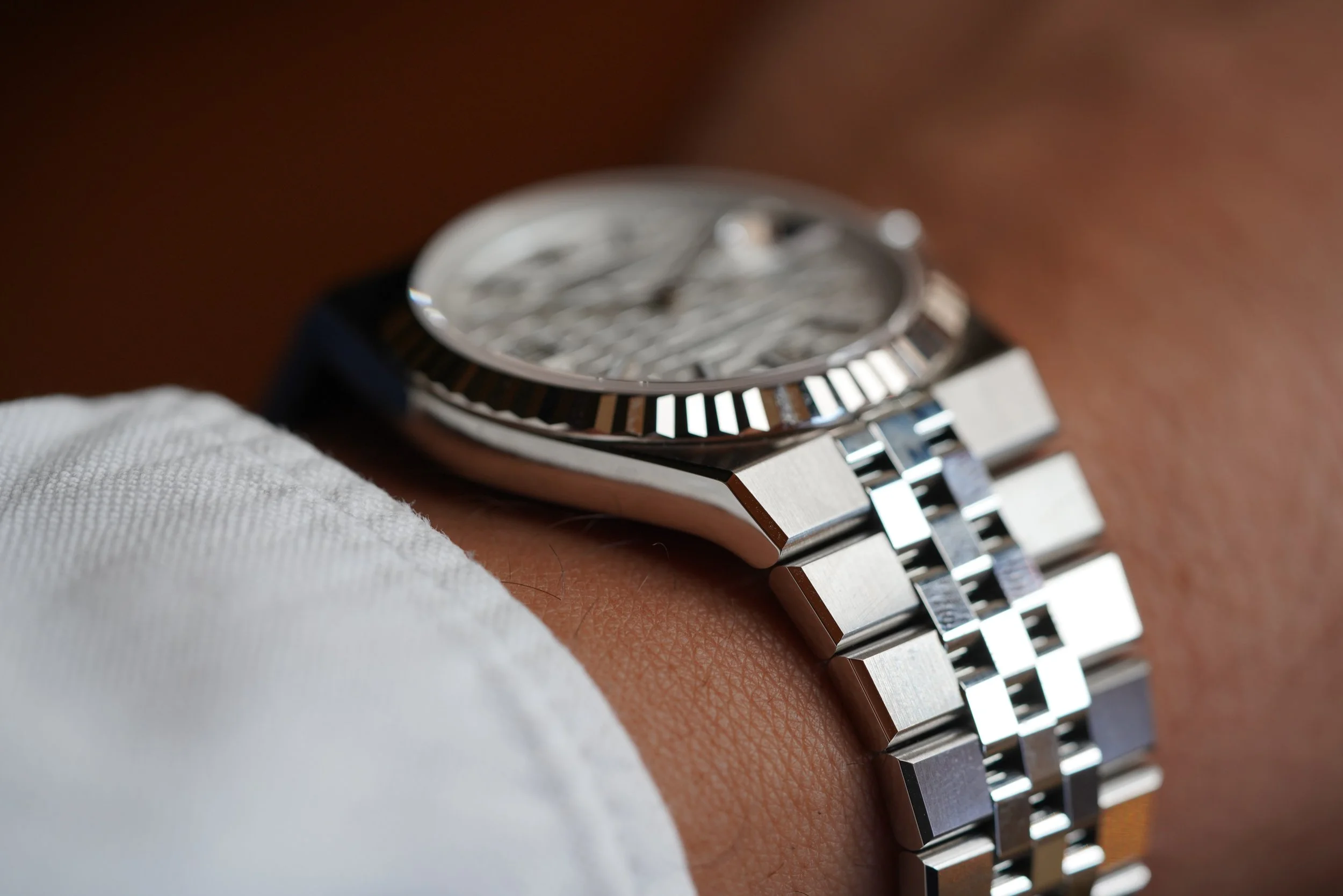 The Rolex Land-Dweller is a monumental new release from the manufacturer with design cues from the Oysterquartz Day-Date and Datejust. The reference 127334 is beautiful 40mm case with one of the most comfortable bracelets. The watch is powered by the Rolex automatic calibre 7135 which is seen in the exhibition caseback. This example is unpolished. It features the beautiful honeycomb dial motif, and the 6 and 9 numerals inspired by the 1950s Rolex dials.