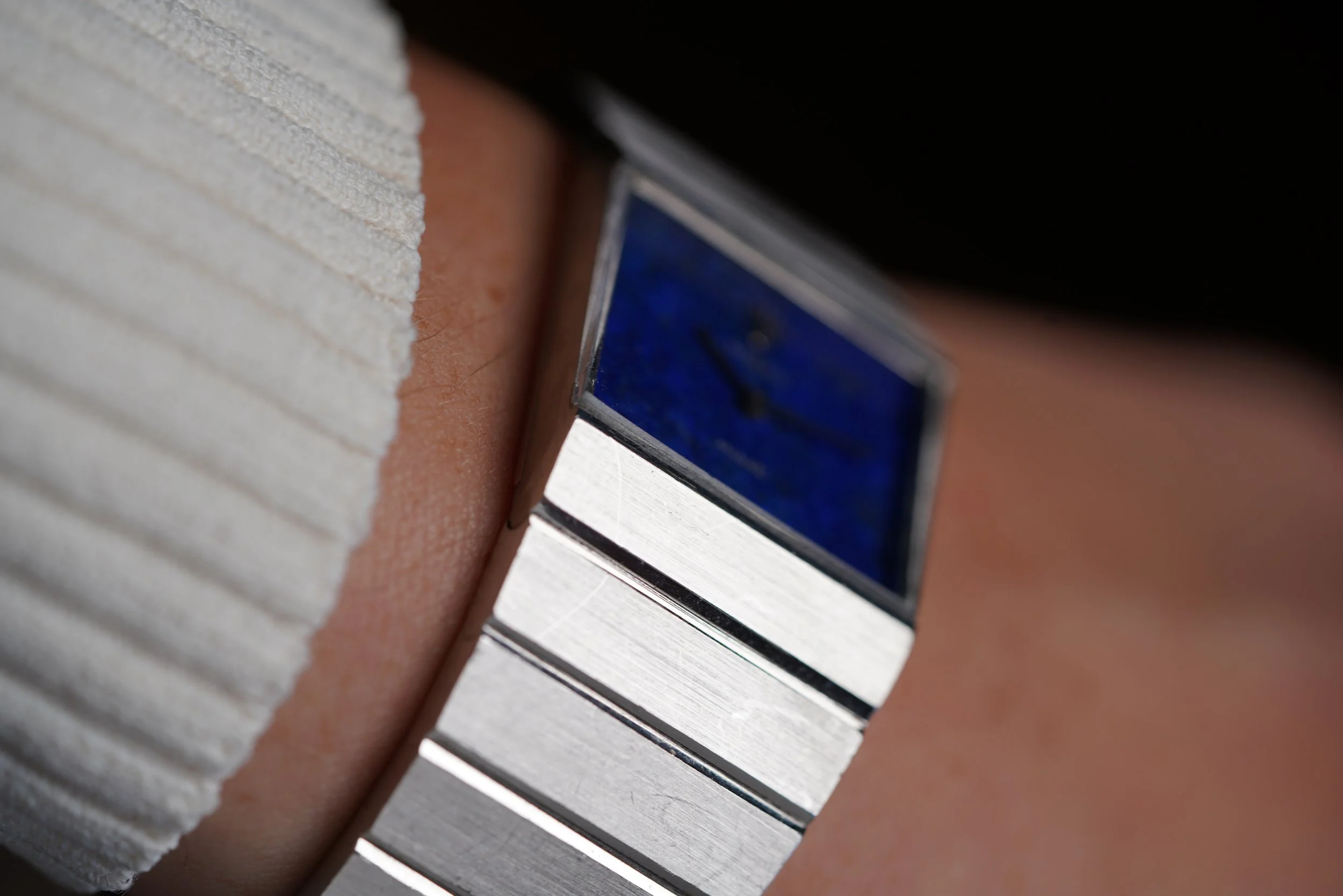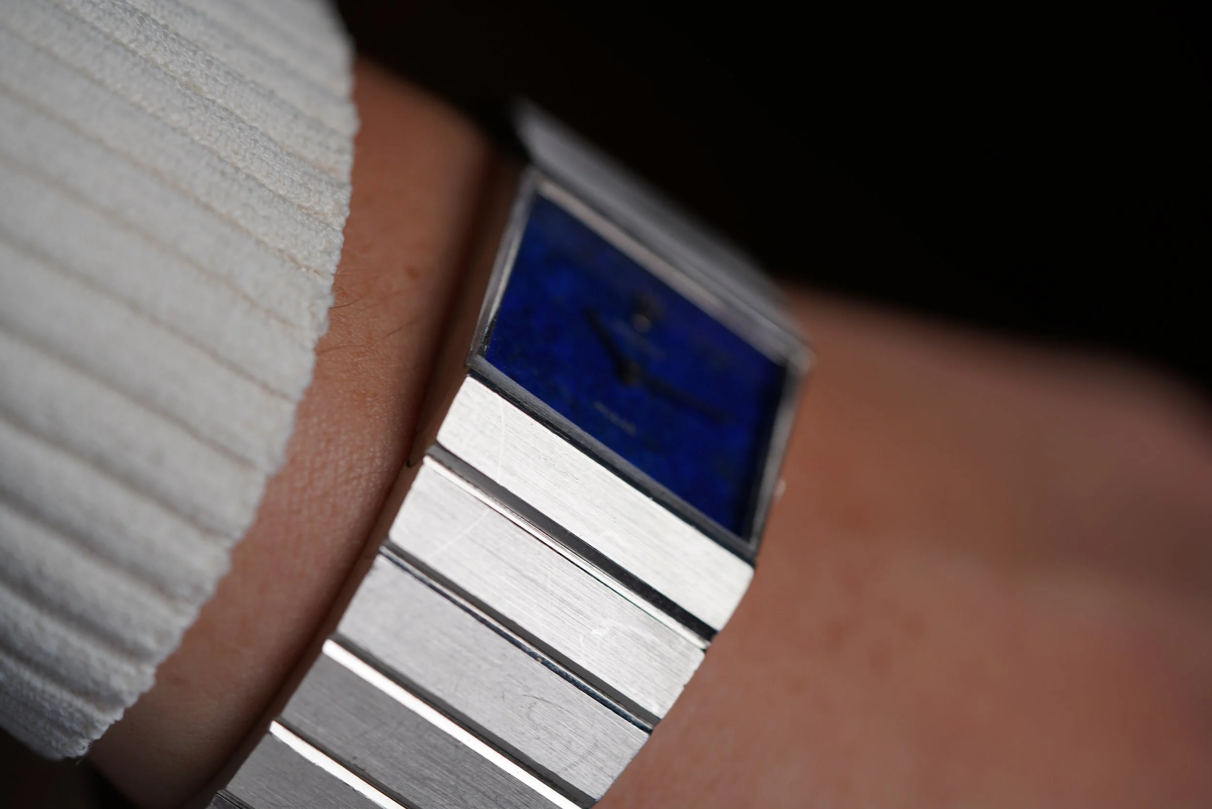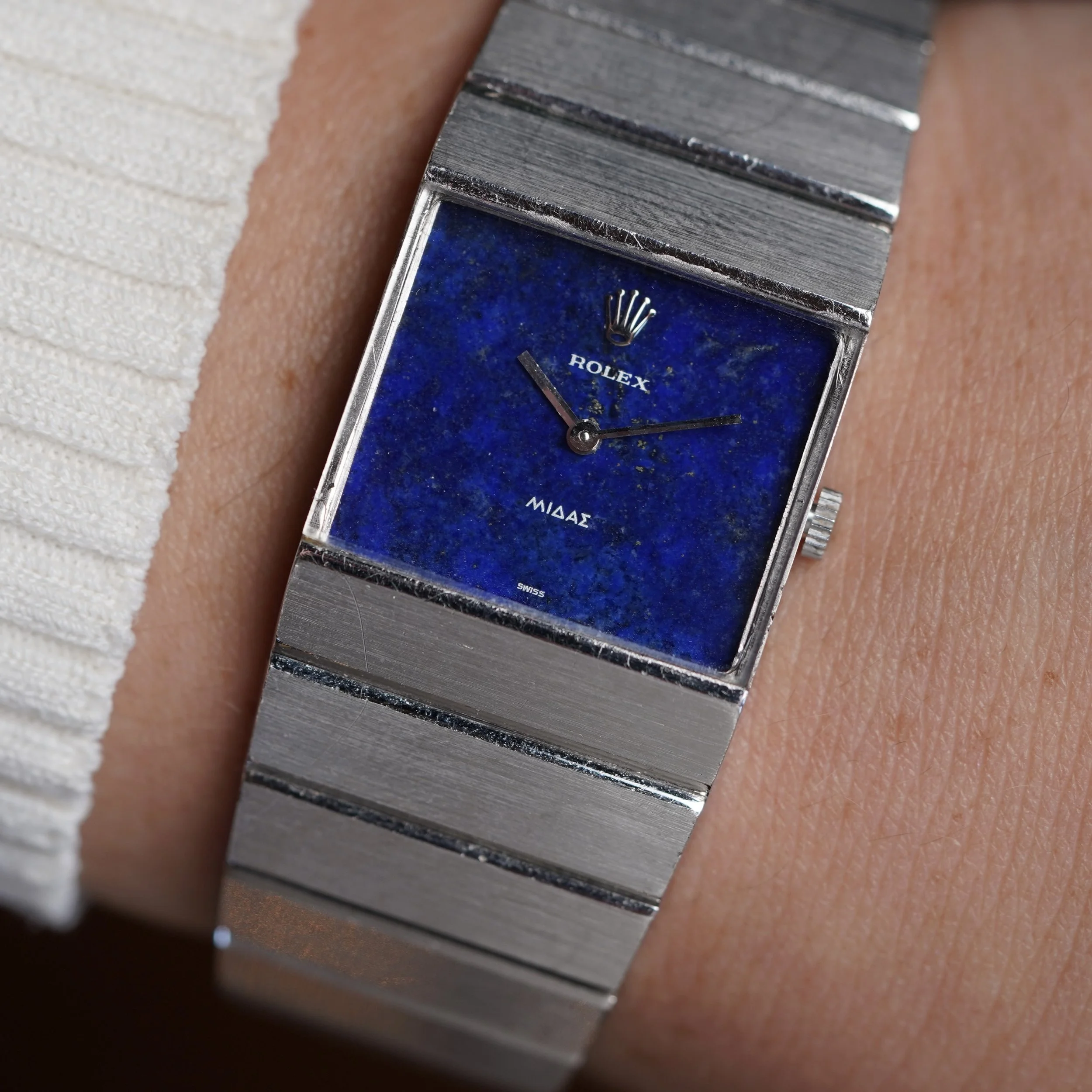 This Rolex Midas reference 4314 is an incredible and stylish timepiece. It features an extremely rare lapis lazuli dial. These dials are very special and highly admired by collectors. The case is 18K white gold and appears to be unpolished. The bracelet fits a wrist up slightly over 6 inches. Additional links would need to be purchased and sourced by the next owner.