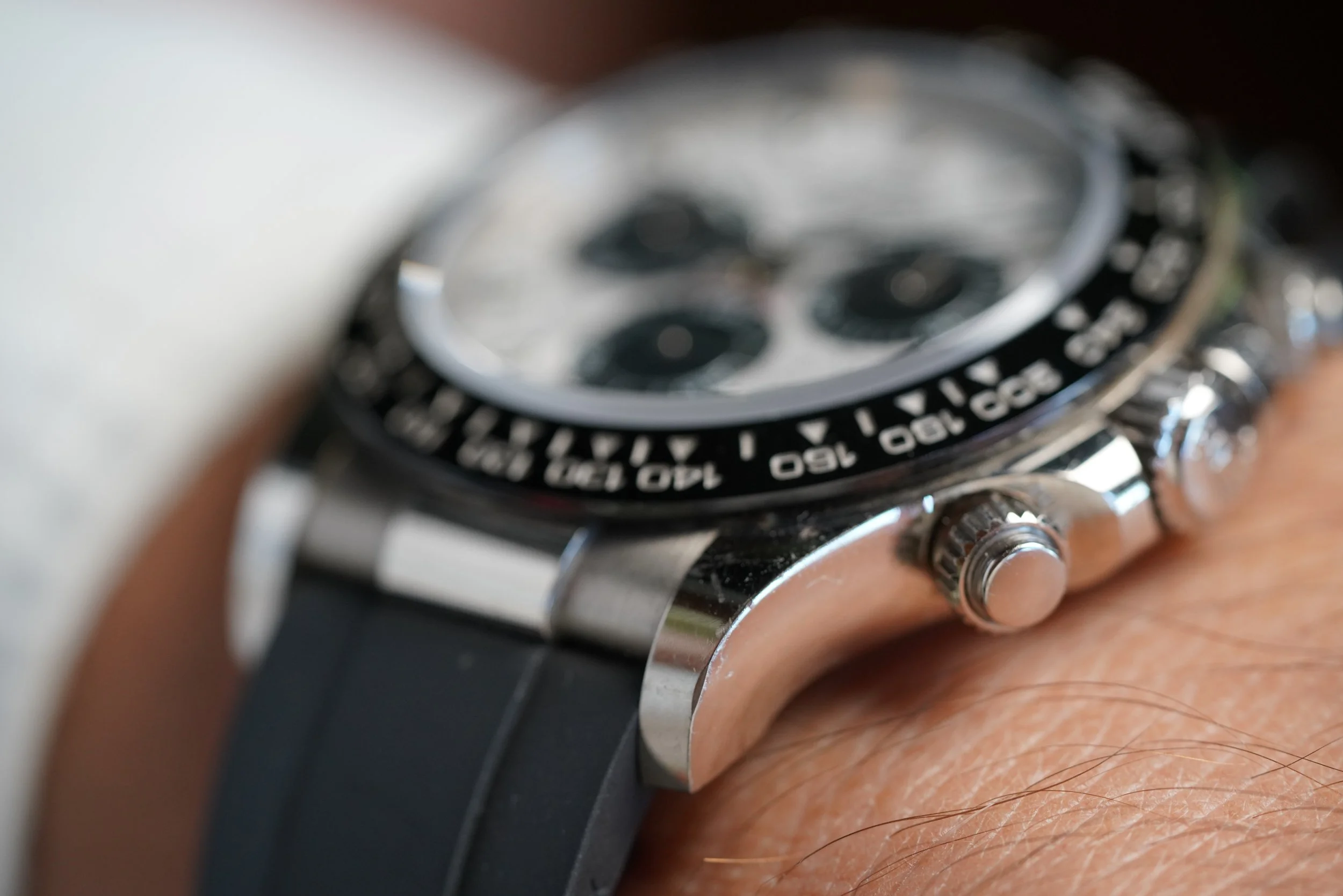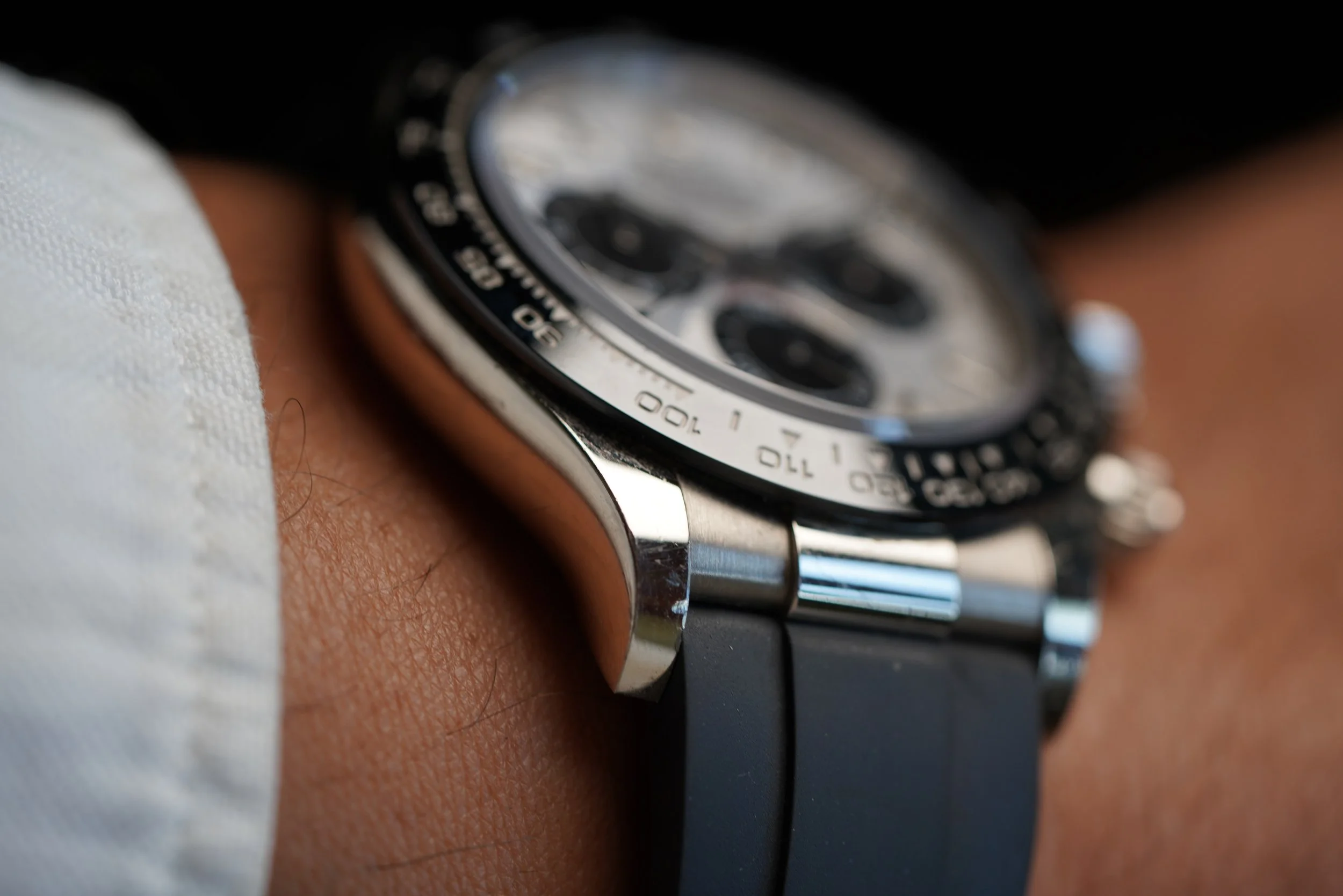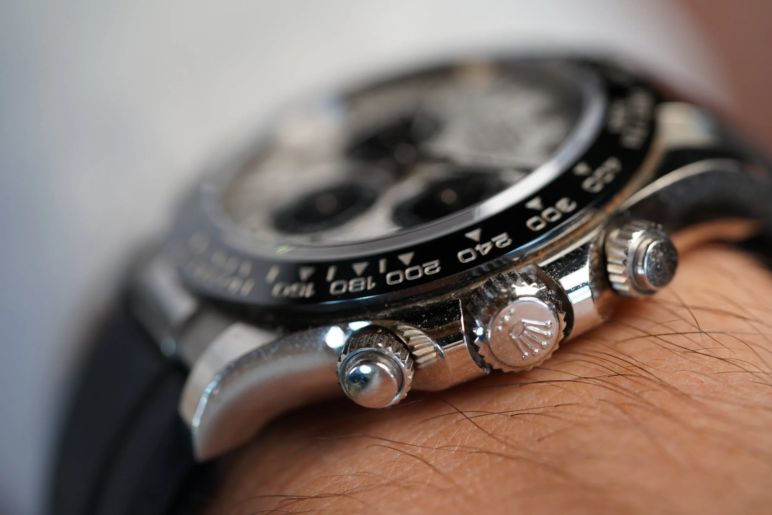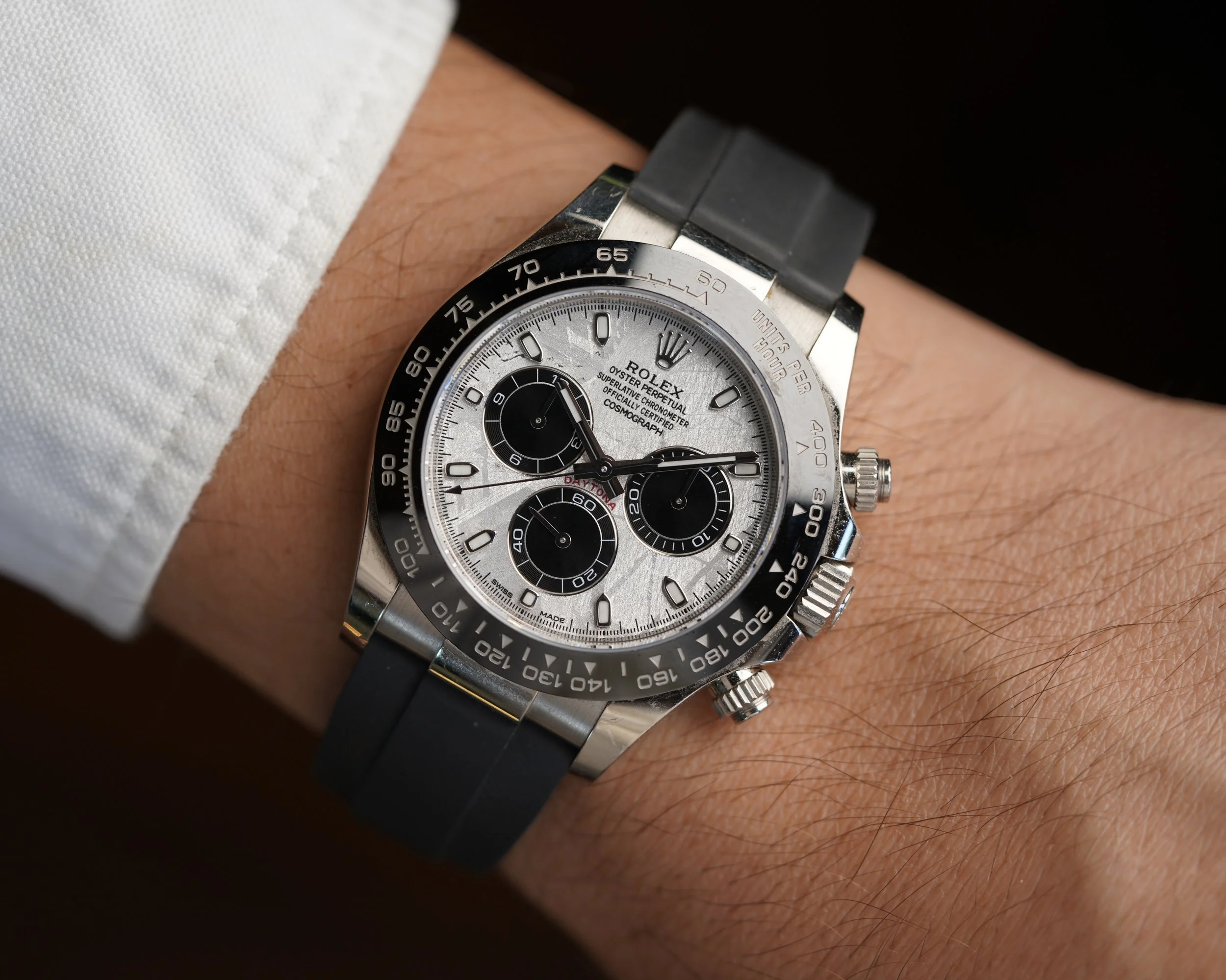 The Rolex Daytona Cosmograph reference 116519LN with Meteorite dial is a fantastic iteration of the iconic sports watch. It is paired on its original Oysterflex band suited to be worn in all active situations.