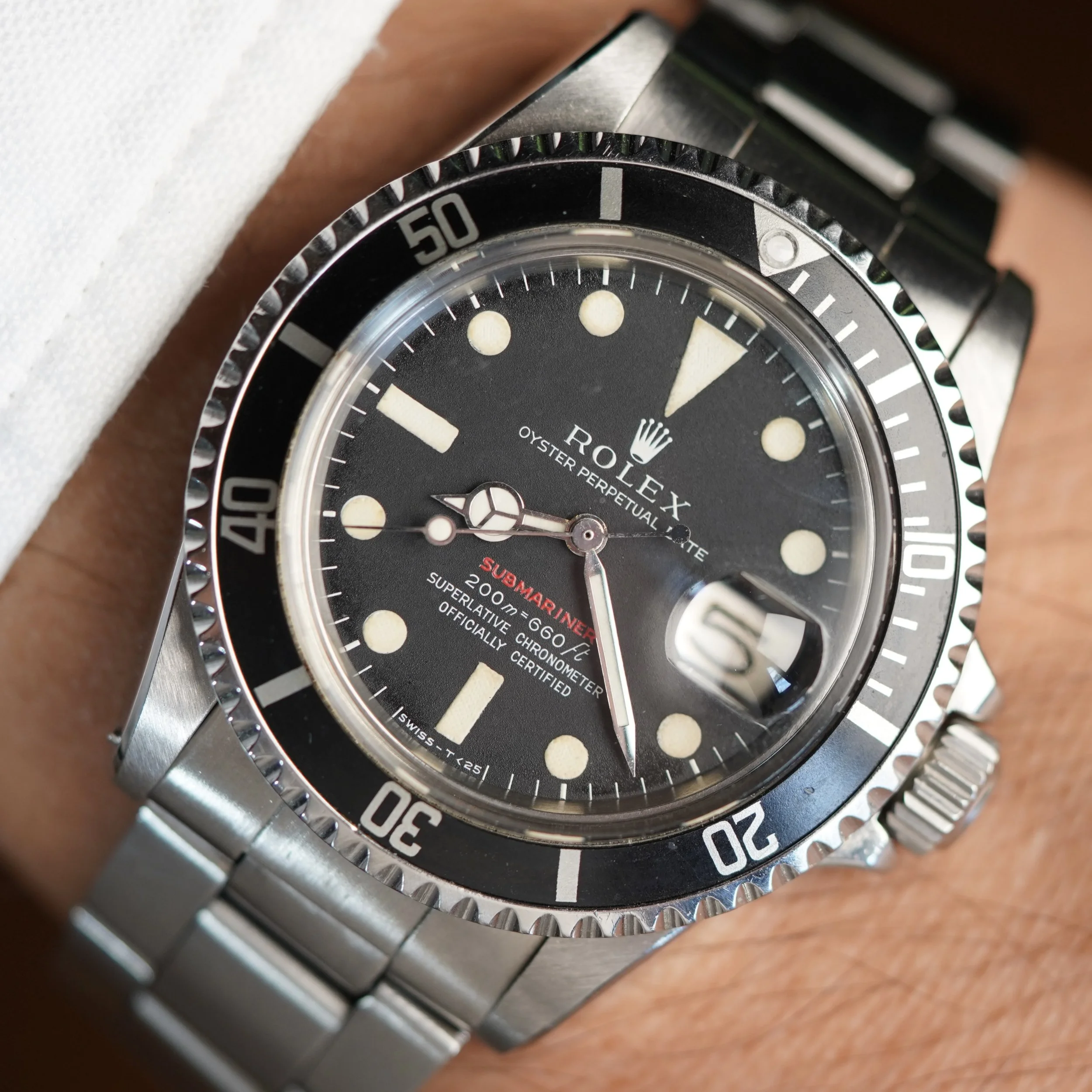 This Rolex Submariner reference 1680 is an attractive example. It is a fantastic sports watch dating to circa 1973 with a 3.40M serial. It is an incredible Red Sub! The case appears to be unpolished. The dial, minute and hour hand all have the original lume which is a superb color. It is paired on a firm 9315 bracelet dating to