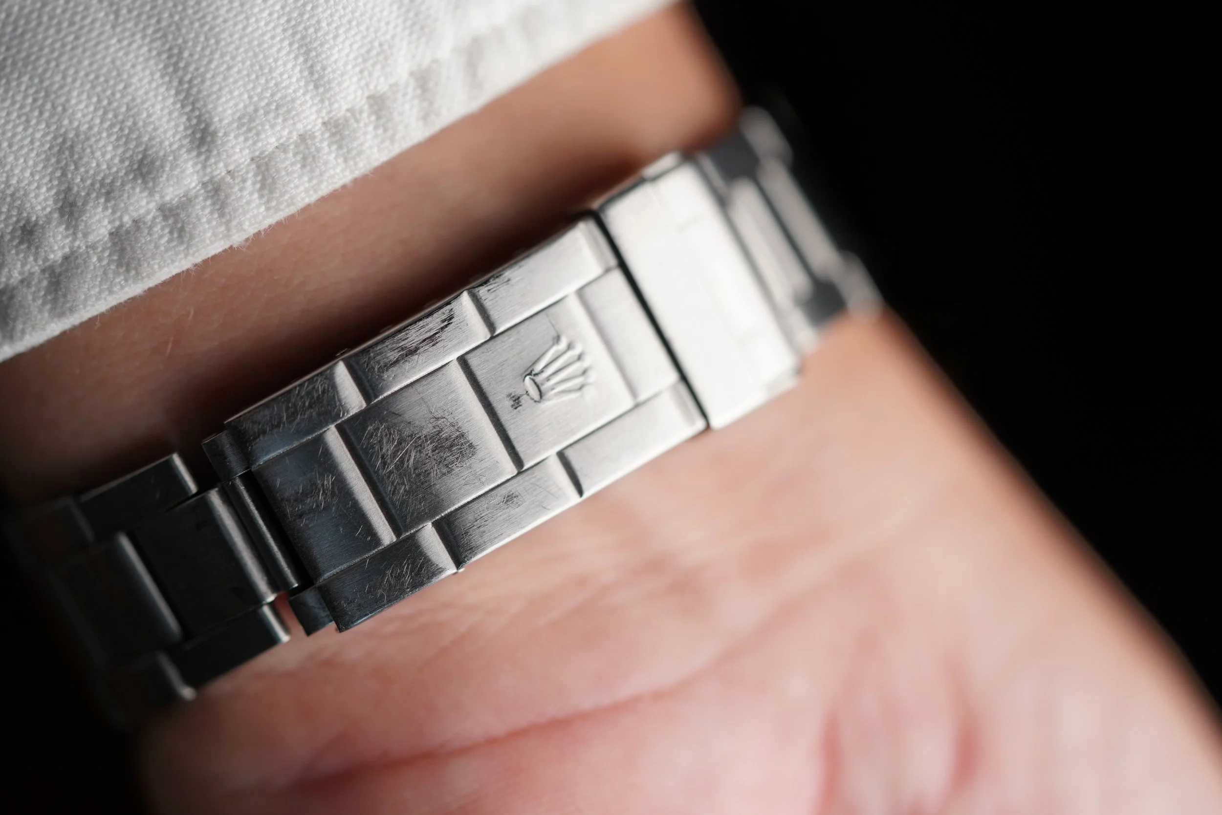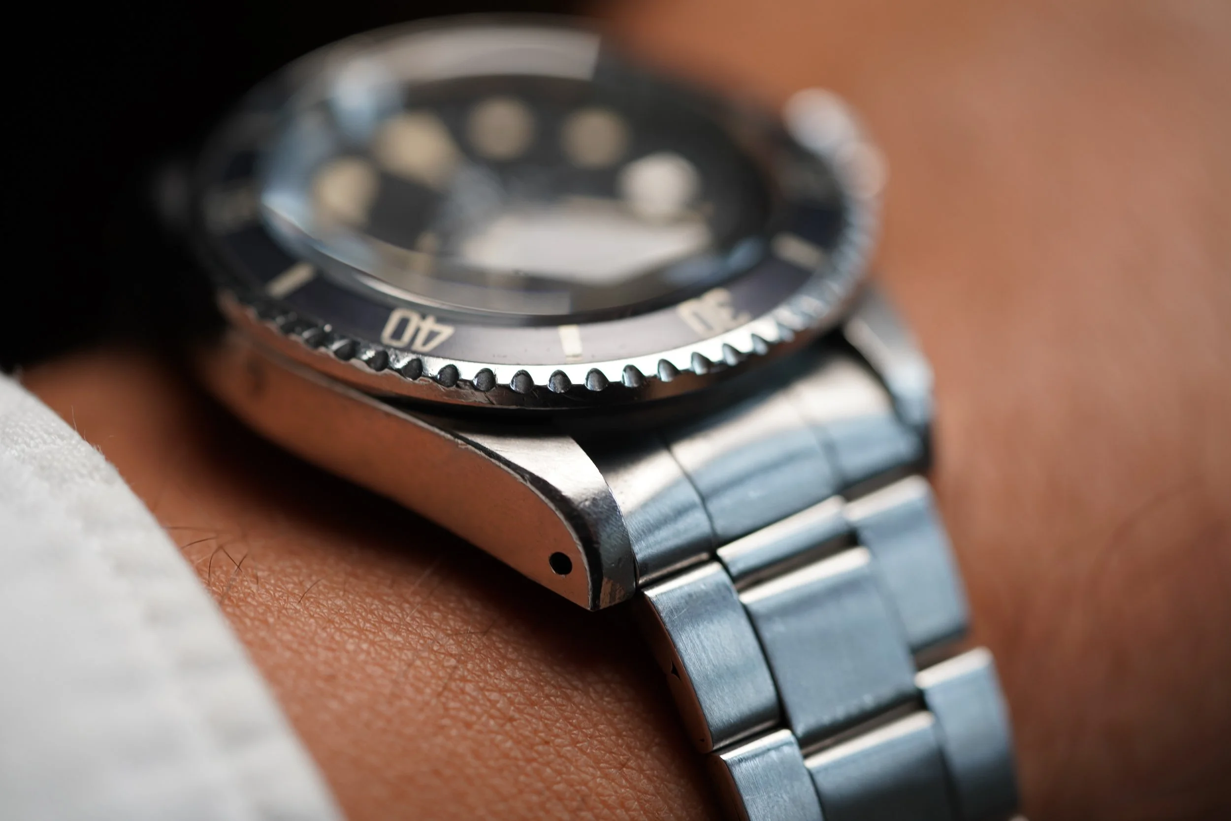 This watch features a 4.05 million serial dating to circa 1975. The case appears to be unpolished. The watch measures 40mm in diameter. The aluminum bezel insert has faded to a beautiful dark grey color. This bezel insert looks really nice in contrast to the red font on the dial.