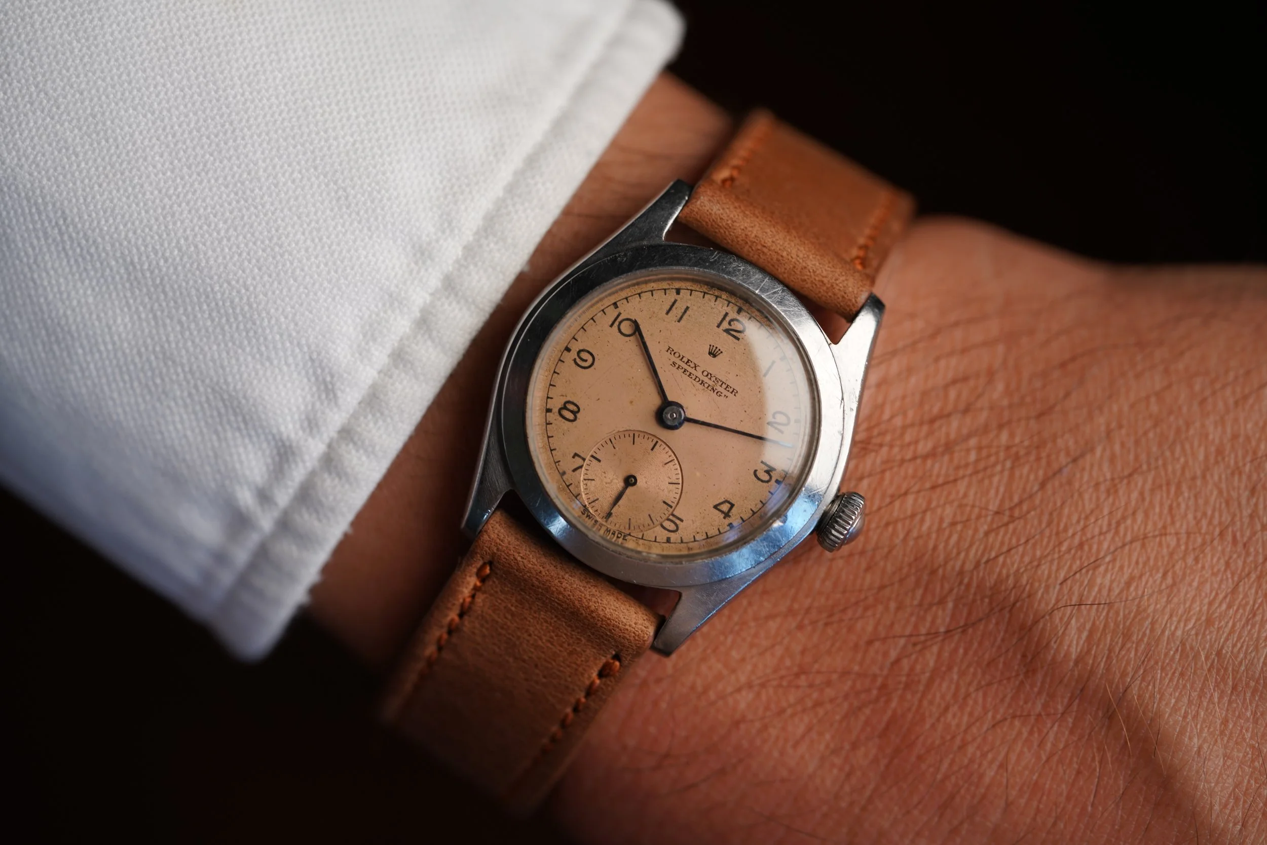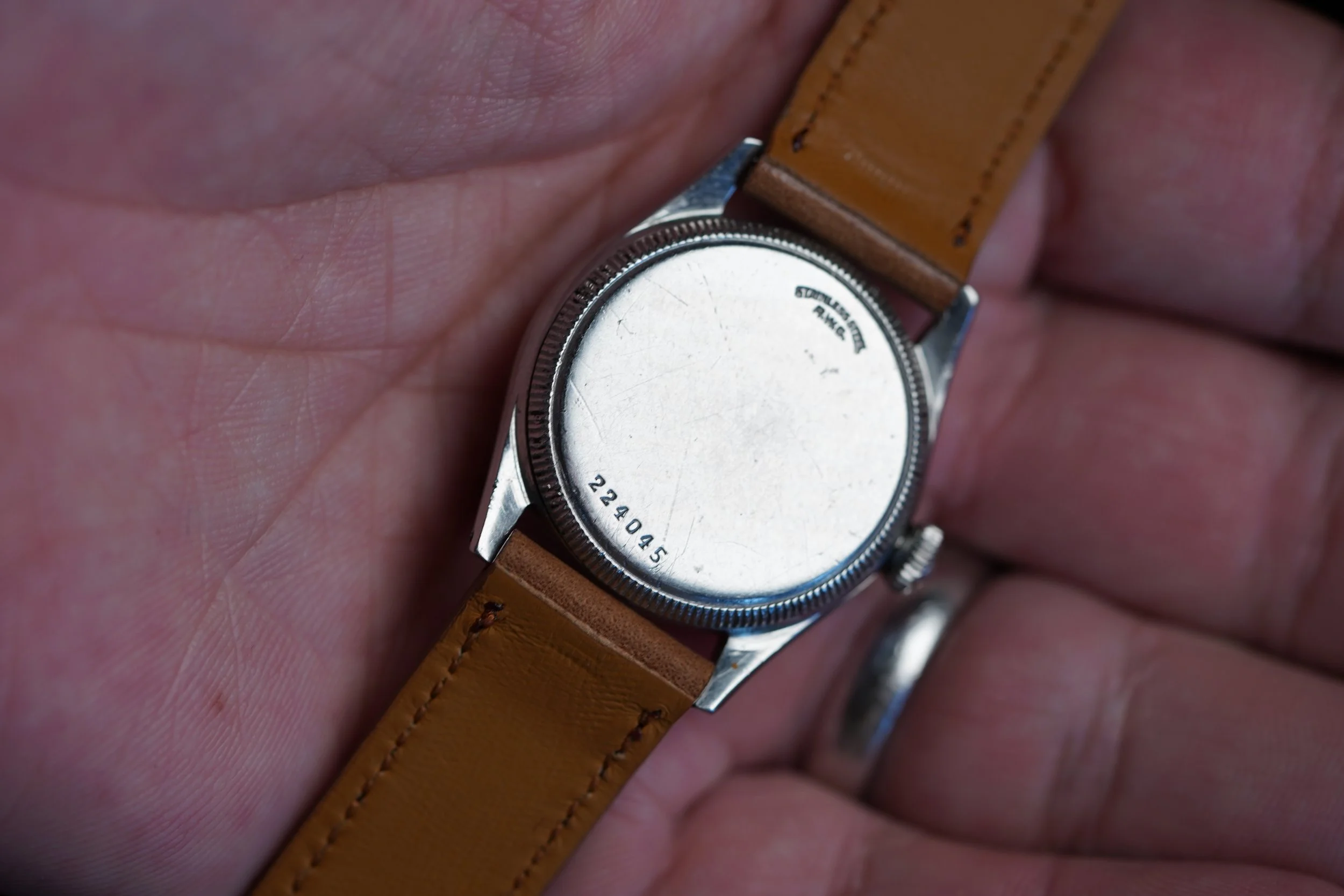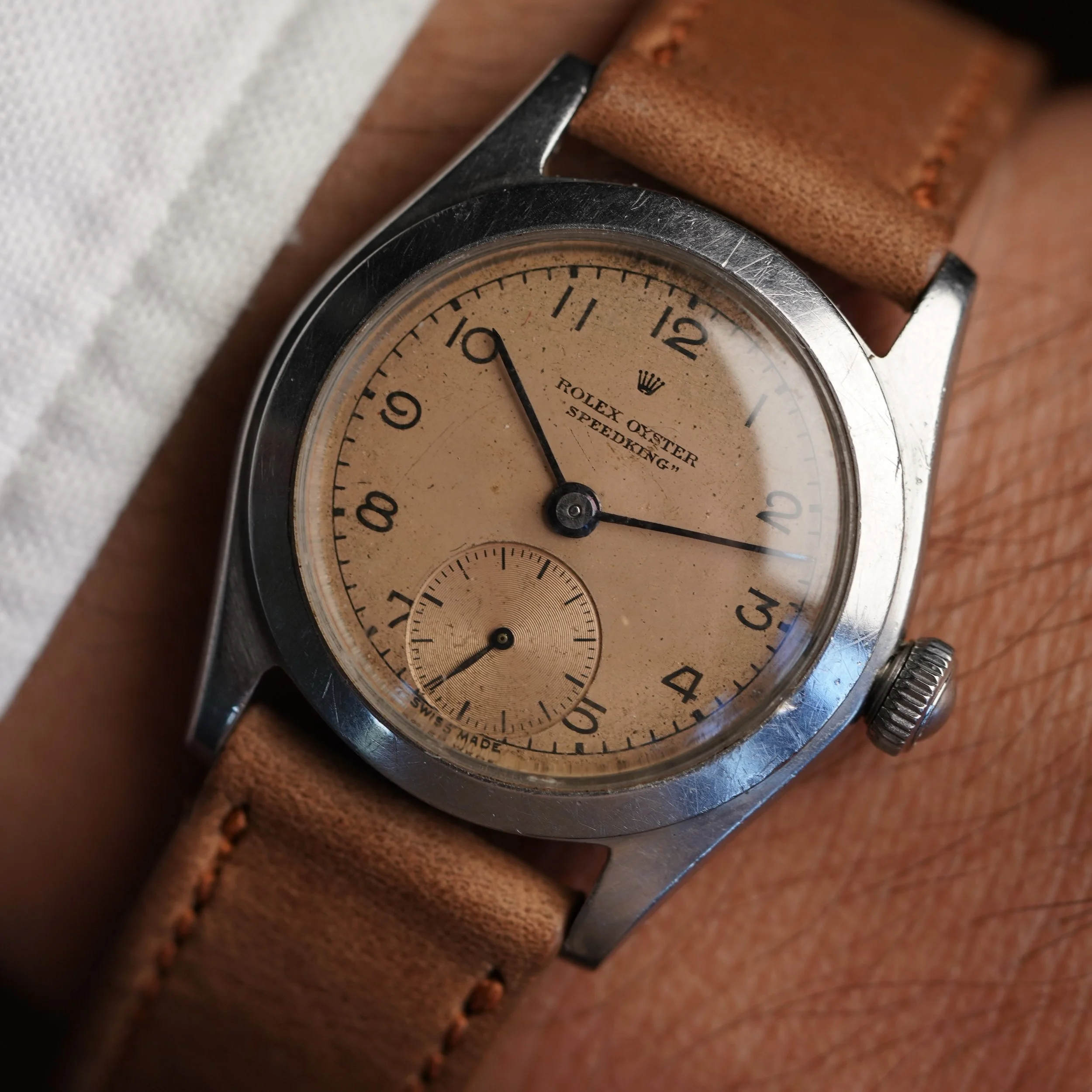 This Rolex Speedking is a super cool watch with non-luminous dial with Art-Deco painted numerals. The steel case measures approximately 30mm in diameter (36mm lug to lug). The case appears to be unpolished. It features a 224,XXX serial dating to circa 1943.