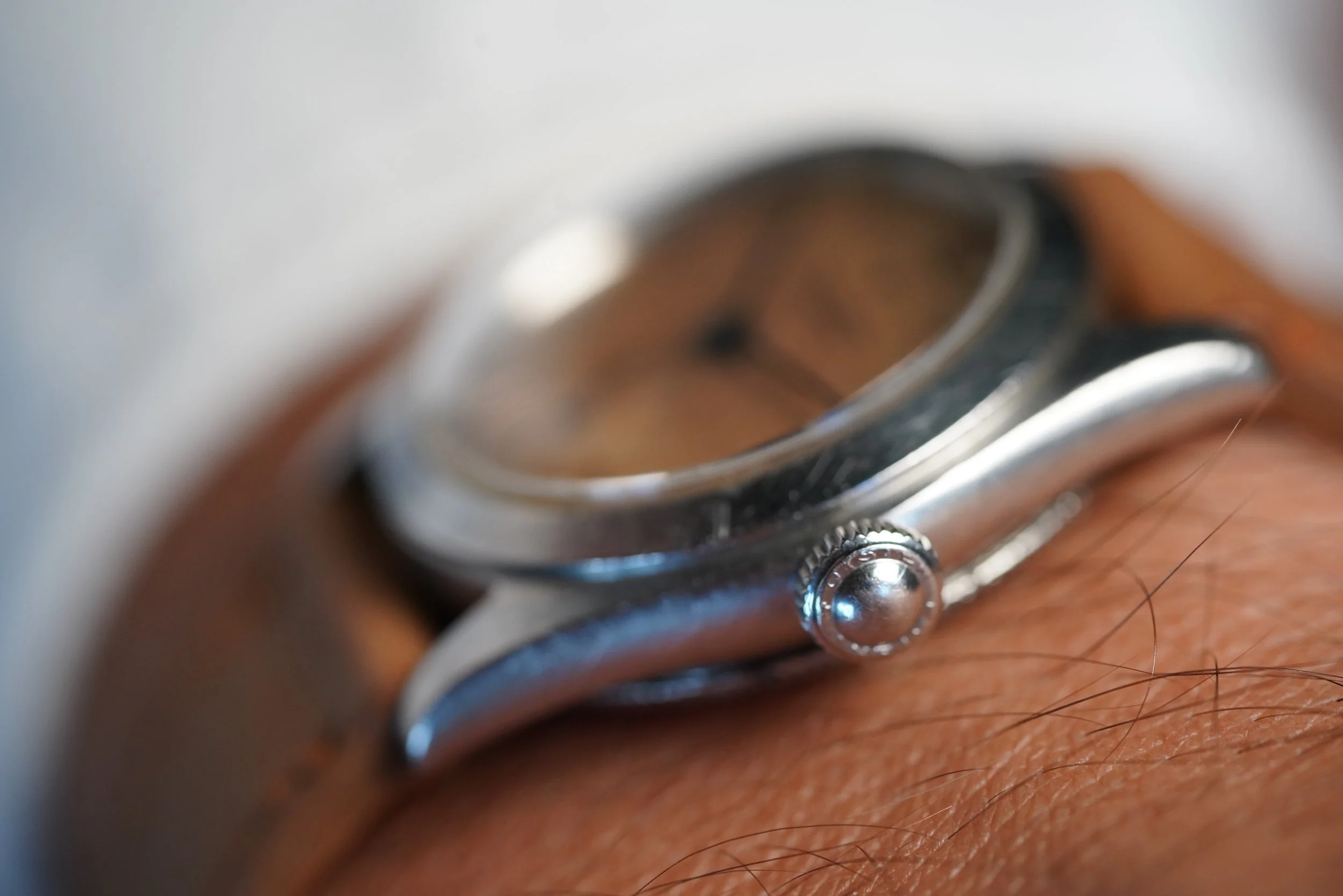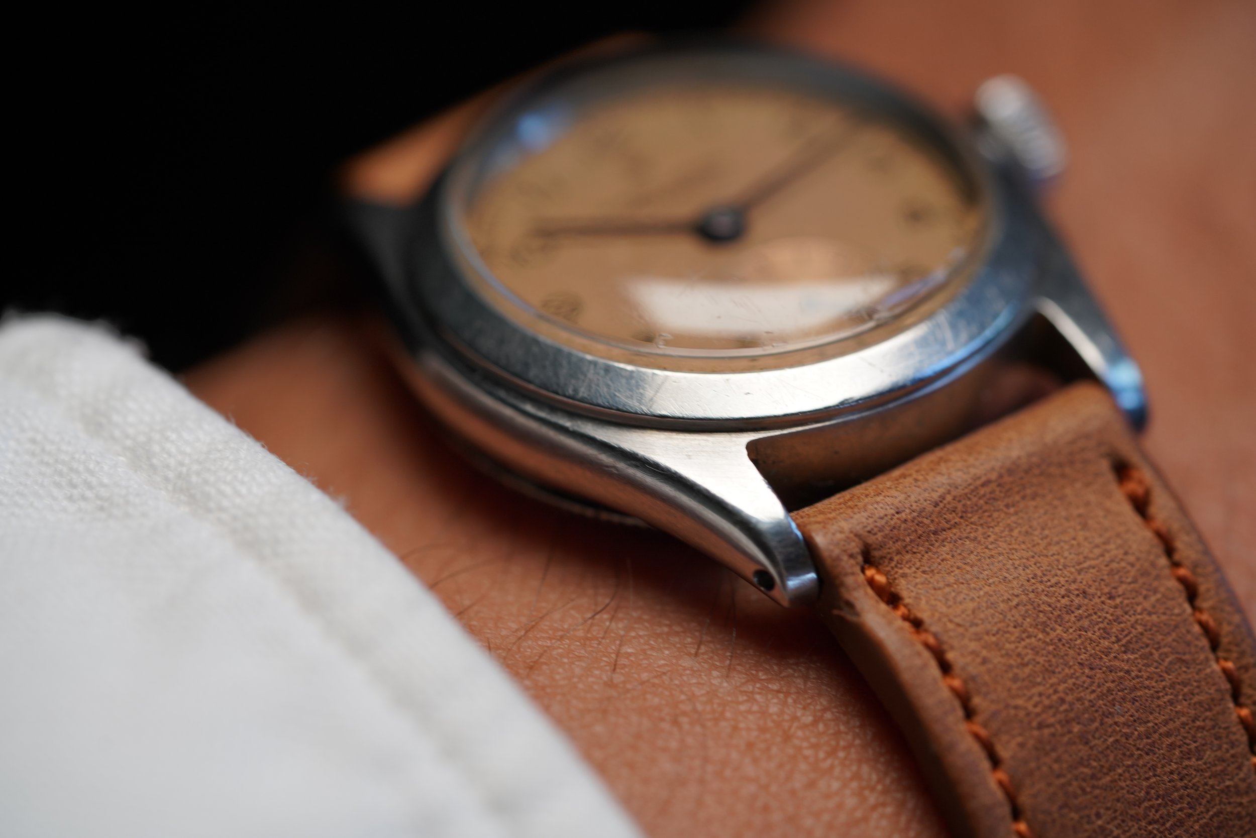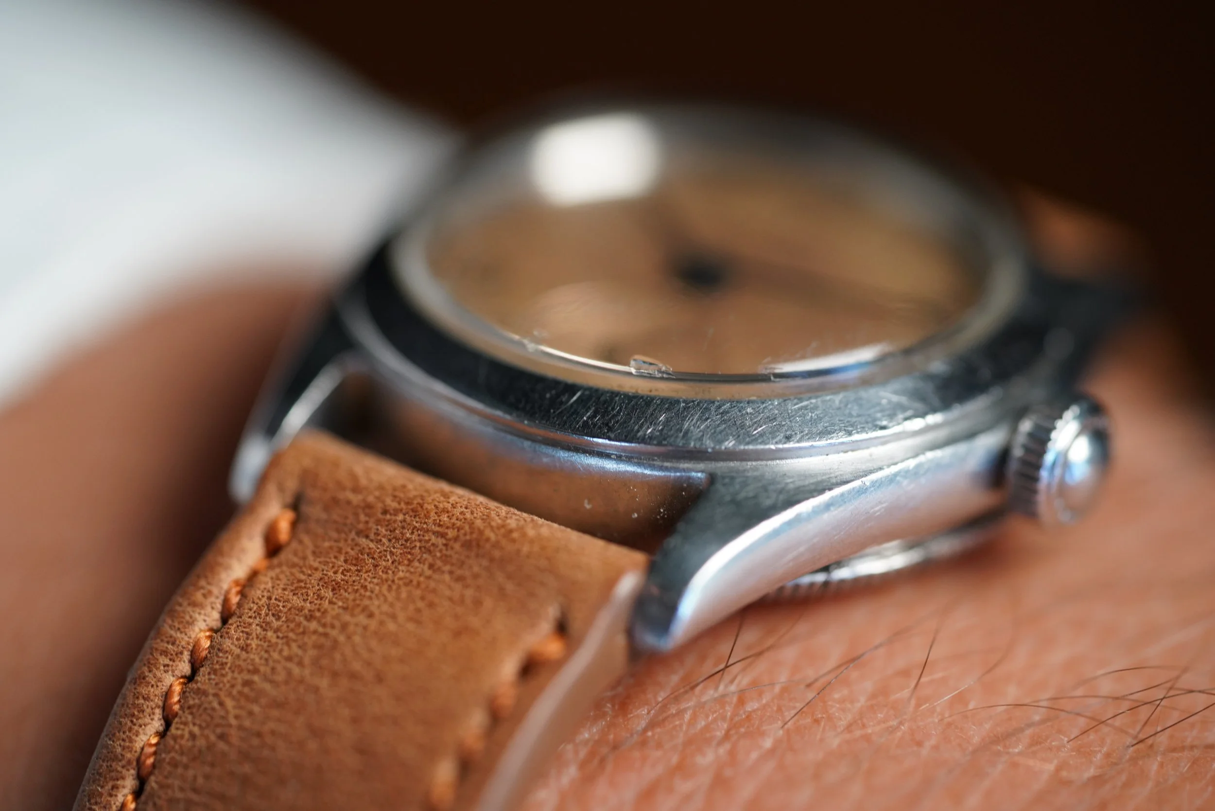 This Rolex Speedking is a super cool watch with non-luminous dial with Art-Deco painted numerals. The steel case measures approximately 30mm in diameter (36mm lug to lug). The case appears to be unpolished. It features a 224,XXX serial dating to circa 1943.