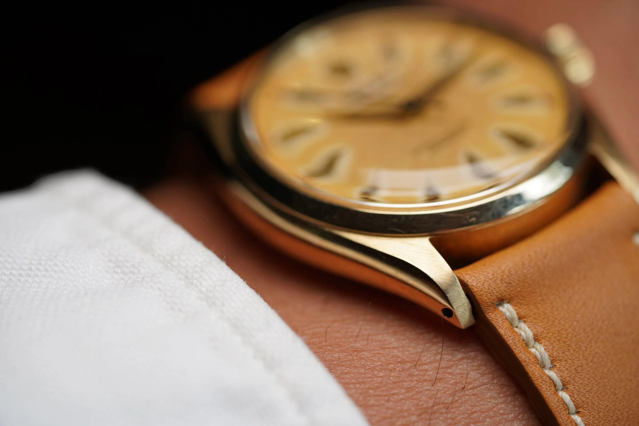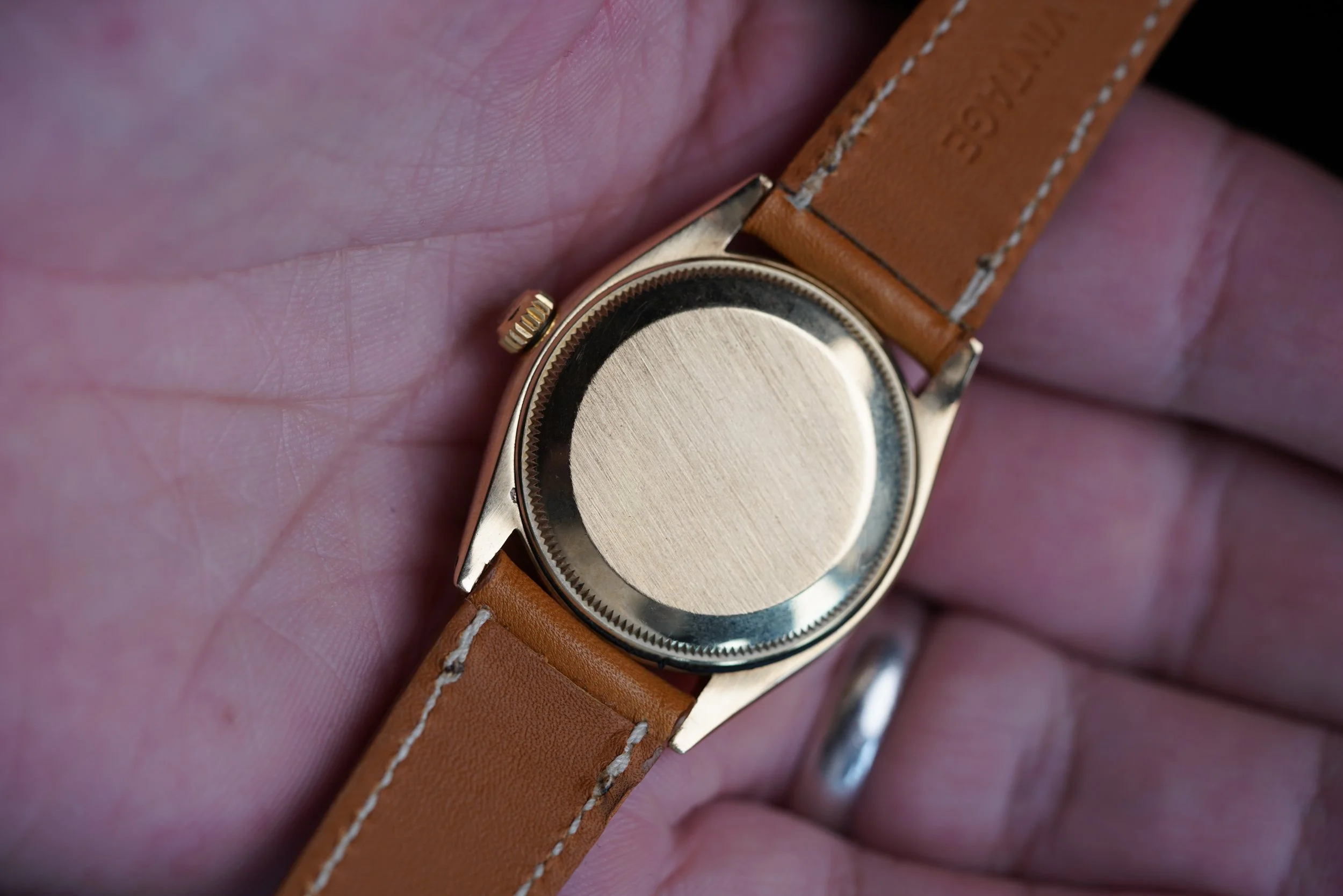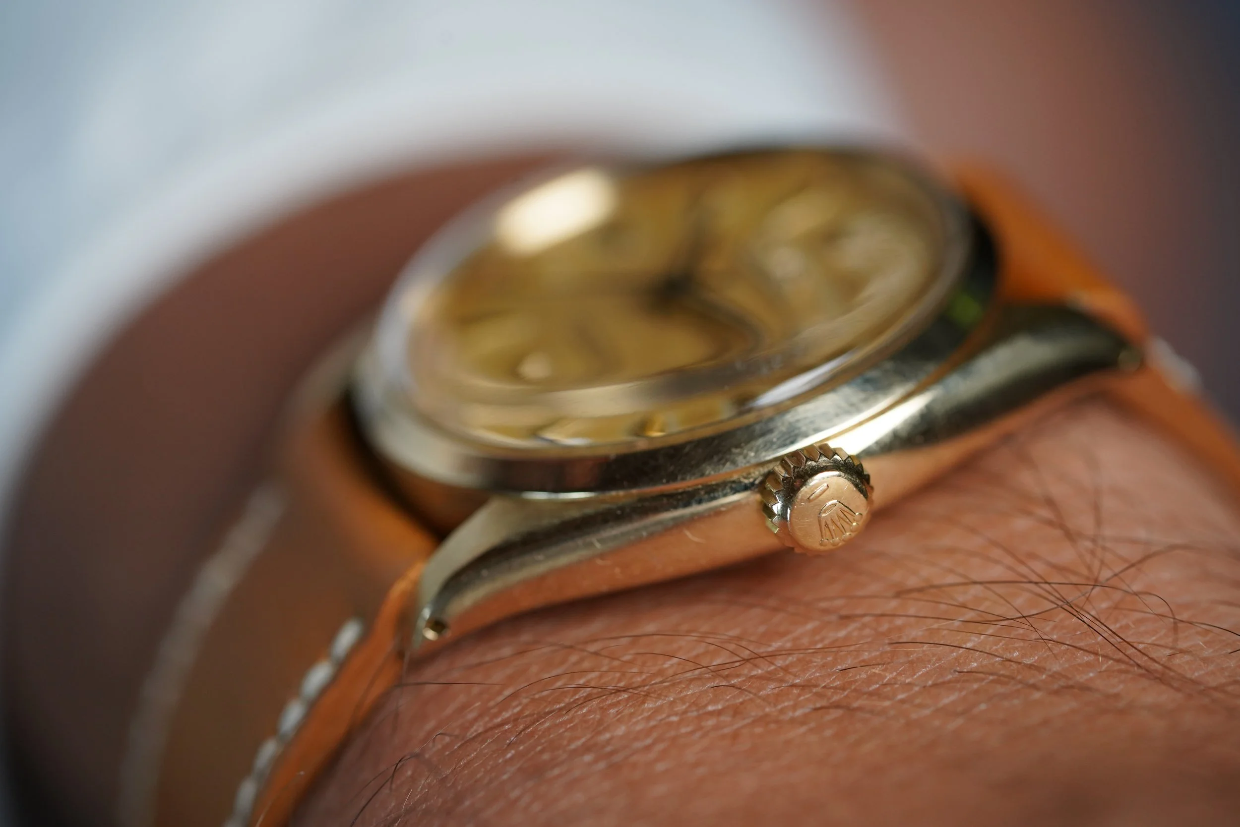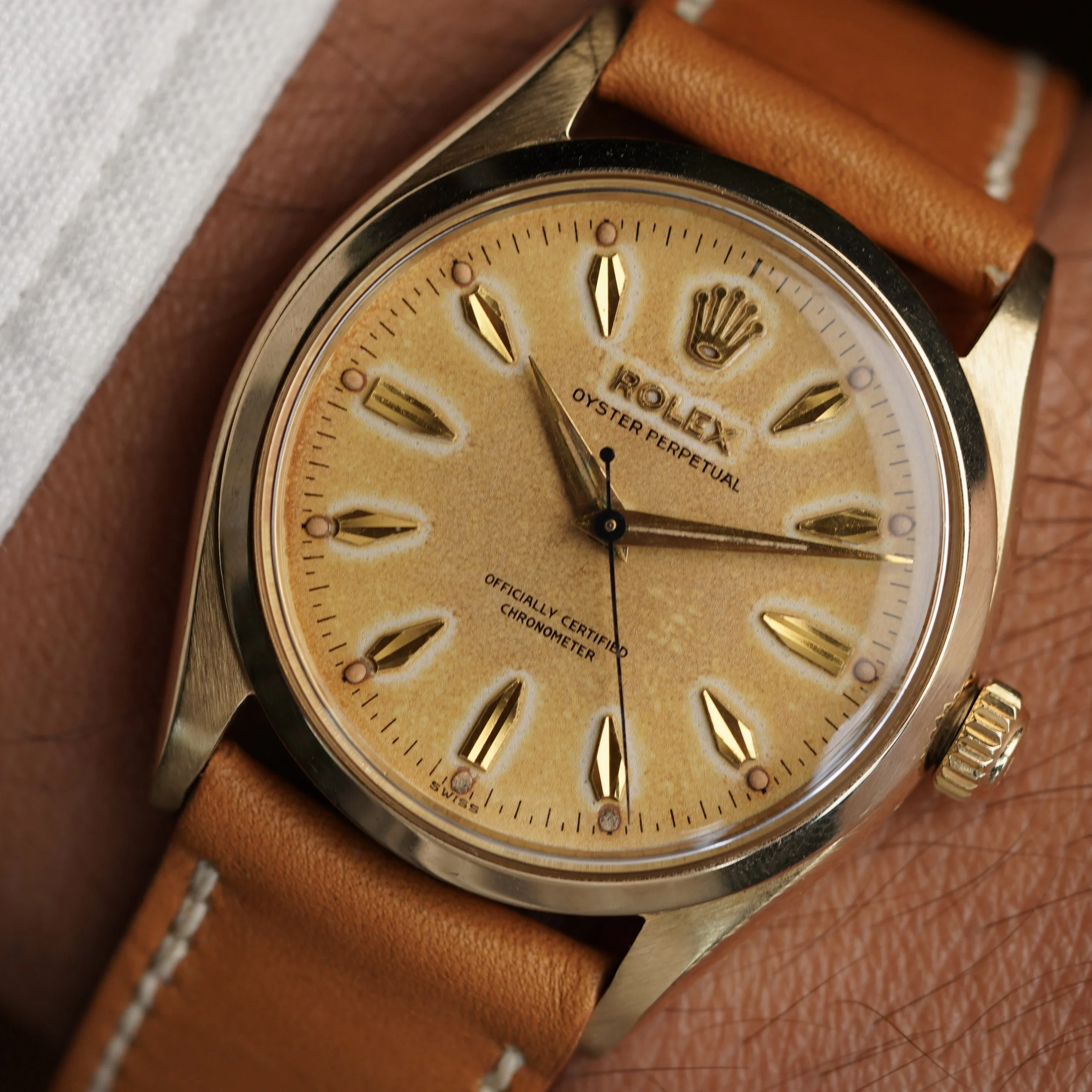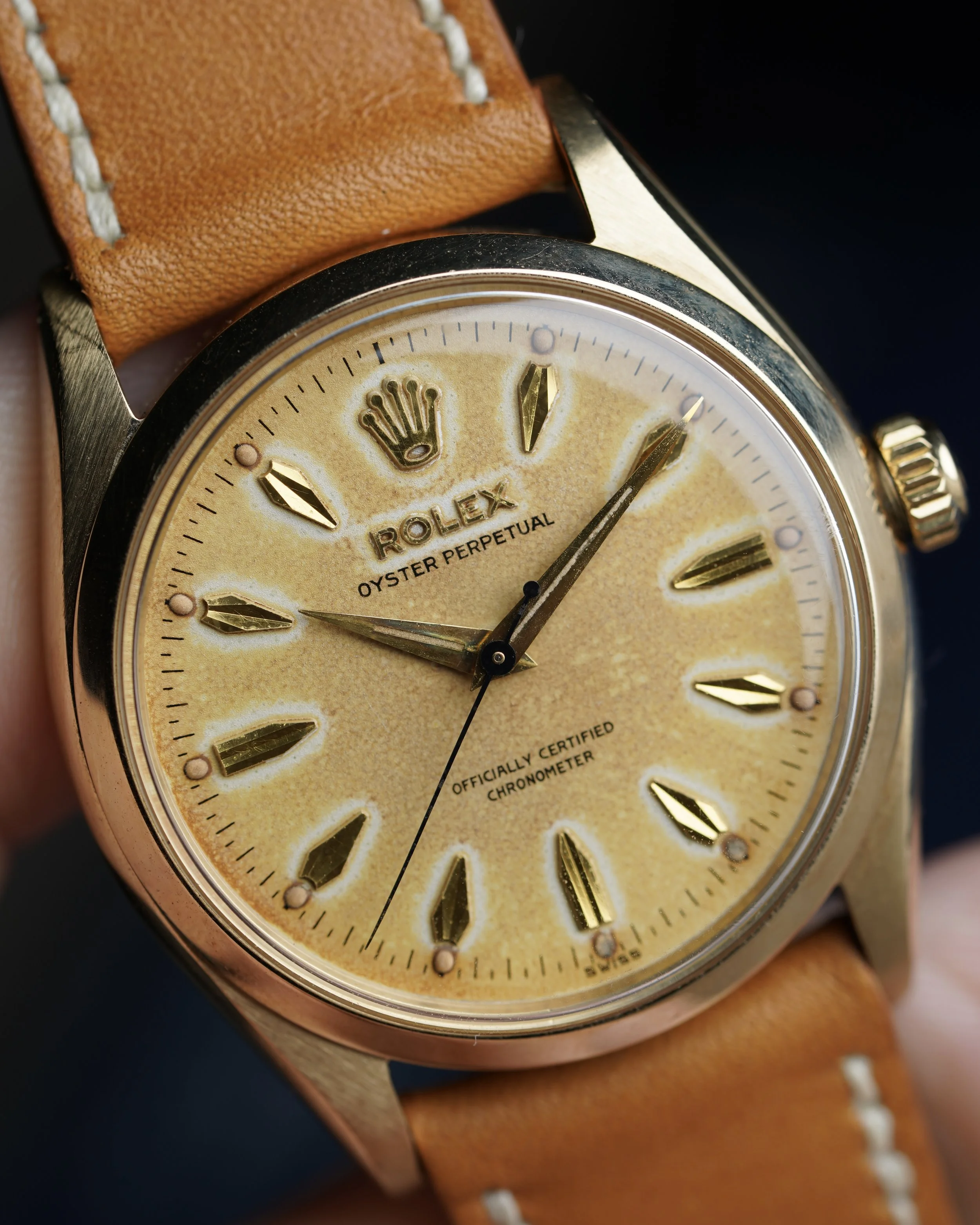 This Rolex Oyster Perpetual reference 6564 is super cool gold watch. The dial has developed a beautiful warm tropical color with white accents around the gold markers. The case is 14k yellow gold. The faceted markers are amazing on these models. T