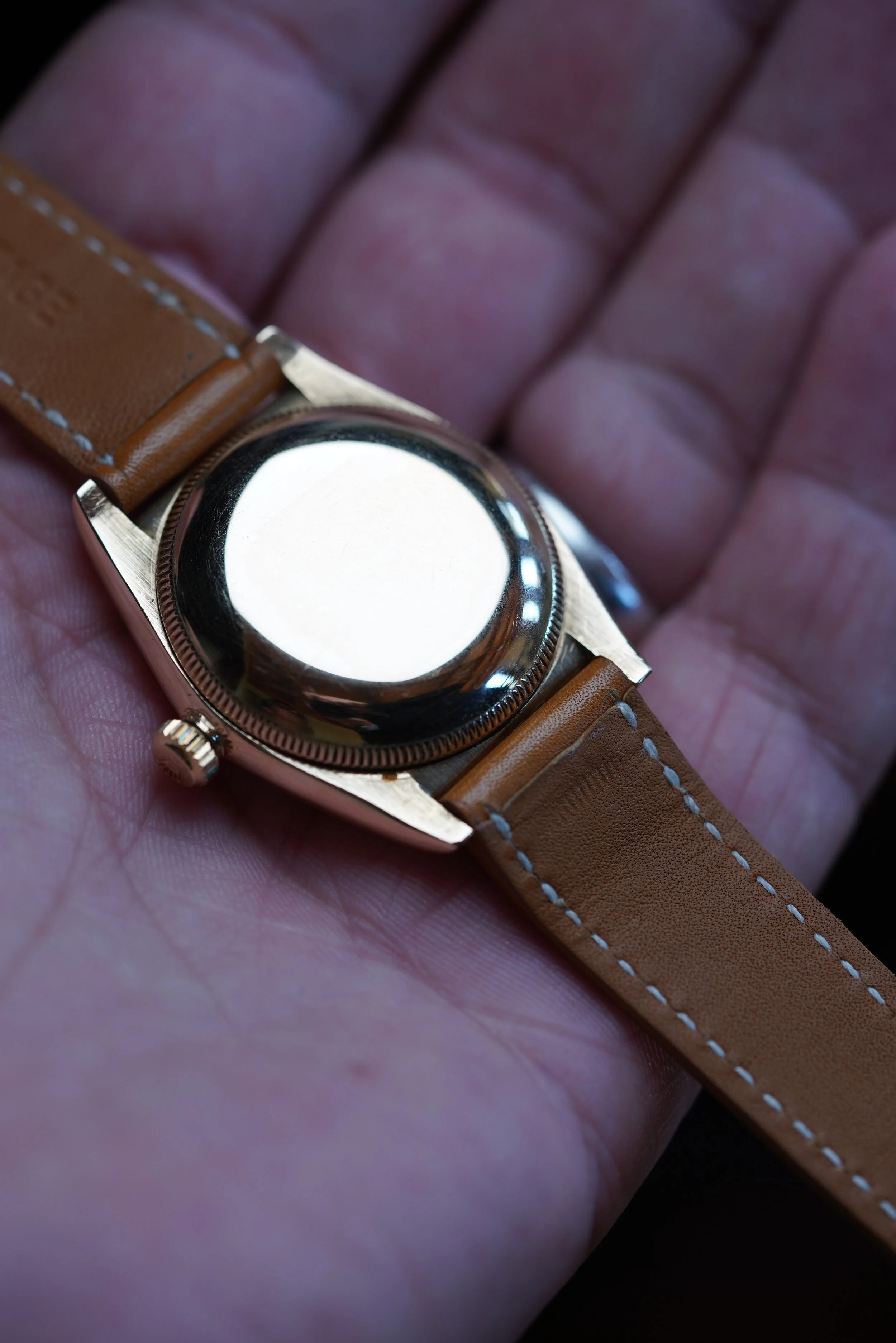 This Rolex Oyster Perpetual “Bubbleback” reference 3131 is a fascinating and early waterproof Rolex model. This example dates to circa 1946 with a 418,XXX serial. The case is made of 14k yellow gold. It has been lightly polished but is in nice condition. The dial remains unrestored which was common for many of these Bubblebacks during their peak of collecting throughout the 80s and 90s. The dial features beautiful Roman numerals and is a non-luminous variant. The crown is a later replaced Oyster crown. The case measures 32.5mm in diameter (39.5mm lug-to-lug).