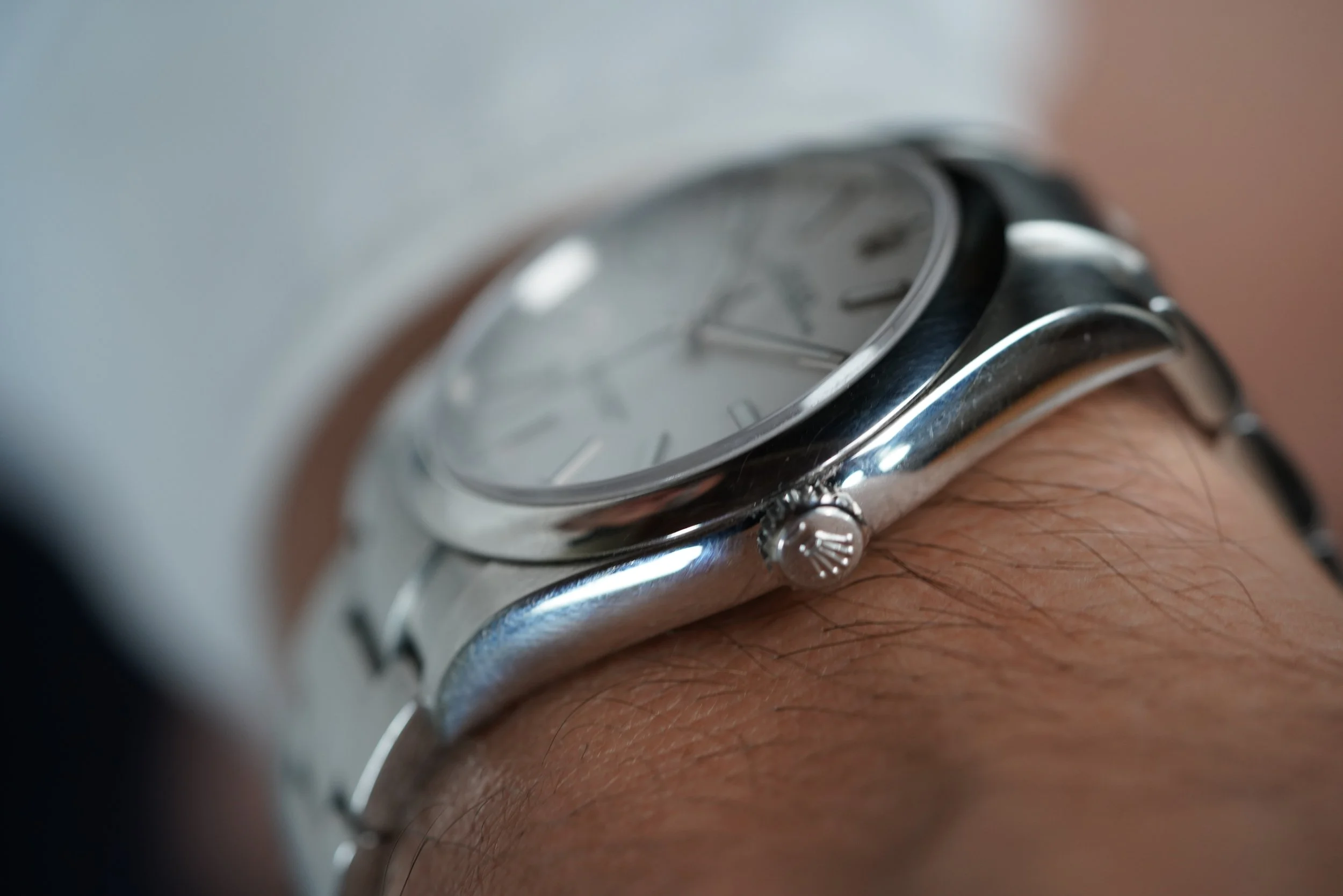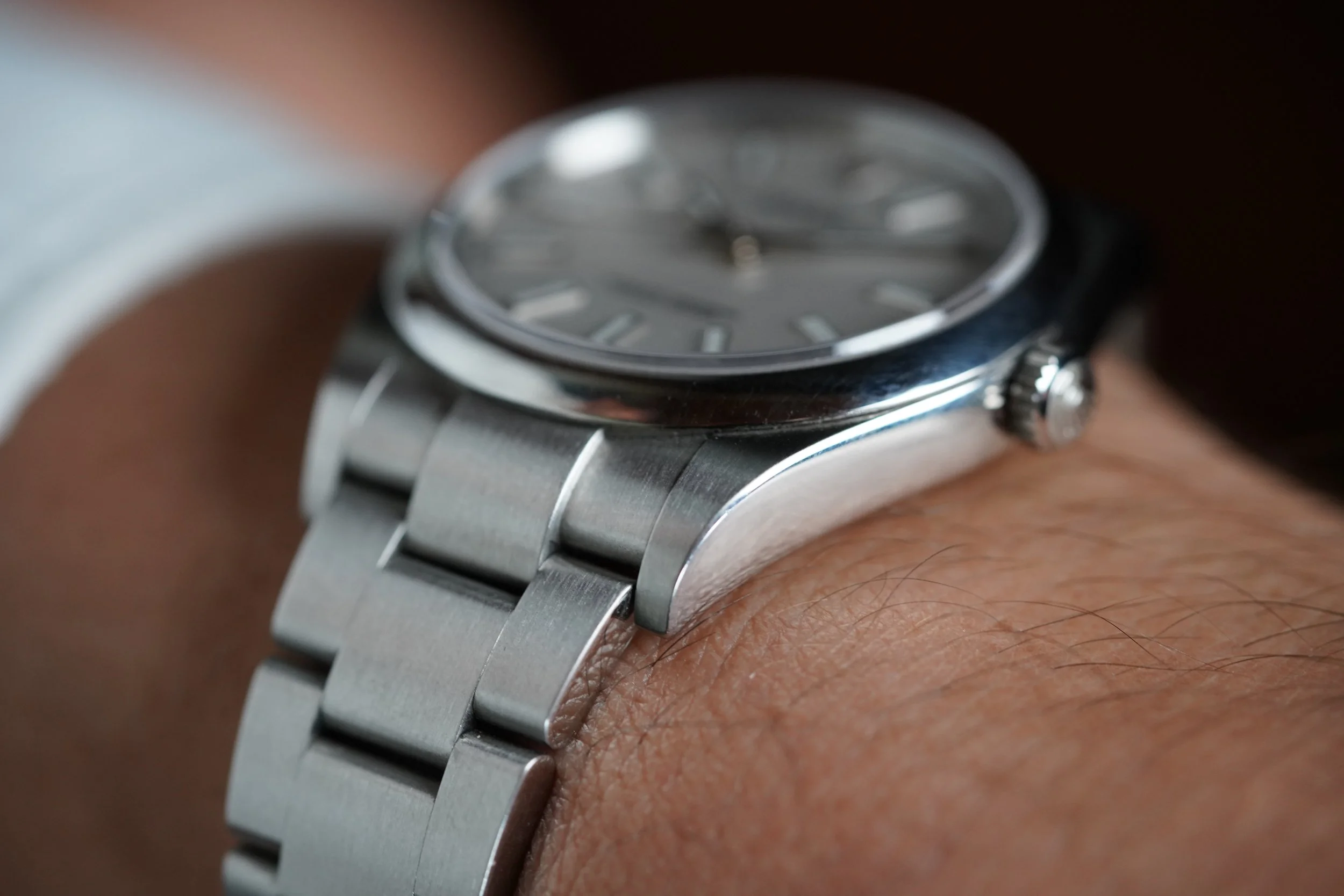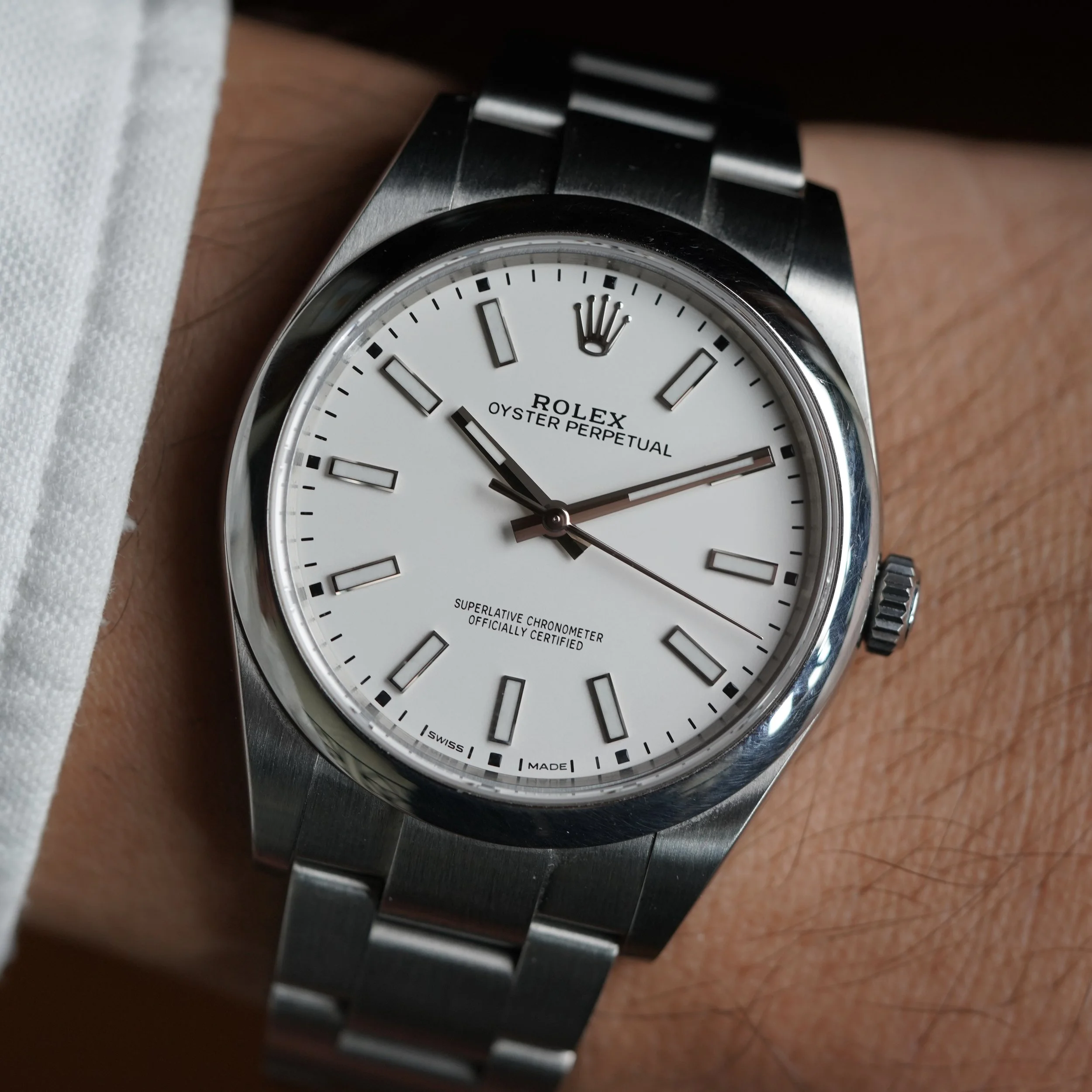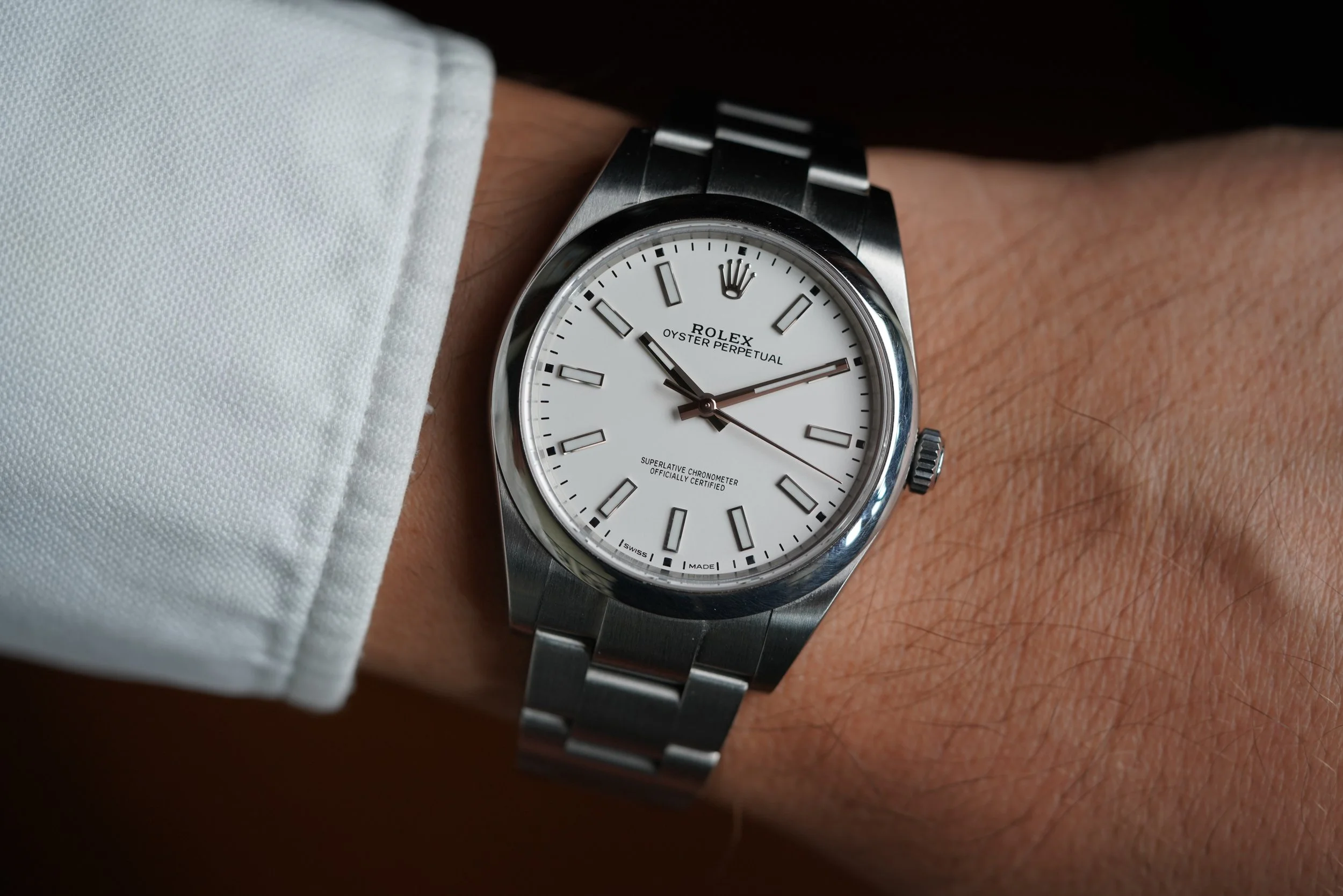 This Oyster Perpetual is a great modern watch. It is 39 millimeters which is perfect for those who find 36 millimeters too small and 41 millimeters too large. Interestingly, this size was discontinued. This watch is excellent for a “daily driver” or everyday watch. The case appears to be unpolished. It dates to 2020.