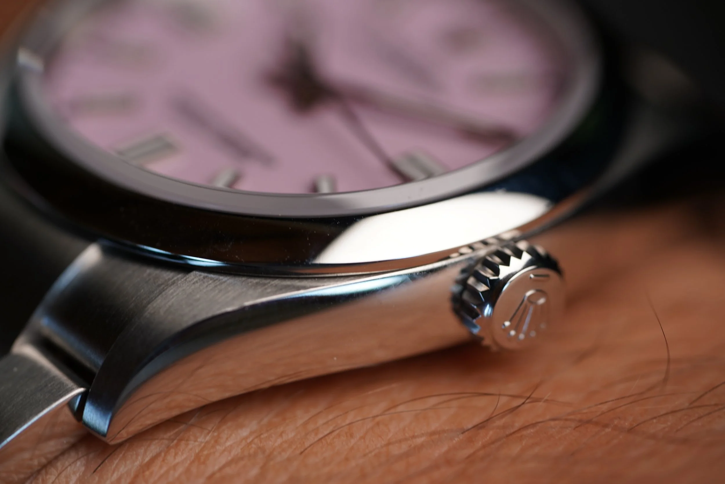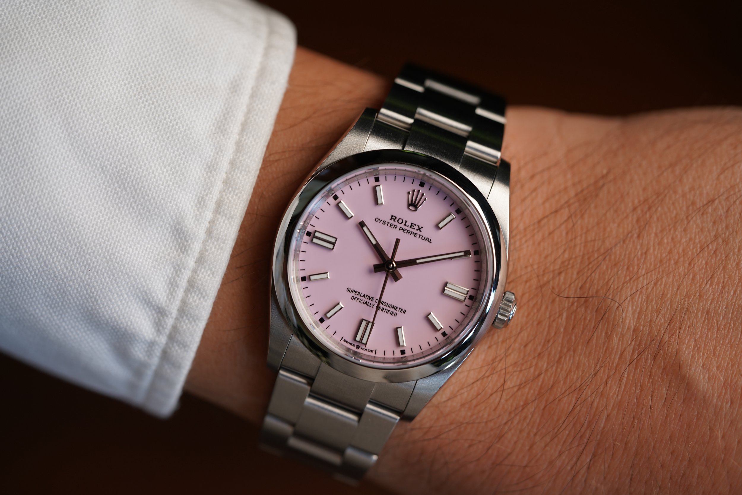 This Rolex Oyster Perpetual reference 126000 is an awesome modern watch. It features one of my favorite dial variants from the line in pink. The case appears to be unpolished and measures 36mm in diameter.