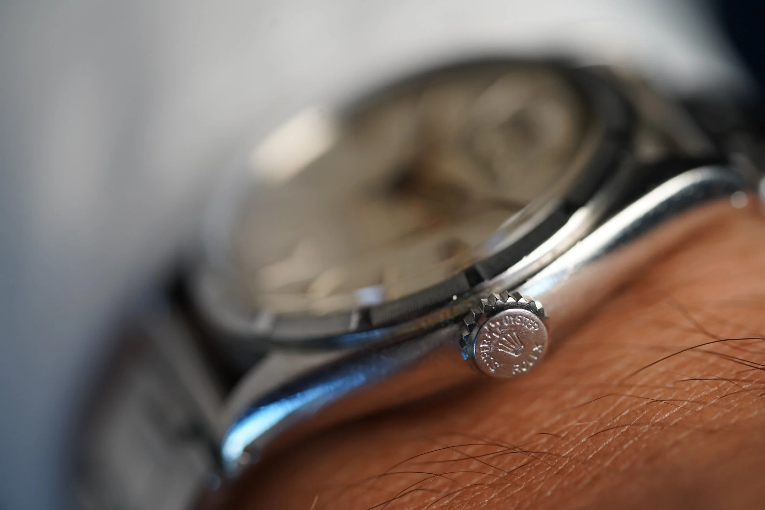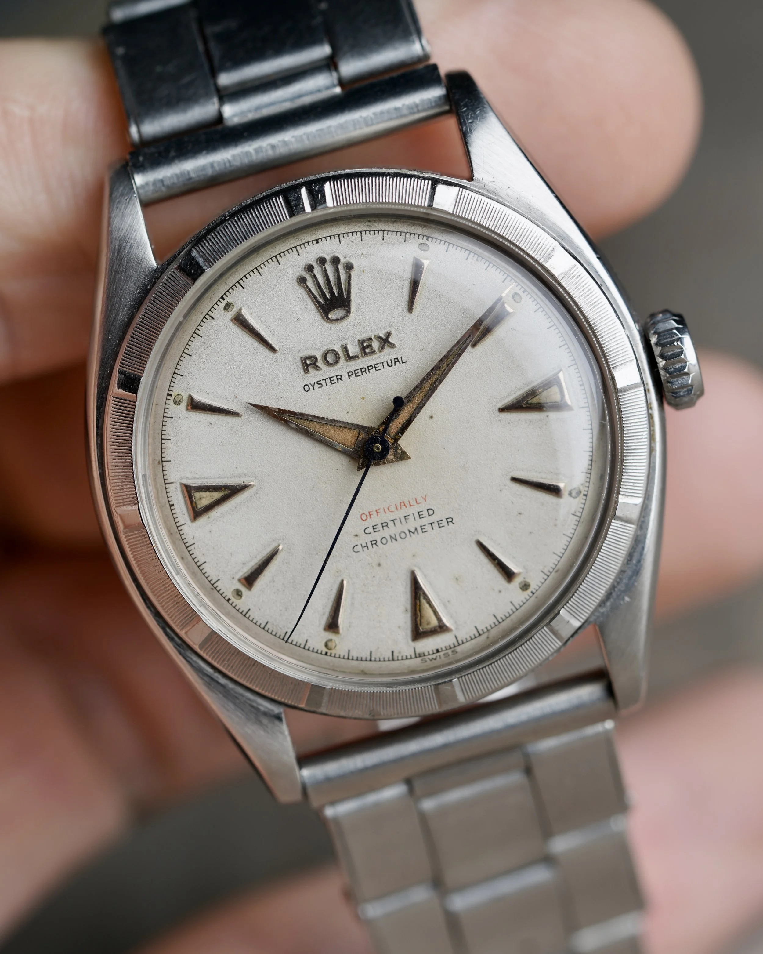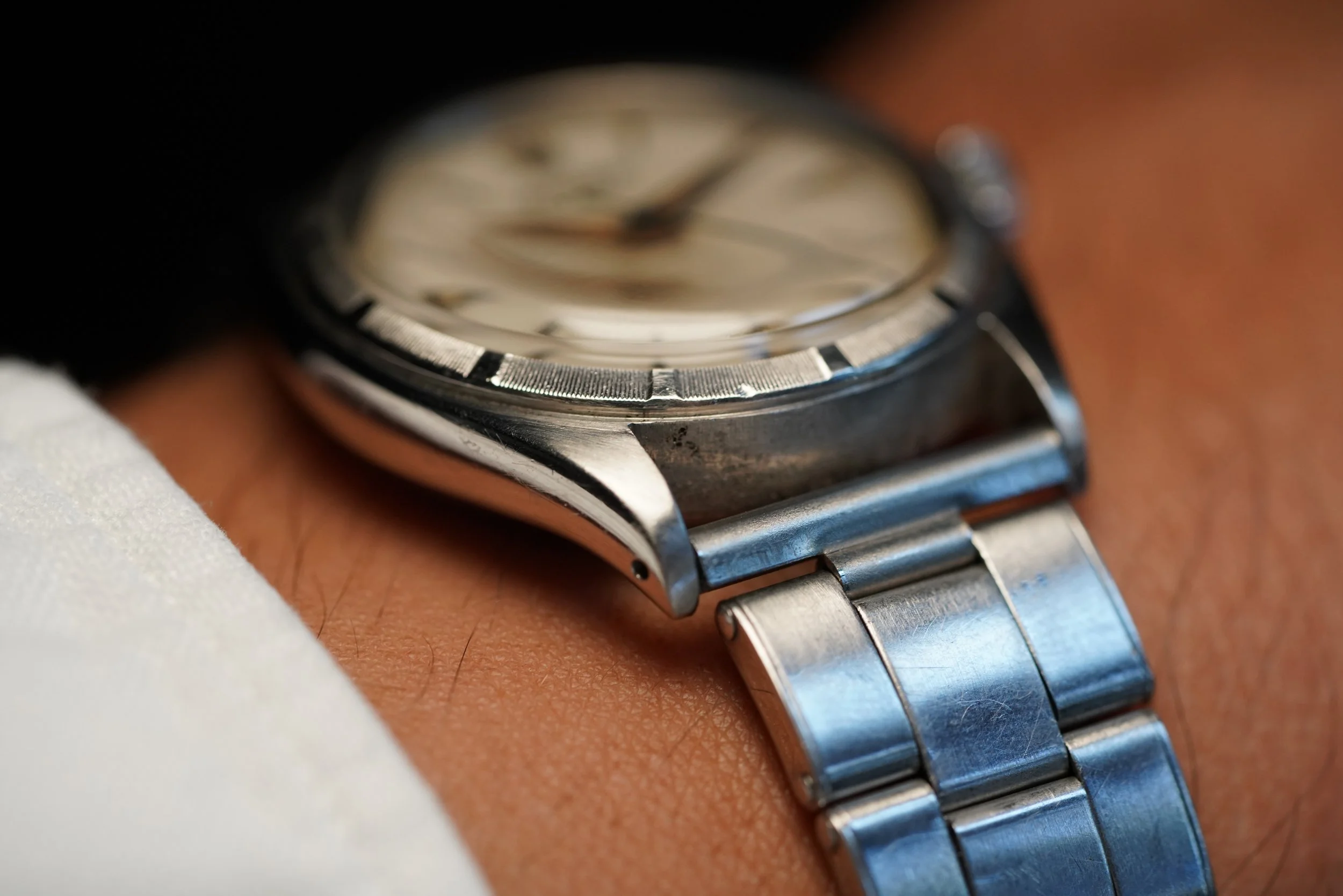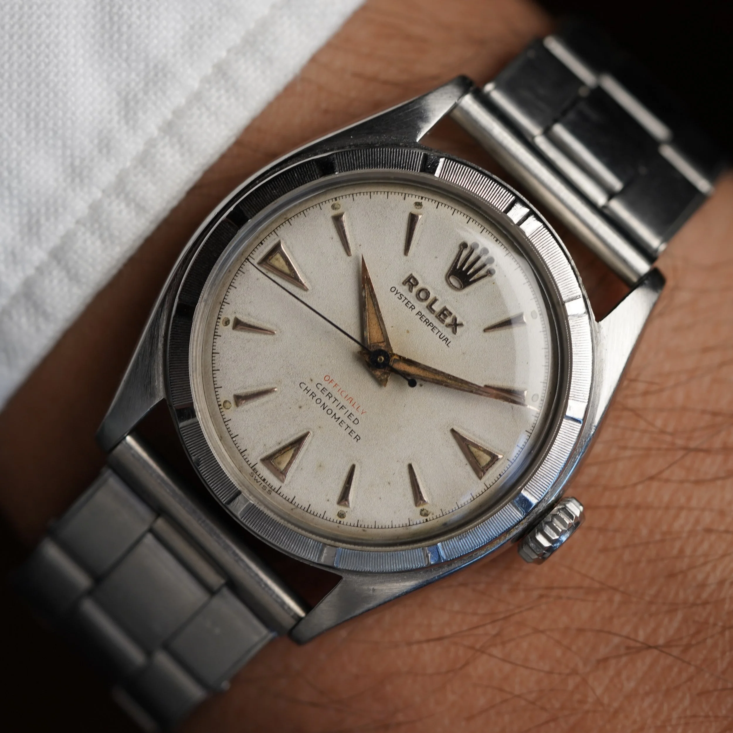 This is a super cool Rolex Oyster Perpetual reference 6085. It dates to circa 1952 with a 761,XXX serial. The case has been polished. It measures 34mm in diameter. It is paired on a C&I stretch Rivet bracelet for Rolex dating to 1965.