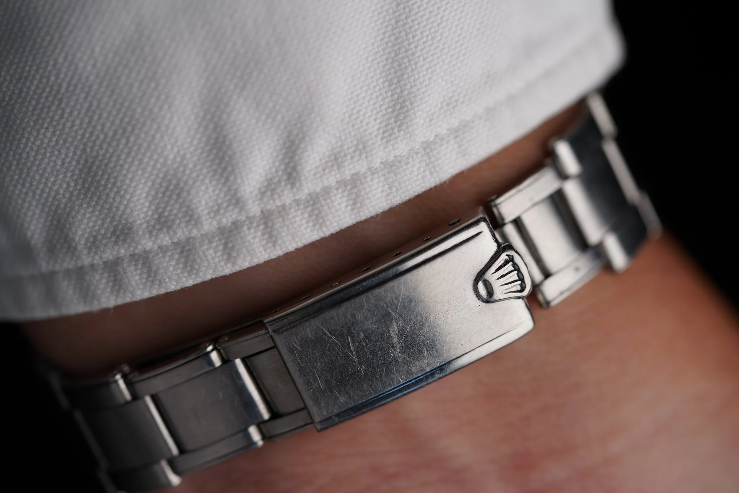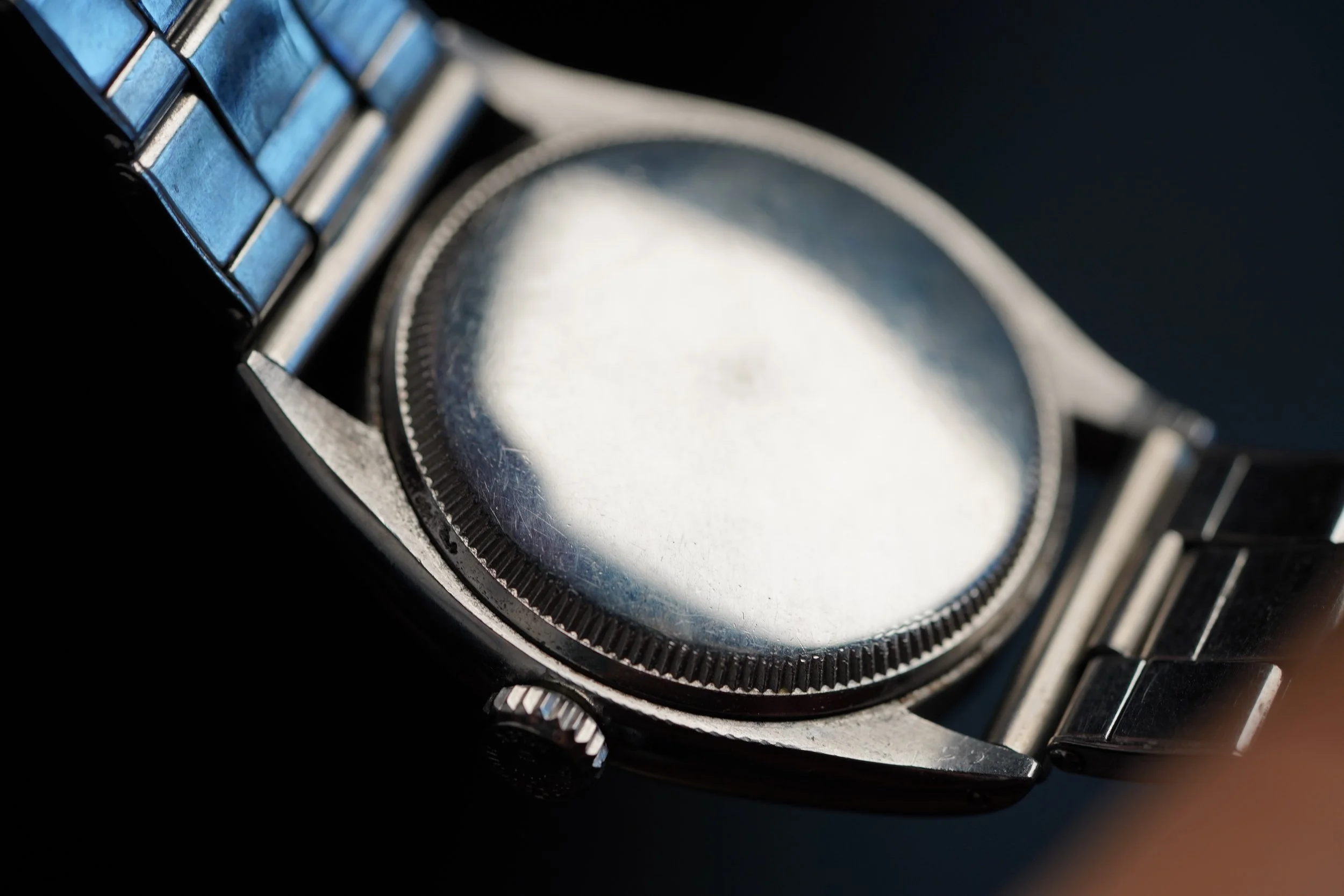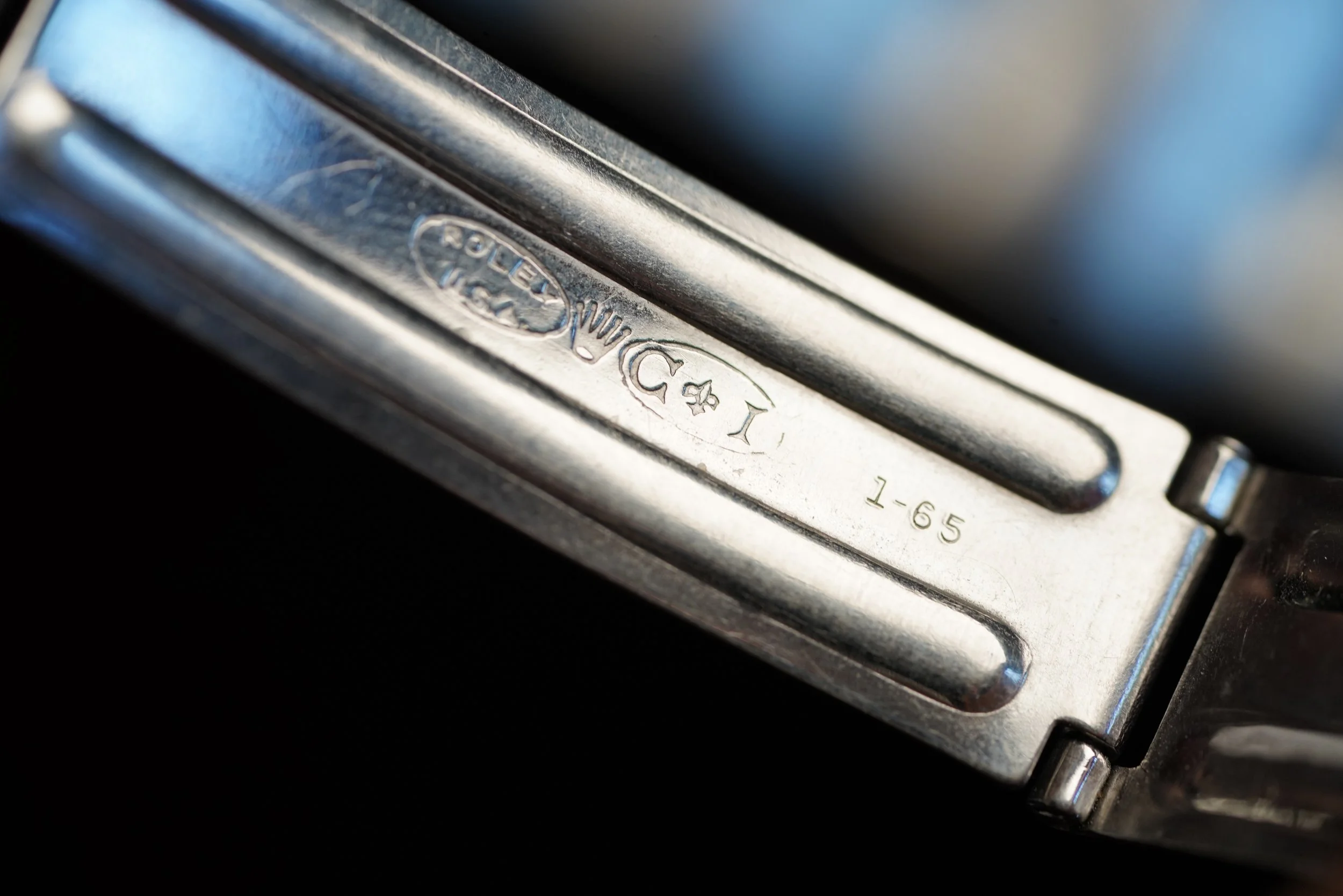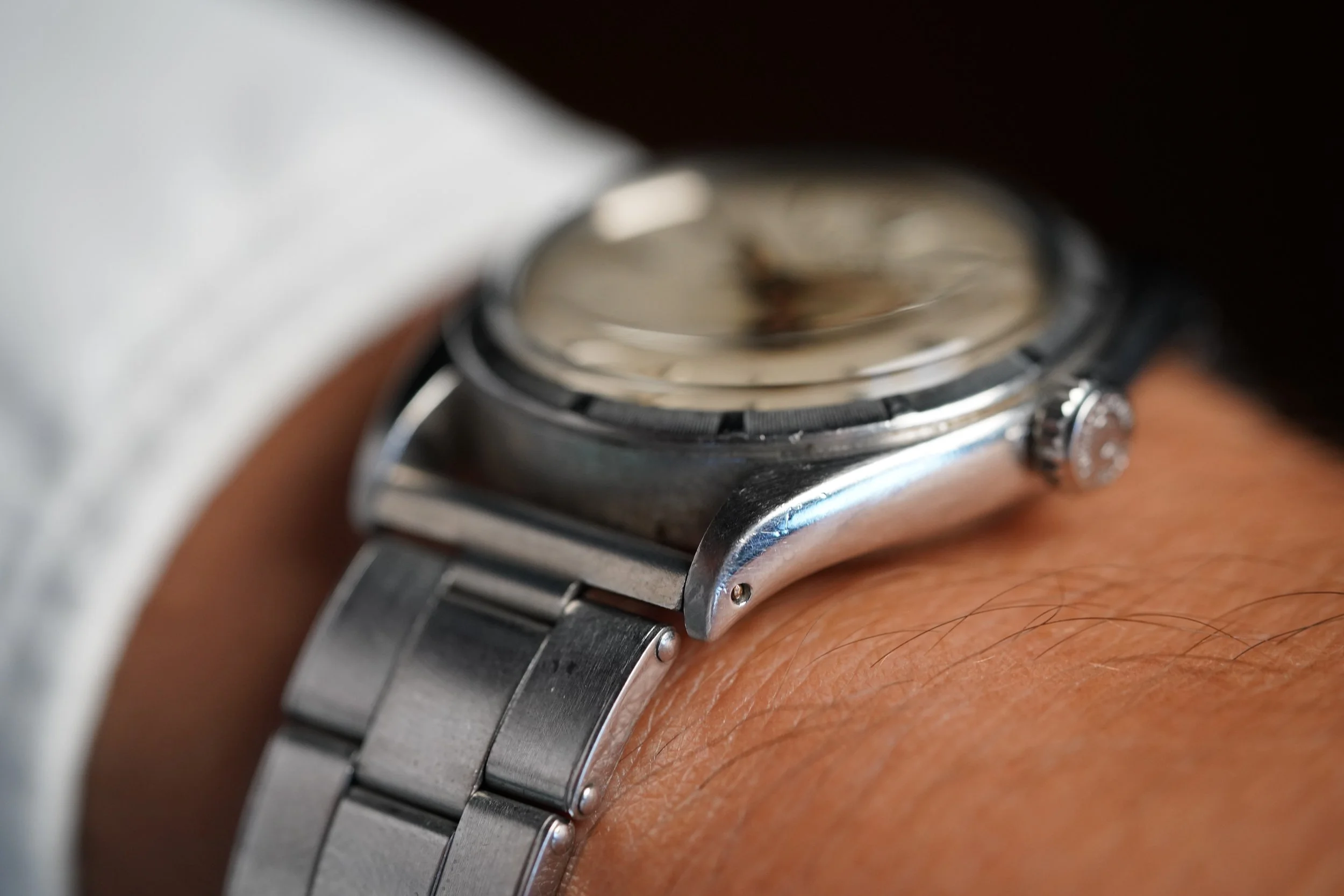 This is a super cool Rolex Oyster Perpetual reference 6085. It dates to circa 1952 with a 761,XXX serial. The case has been polished. It measures 34mm in diameter. It is paired on a C&I stretch Rivet bracelet for Rolex dating to 1965.