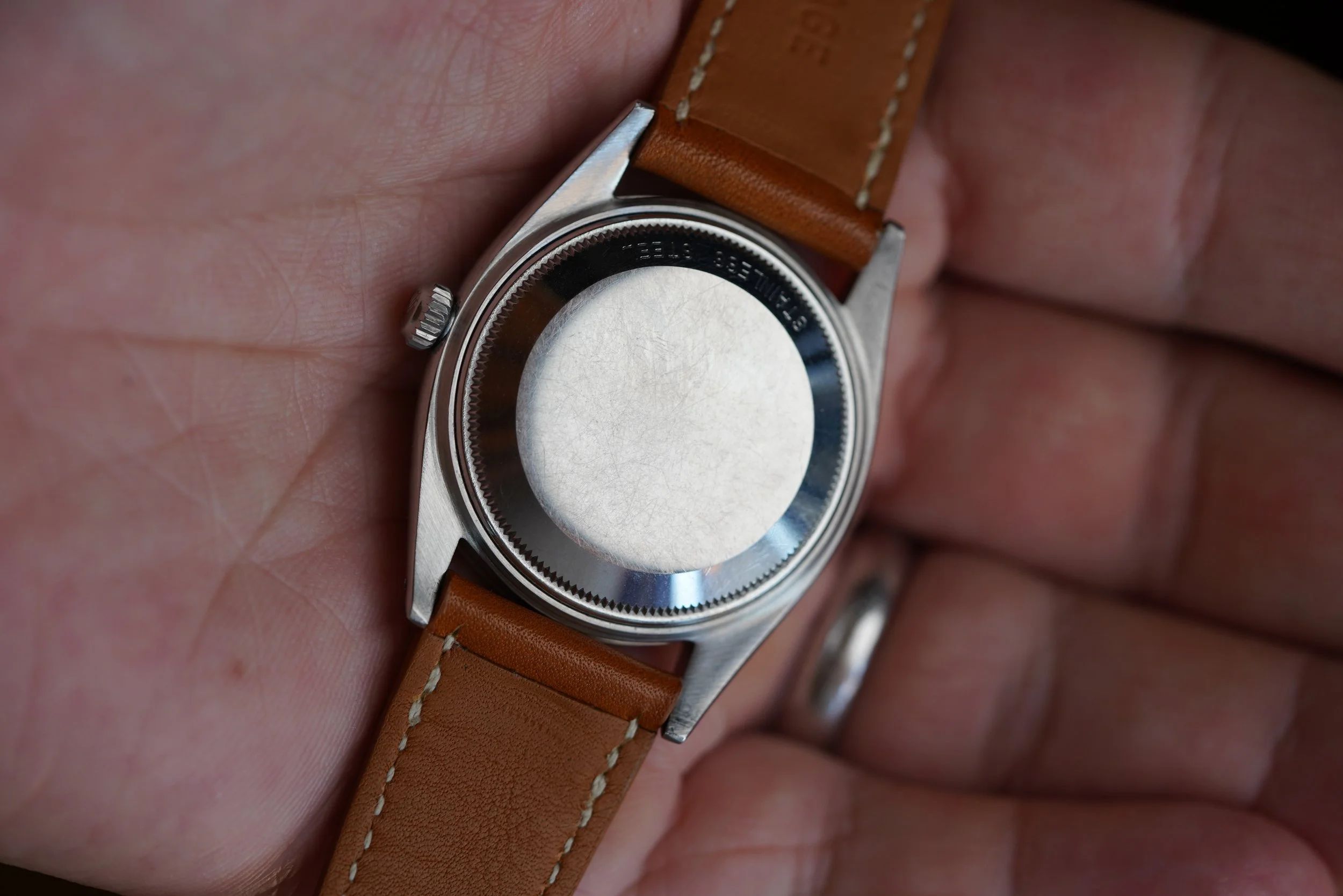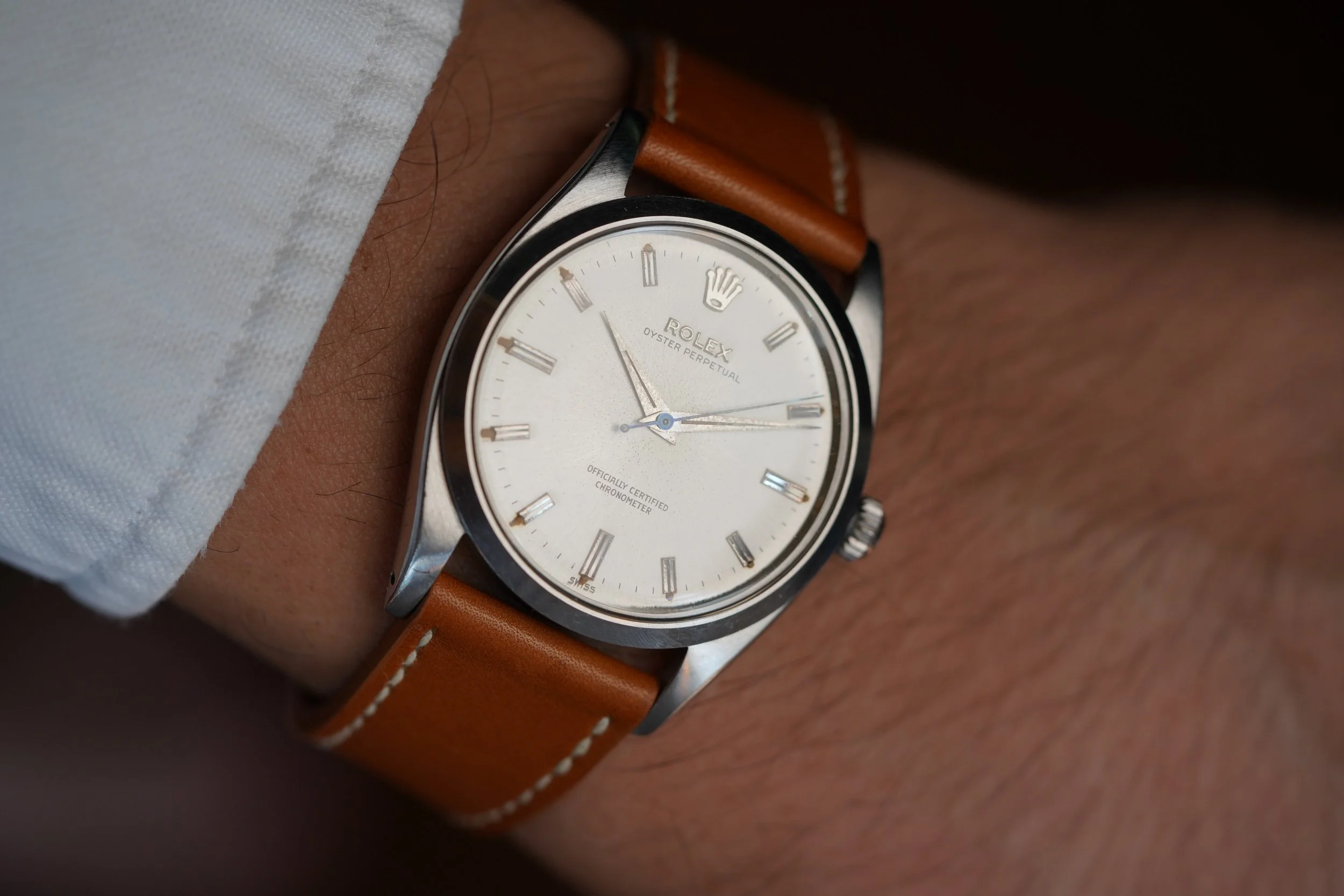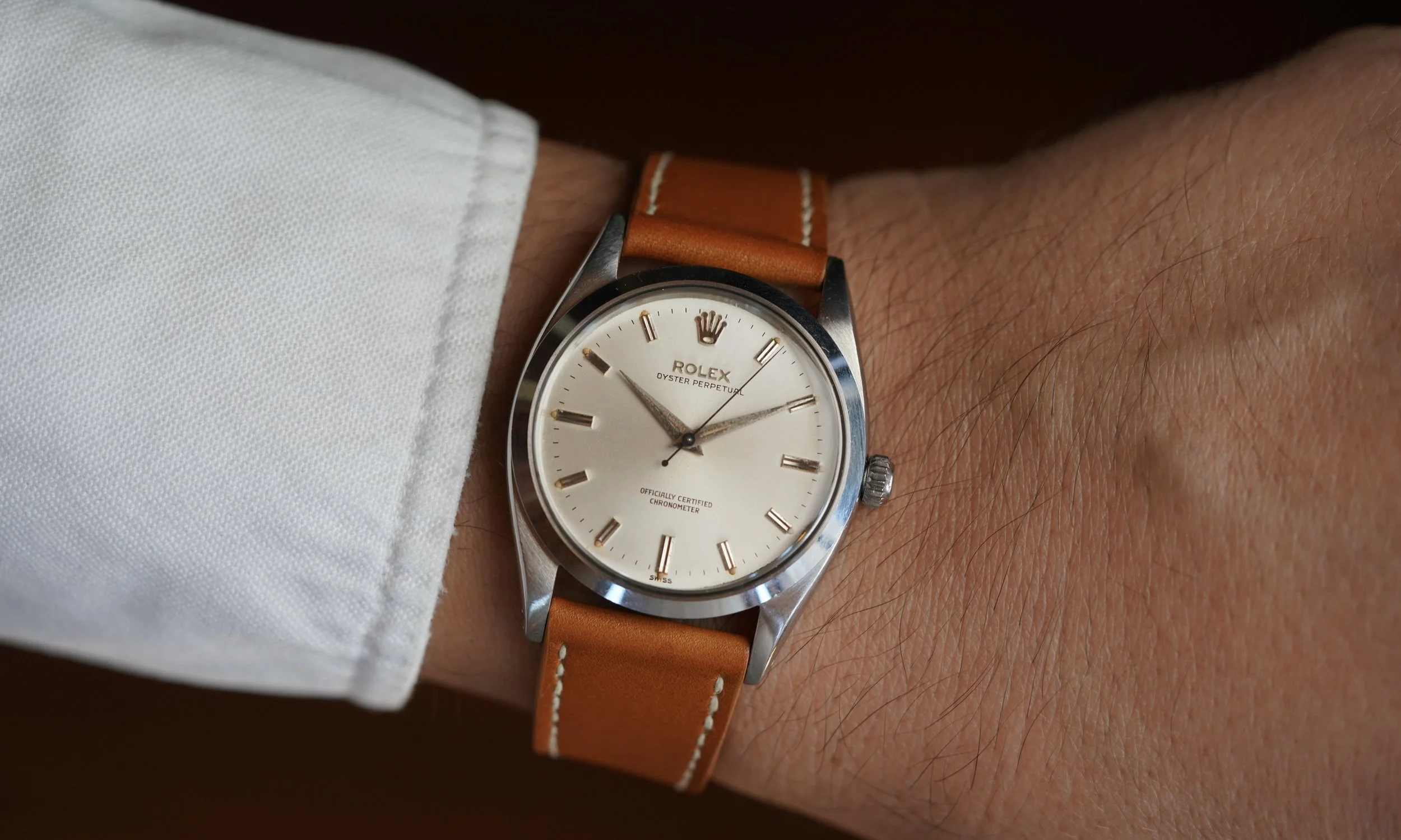 The dauphine hands have developed a beautiful patina. Not only does the dial feature an applied coronet, but it also features the applied “ROLEX” letters. As an early OP, it is absent of the “Superlative” language. The dial features bold hour markers and warm luminous plots which are complementary of the 20mm “Honey Wind” strap made by Nick Gabarro. The serial is a 311,XXX dating to circa 1957.