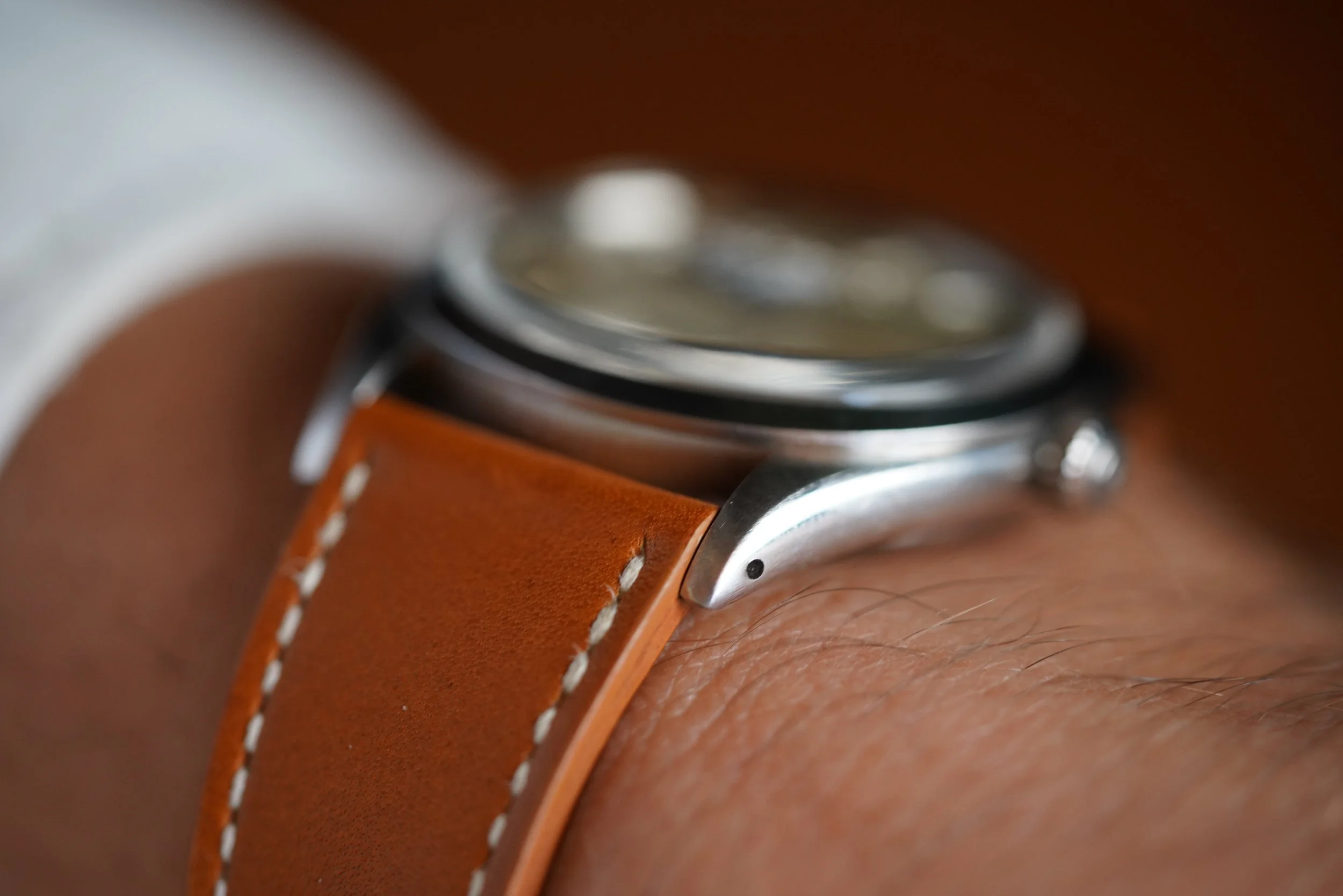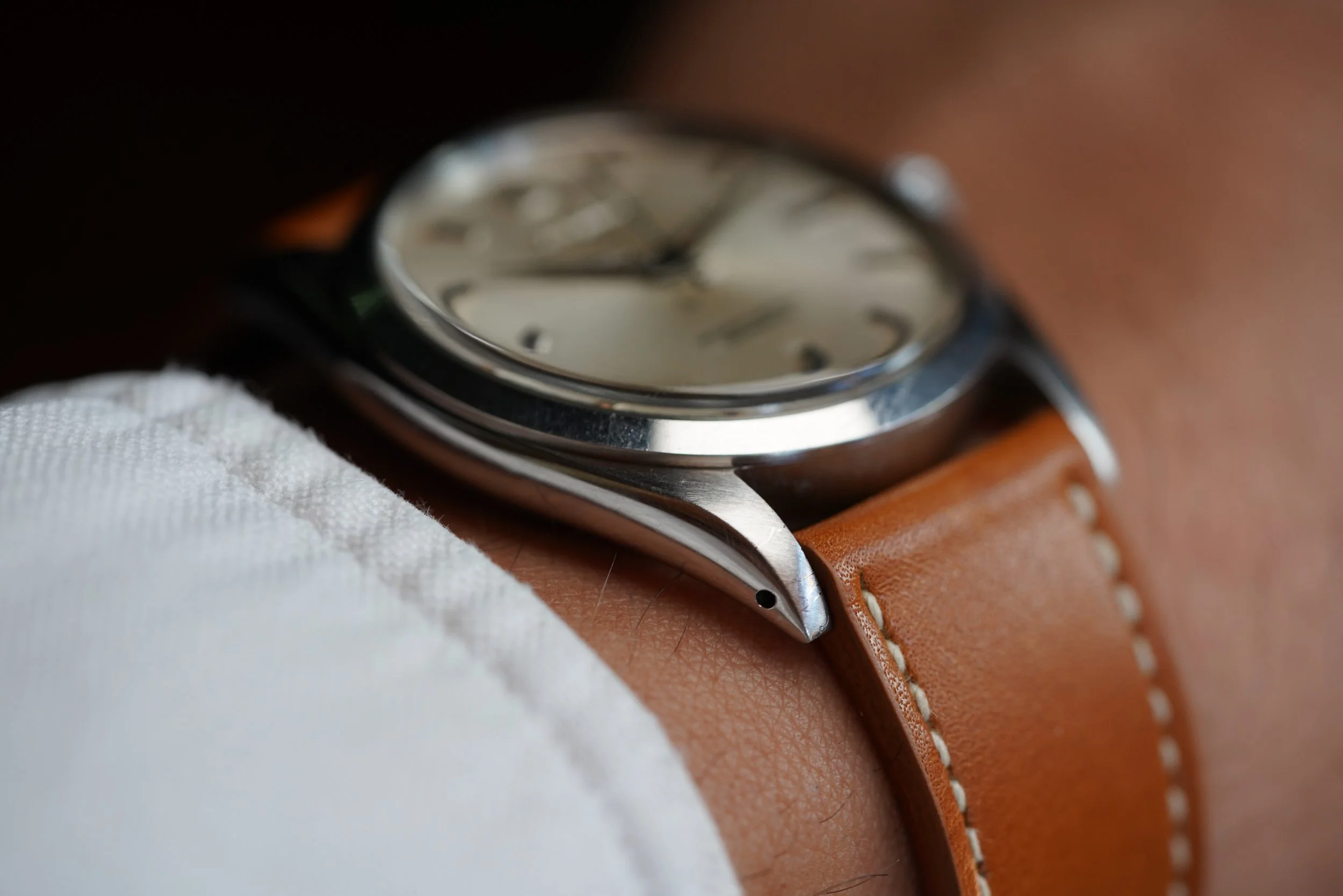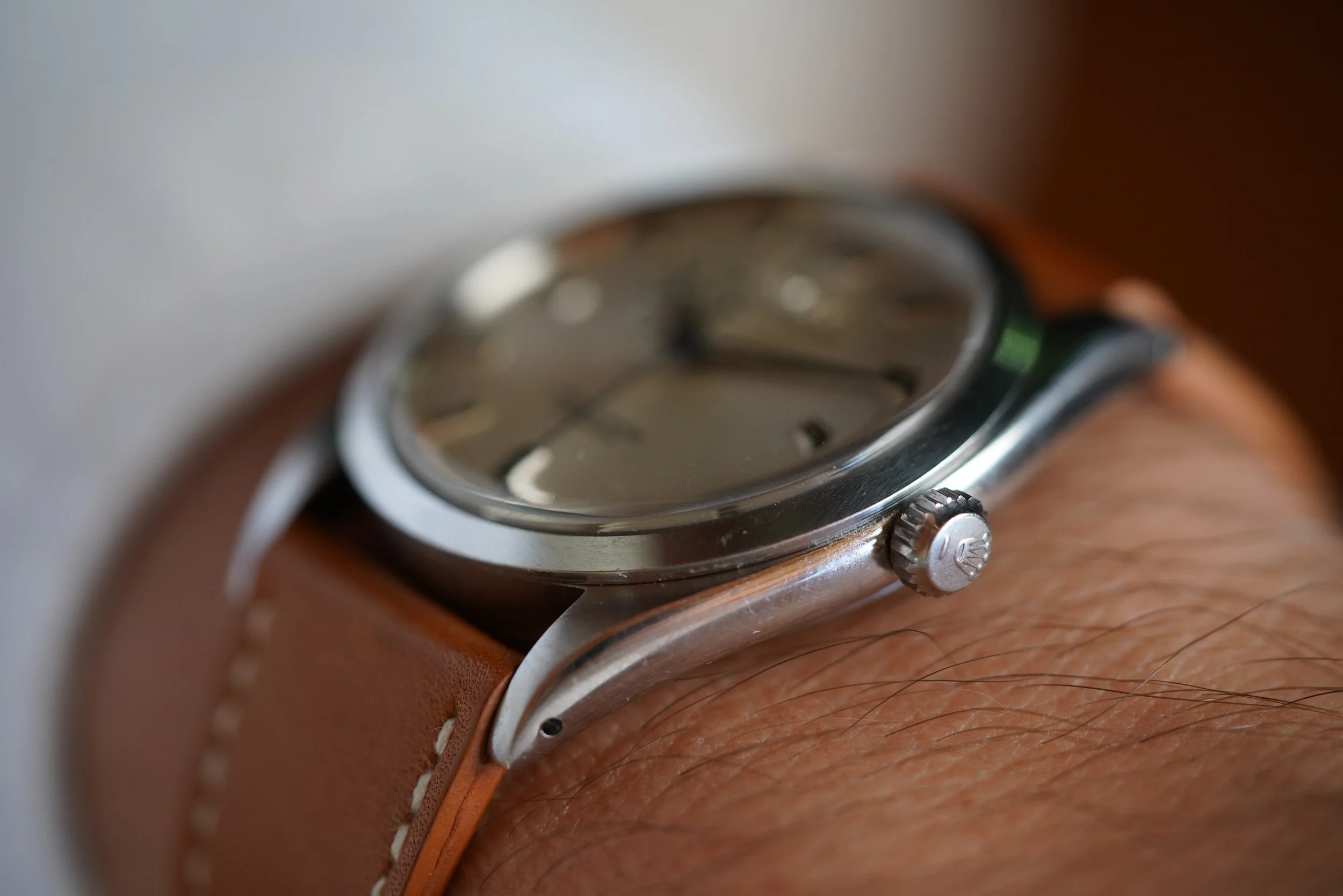 The dauphine hands have developed a beautiful patina. Not only does the dial feature an applied coronet, but it also features the applied “ROLEX” letters. As an early OP, it is absent of the “Superlative” language. The dial features bold hour markers and warm luminous plots which are complementary of the 20mm “Honey Wind” strap made by Nick Gabarro. The serial is a 311,XXX dating to circa 1957.
