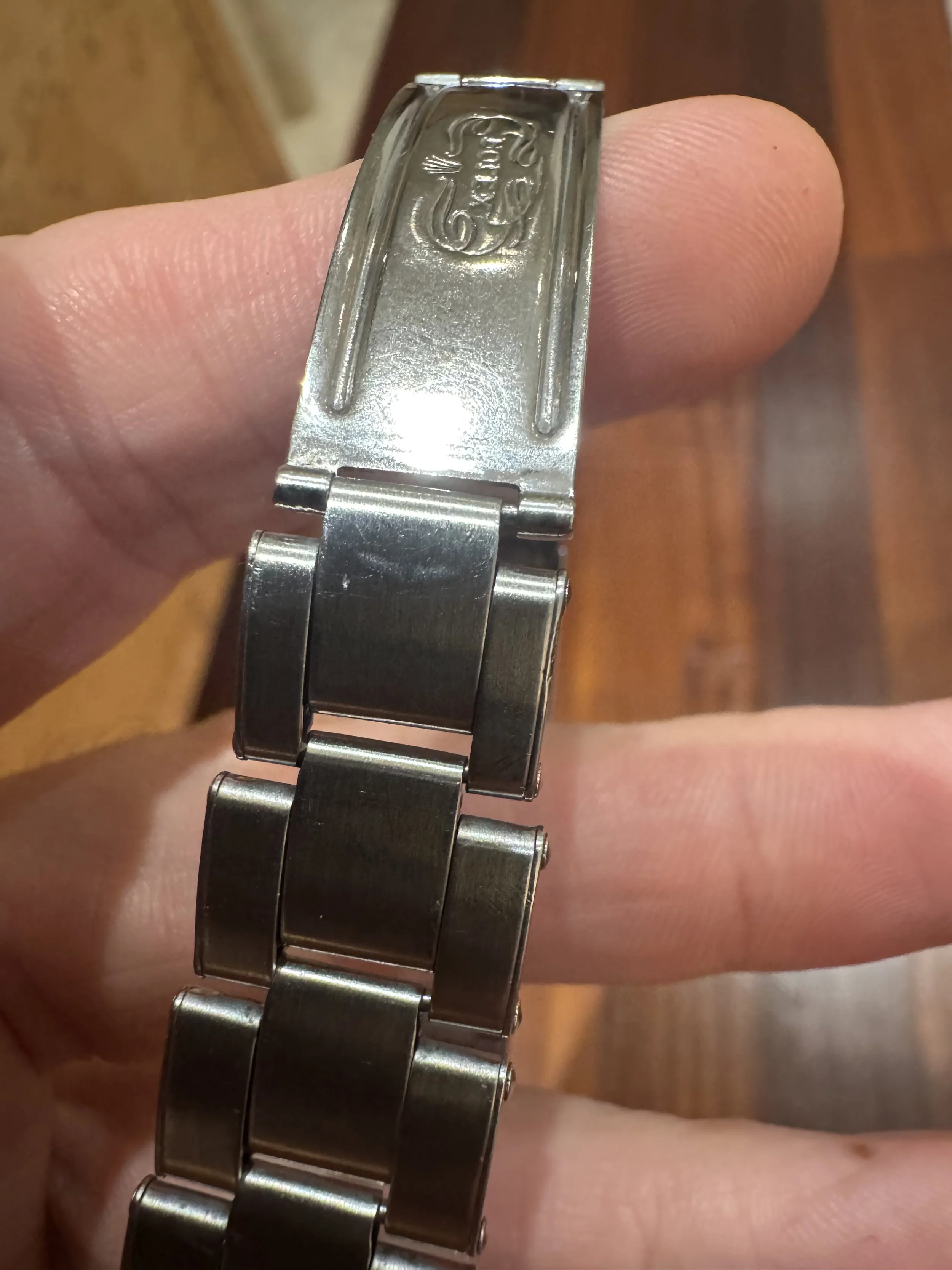 This Rolex Oyster Precision is a great stainless Rolex watch that dates to circa 1952 with an 801,XXX serial number. The watch measures 34mm in diameter, approximately 40mm lug-to-lug. It comes with a Rolex 7205 Gay Frères rivet bracelet with 60 end links dating to 1970. The case and bracelet are stainless steel. The case appears to be unpolished. The dial is an attractive cream color with non-luminous indices and hand dauphine hands. It features the blue center seconds hand.