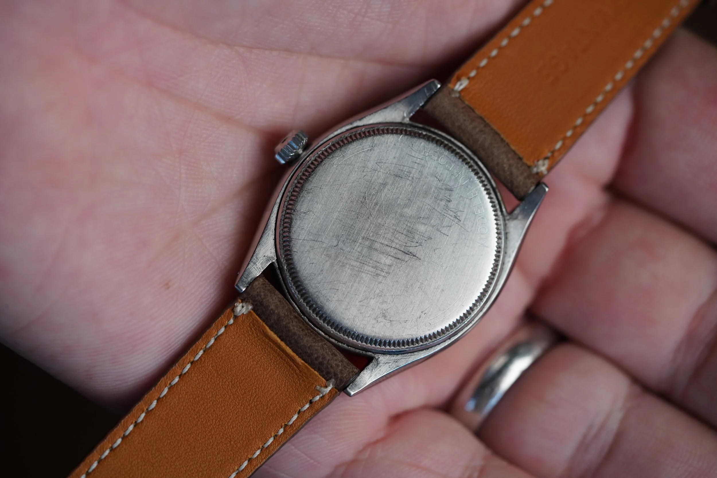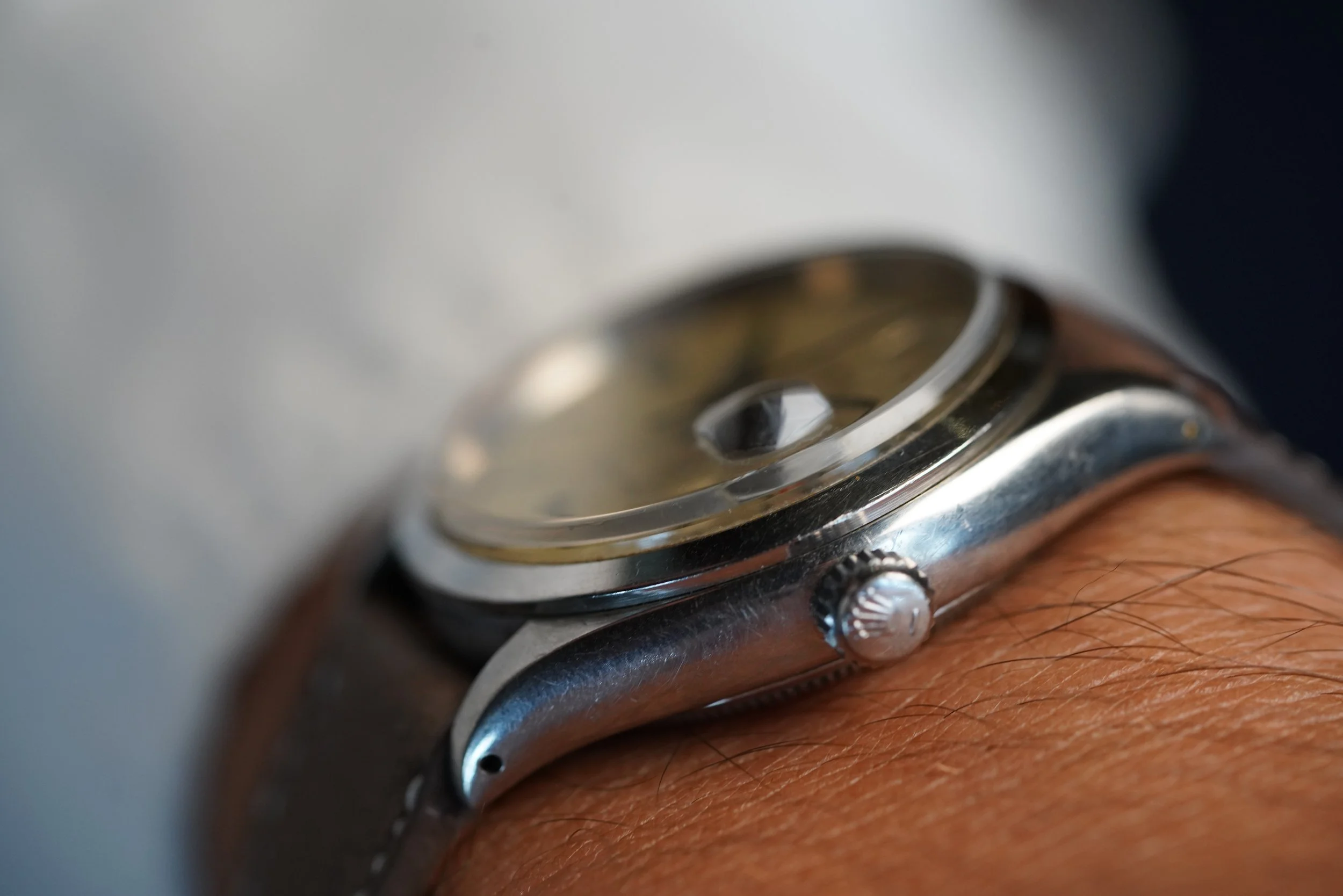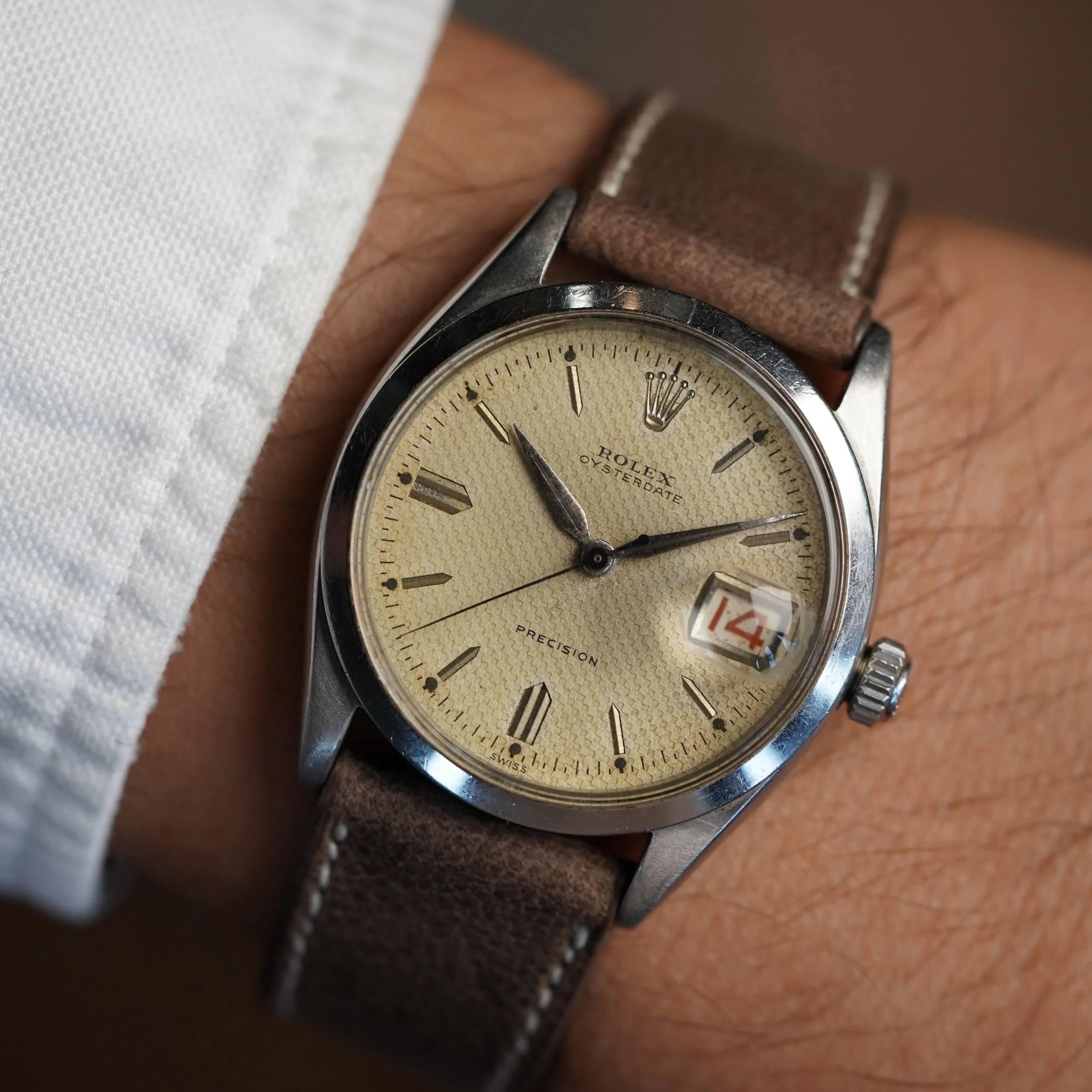 This is a super cool Rolex Oysterdate reference 6294 with an incredible silver honeycomb dial. It dates to circa 1953 with a 962,XXX serial. The case has been polished. It measures 34mm in diameter. For those looking for a very cool and interesting 1950s Rolex, look no further! It features a roulette date wheel.