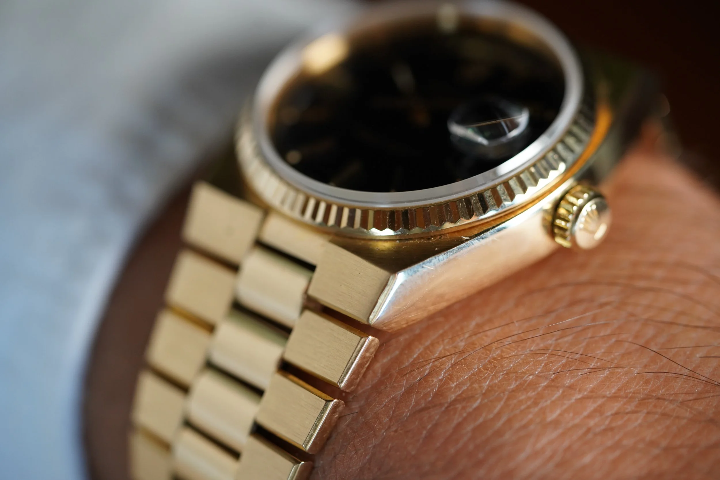 This is a very cool black dial Rolex Oysterquartz Day-Date reference 19018. The 18k yellow gold case bracelet dates to 1984 with a serial number in the 7.5 million range. The integrated gold bracelet has a D clasp code and dates to circa 1979, but we believe it to be original. Both the case and bracelet have been polished in the past.