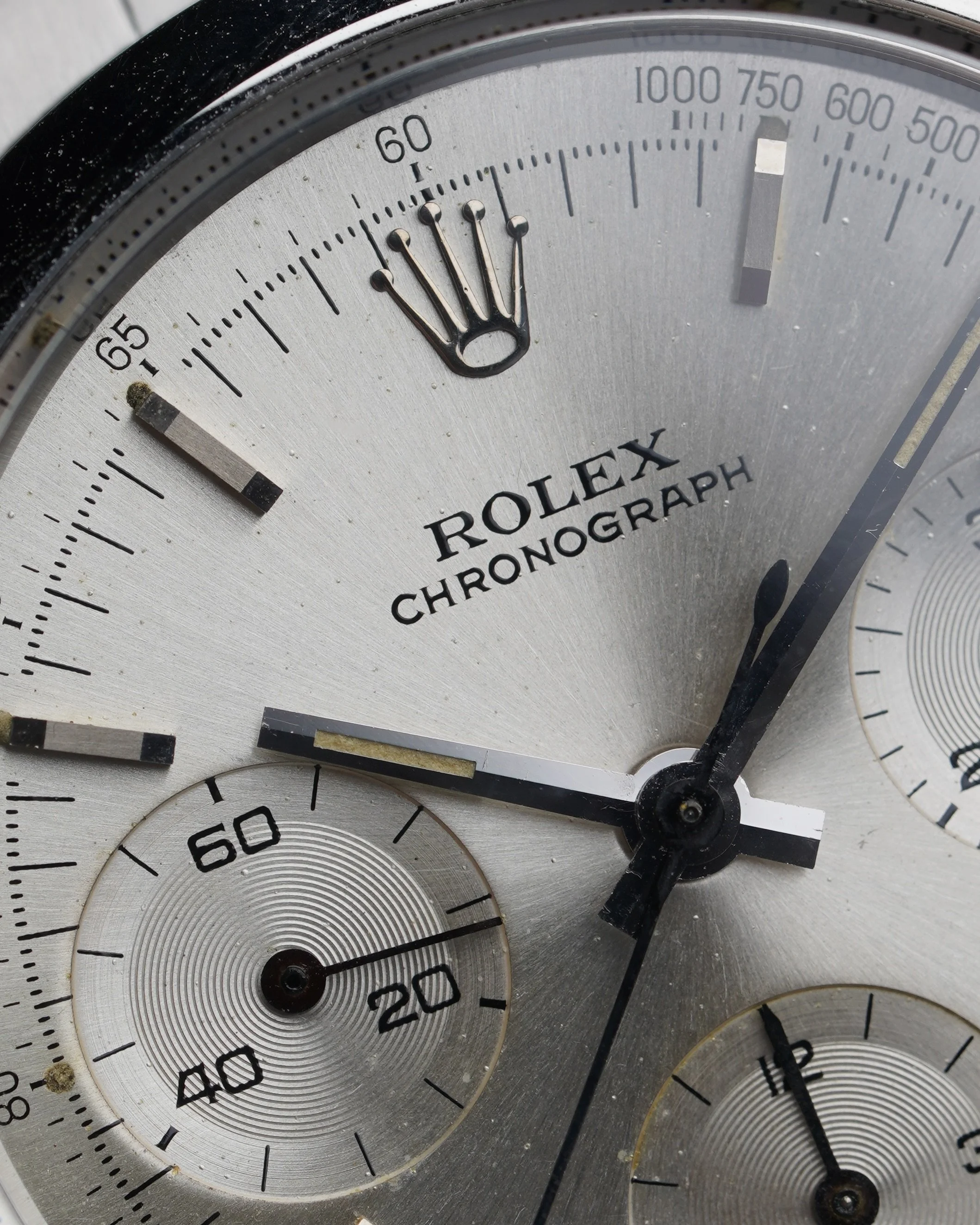 The Rolex “Pre-Daytona” reference 6238 is a great chronograph for Rolex enthusiasts. This example features a silver dial with a printed tachymeter scale. This particular example dates to circa 1965 with a 1.1M serial number. The case is 36mm in diameter and has been polished in the past. It is paired with a C+I bracelet dating to 1969.