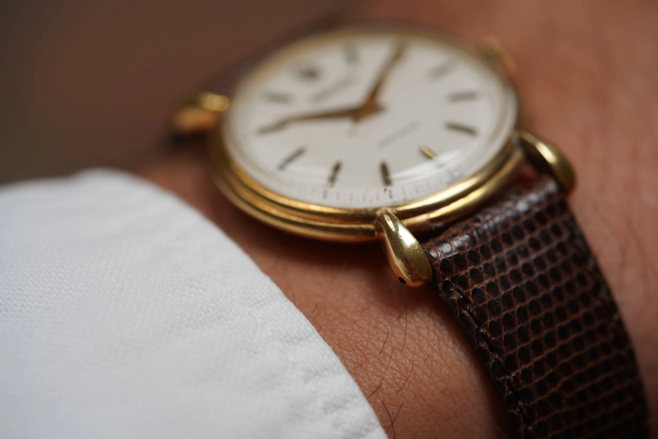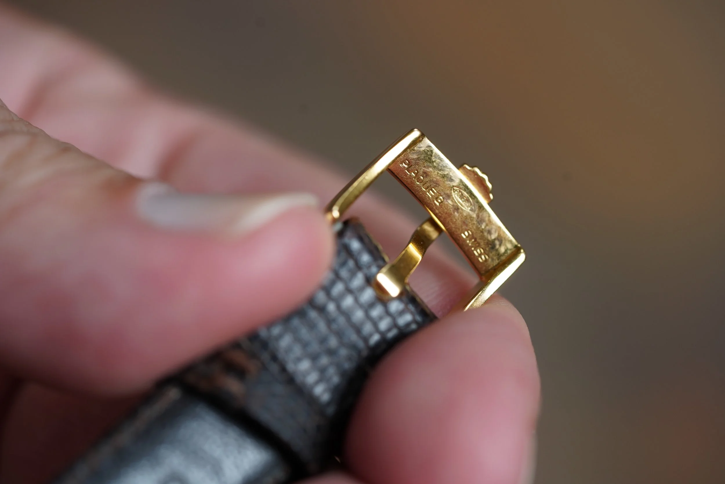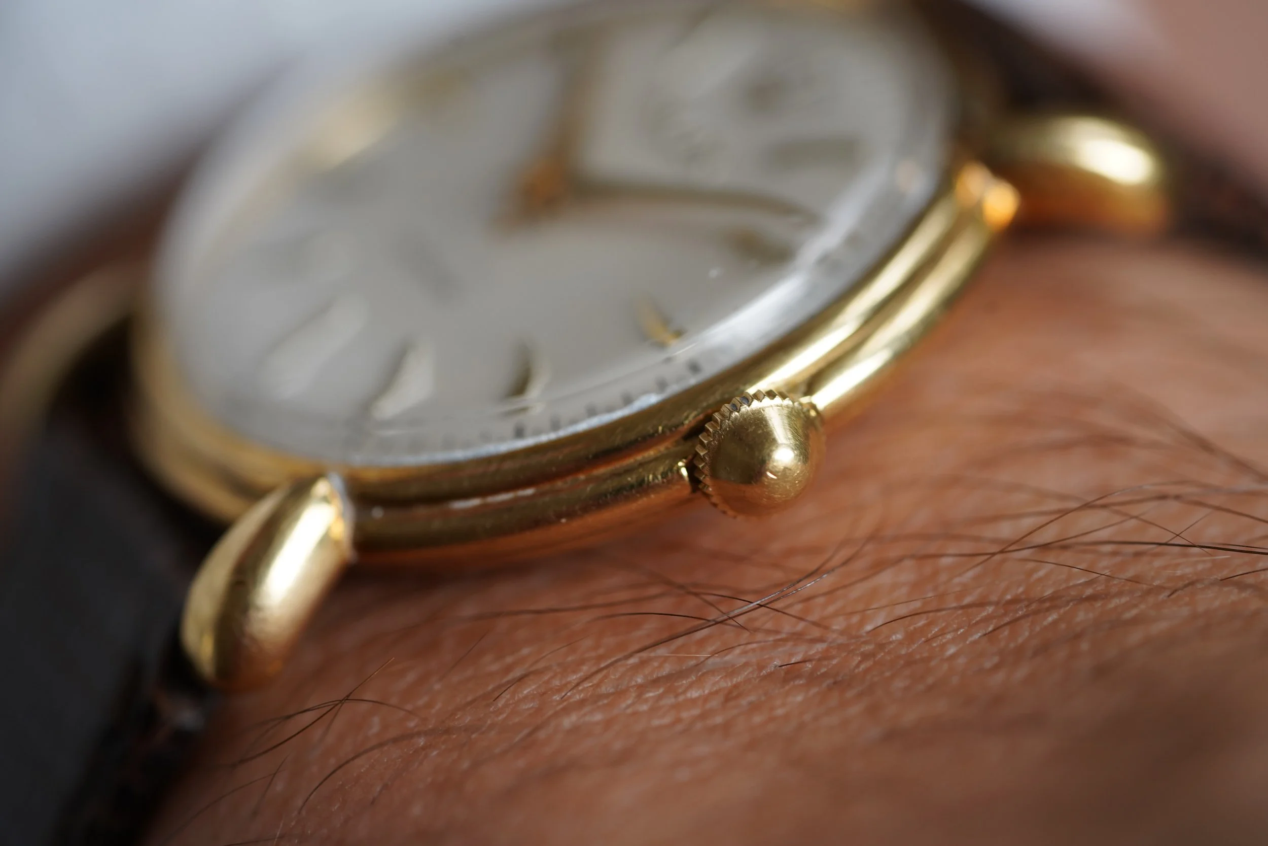 This Rolex Precision is an amazing dress watch form the late 1940s. The case serial dates the watch to circa 1947. We believe the 18k yellow gold case is unpolished. It features a super rare “thimble” crown seen on very few Rolex watches which is a super cool detail. The case was made by Gabus Frères, Usine Safir S.A with the hallmark 141. The case is 33mm in diameter and 39mm lug to lug.