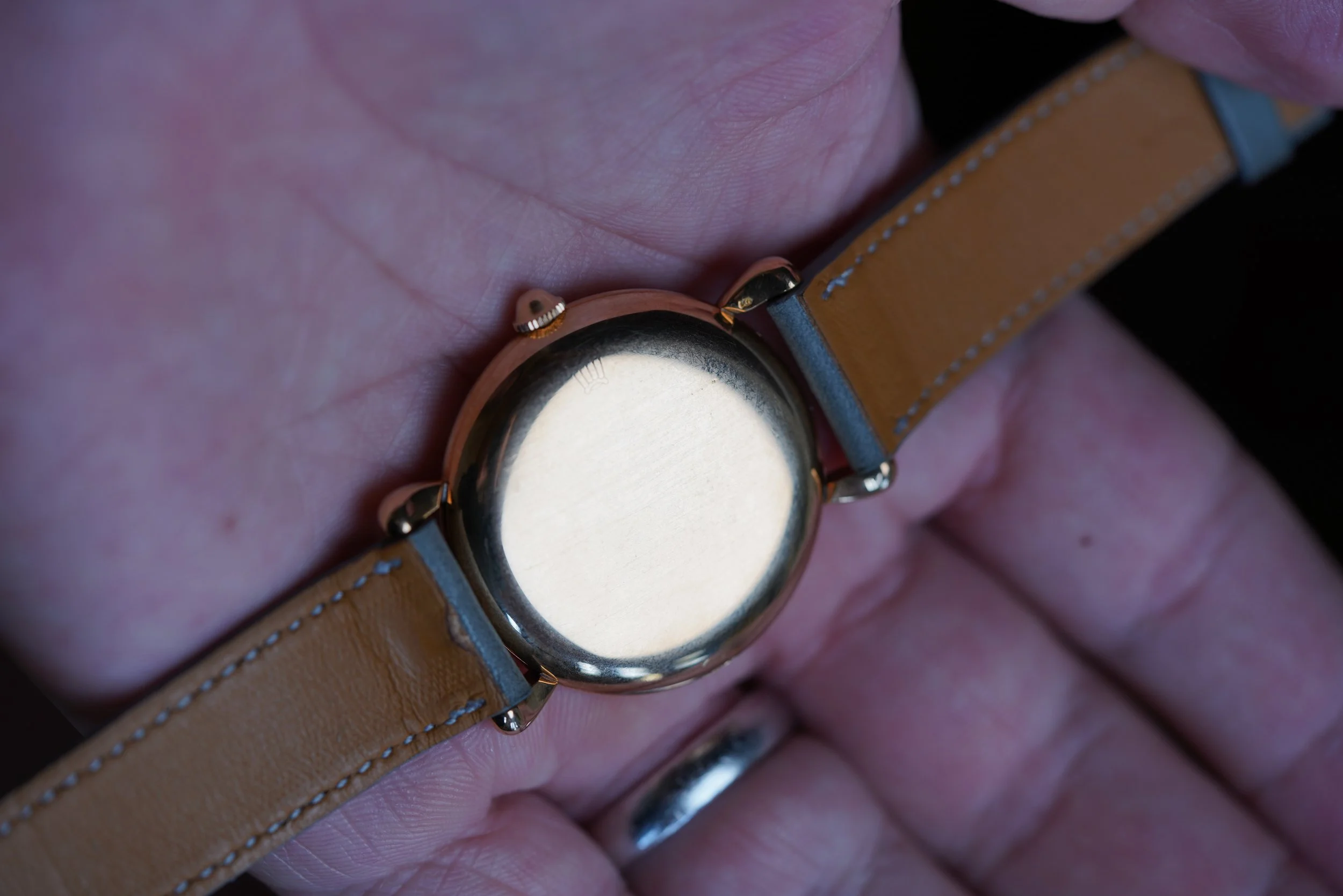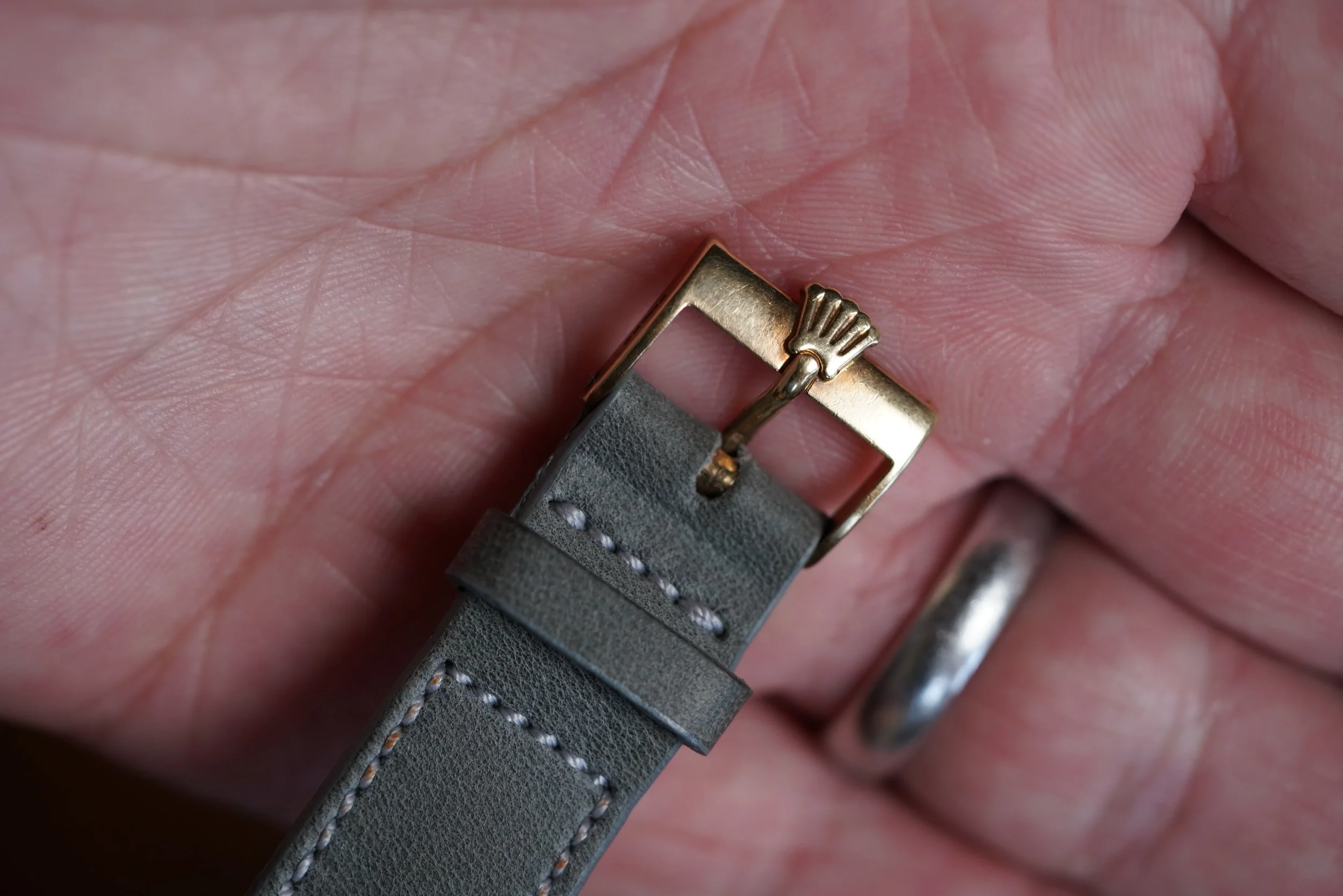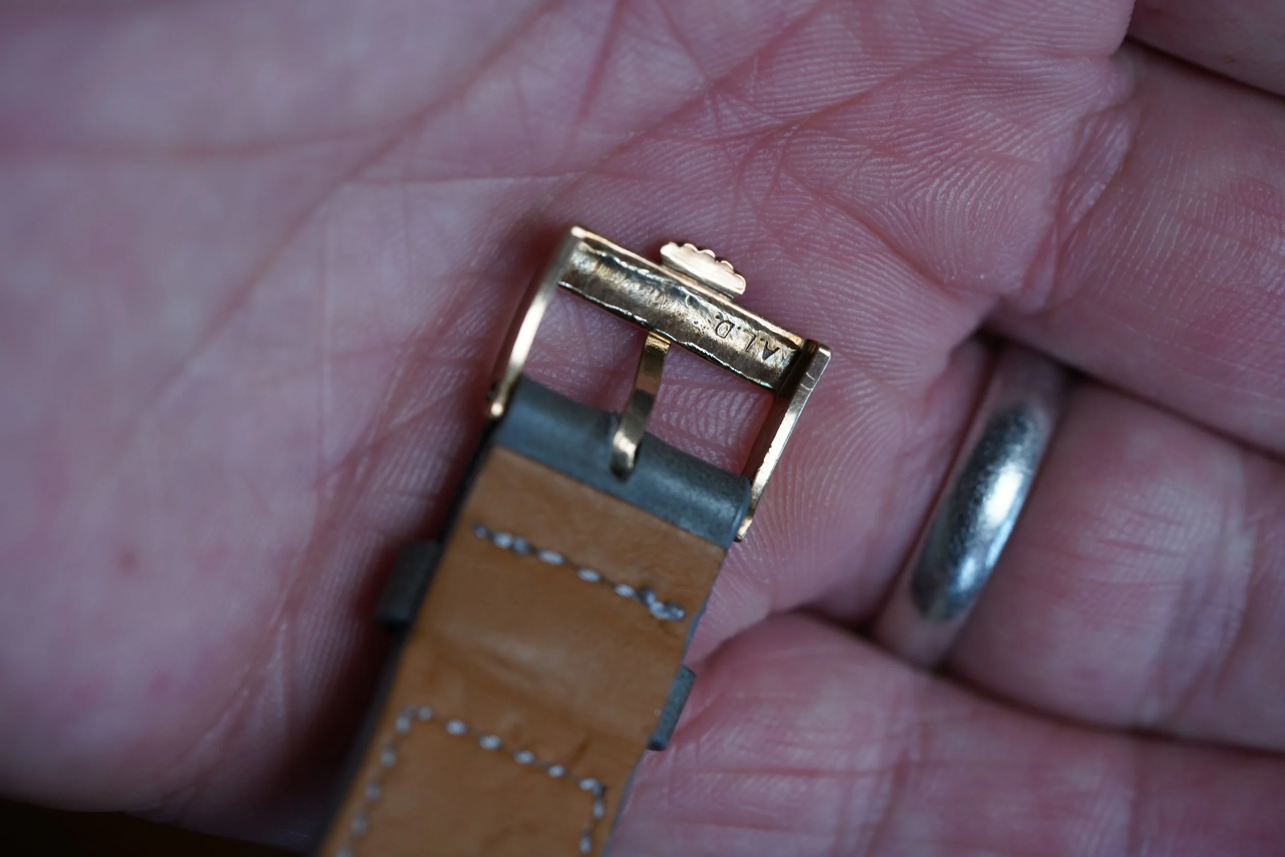 This Rolex Precision is an extremely elegant timepiece in 14K rose gold. The case appears to be unpolished and measures 34mm in diameter (42mm lug-to-lug). The watch is in spectacular condition. The case features beautiful tear drop lugs. It features very bold dauphine hands, and a non luminous dial. The watch is paired with a period correct 9K rose gold Rolex buckle with British hallmarks (that is probably $1,500 alone). The watch dates to the early 1950s.
