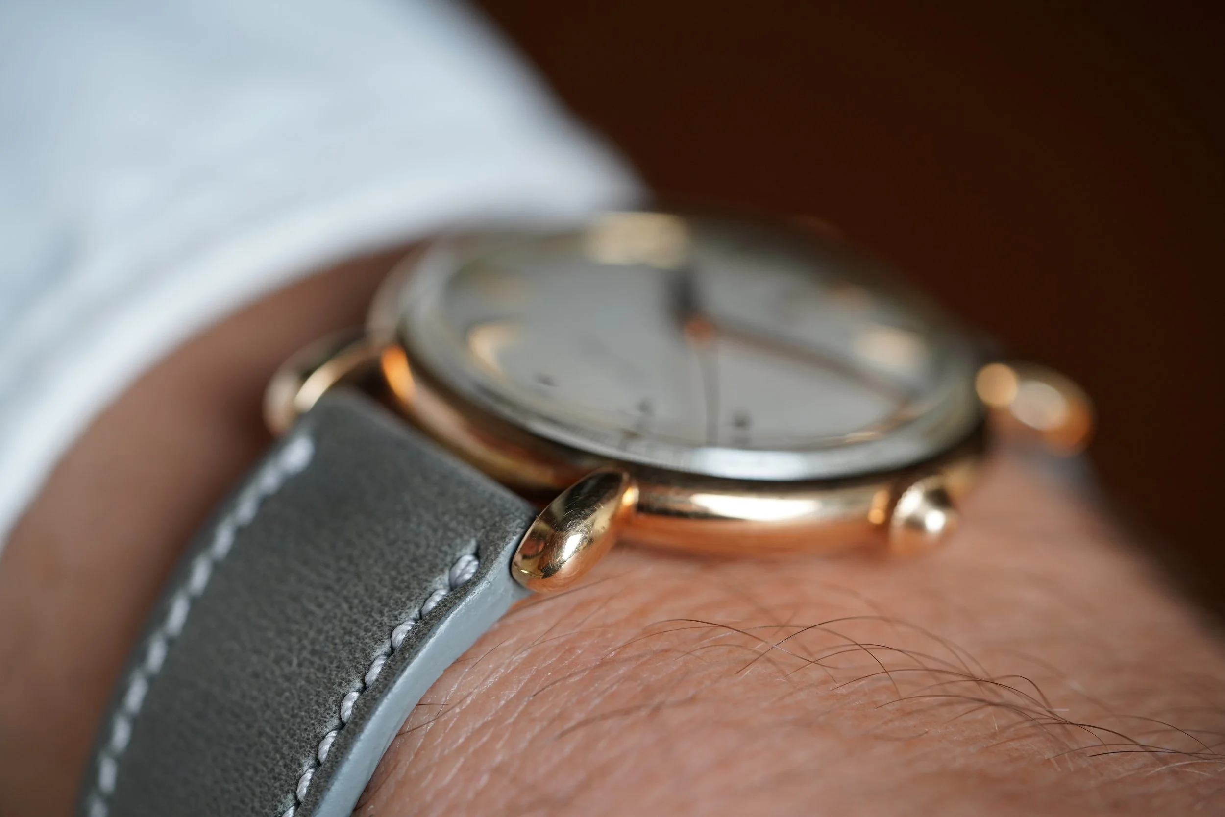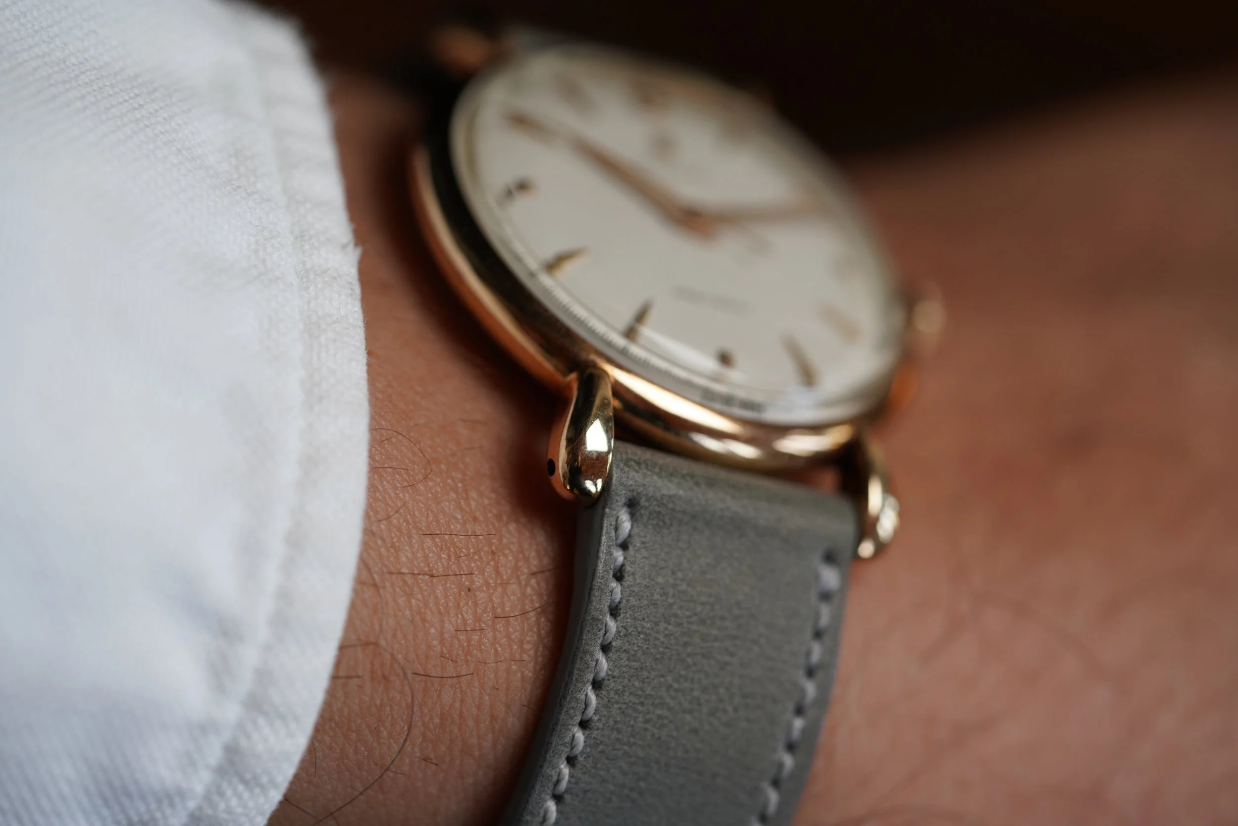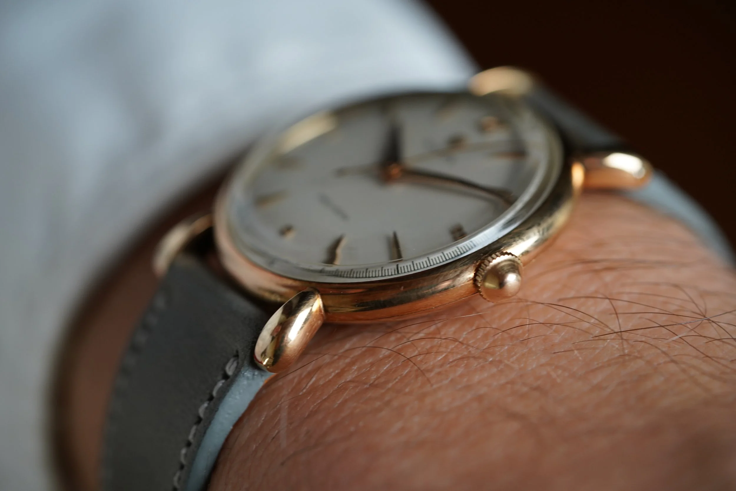 This Rolex Precision is an extremely elegant timepiece in 14K rose gold. The case appears to be unpolished and measures 34mm in diameter (42mm lug-to-lug). The watch is in spectacular condition. The case features beautiful tear drop lugs. It features very bold dauphine hands, and a non luminous dial. The watch is paired with a period correct 9K rose gold Rolex buckle with British hallmarks (that is probably $1,500 alone). The watch dates to the early 1950s.