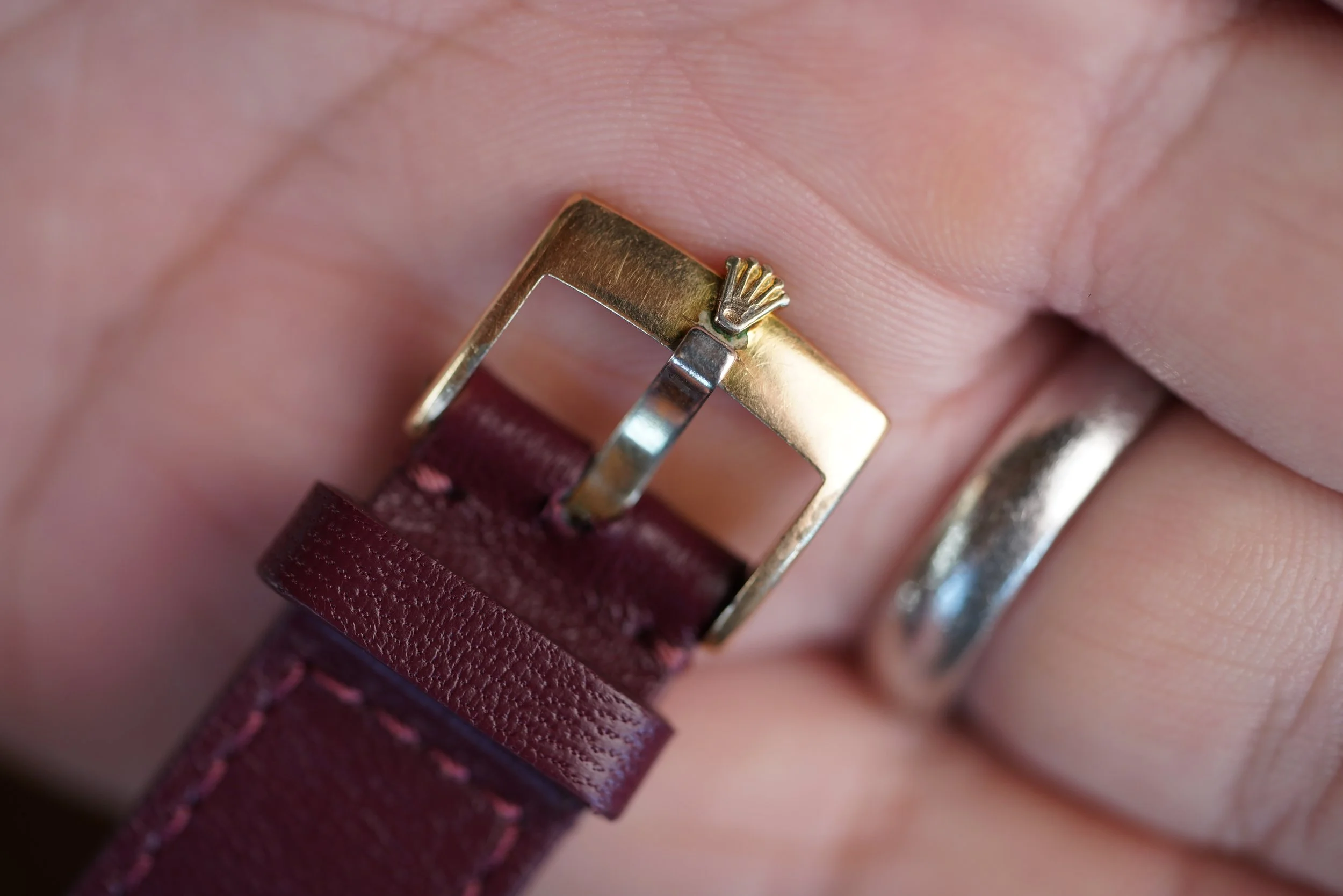 This Rolex Precision is an exquisite timepiece in 18K yellow gold. The case measures 35.5mm in diameter (42mm lug-to-lug). The dial is in great condition and features gold dauphine hands. The watch features a gold engine-turned bezel. The watch comes with a gold-plated Rolex buckle. The watch dates to circa 1950s. it features crisp hallmarks and the very rare “thimble” Rolex crown.