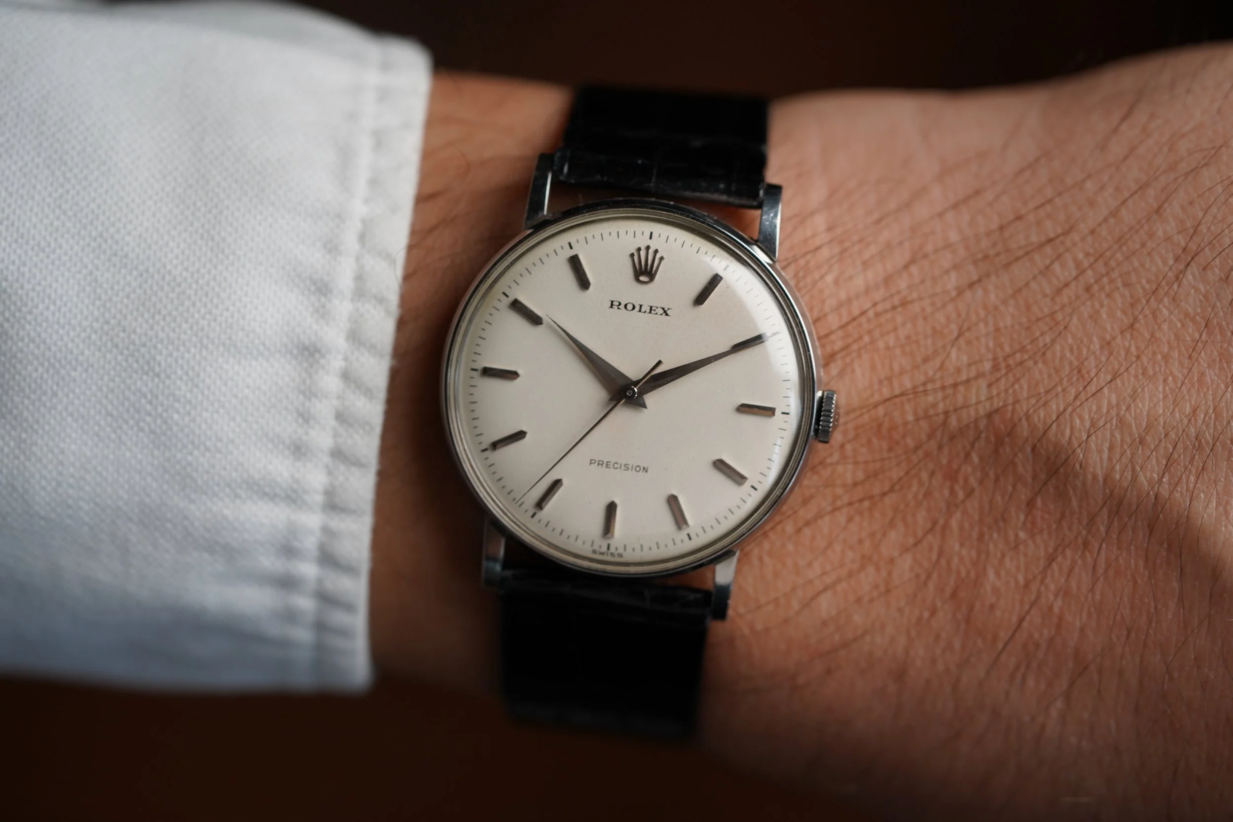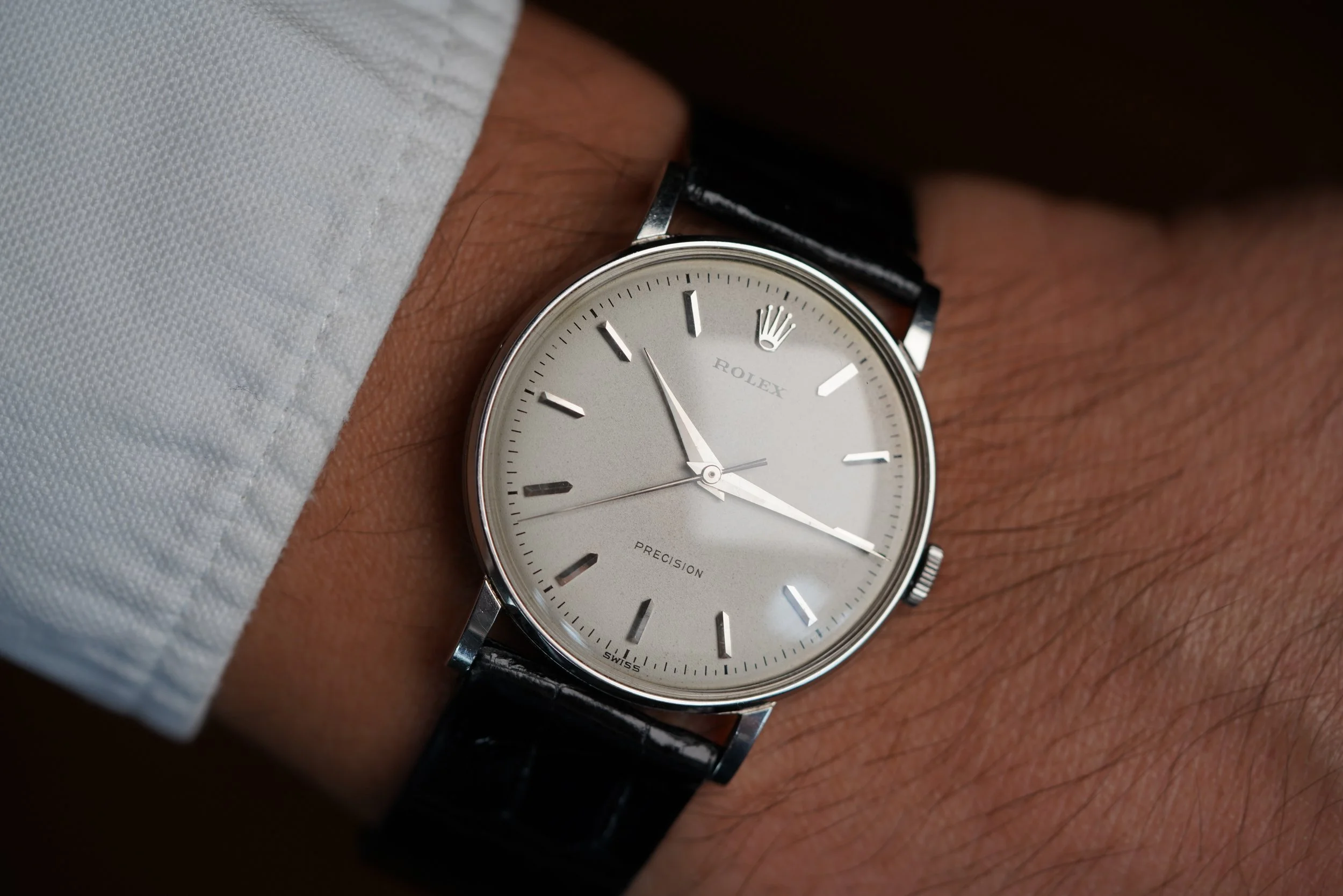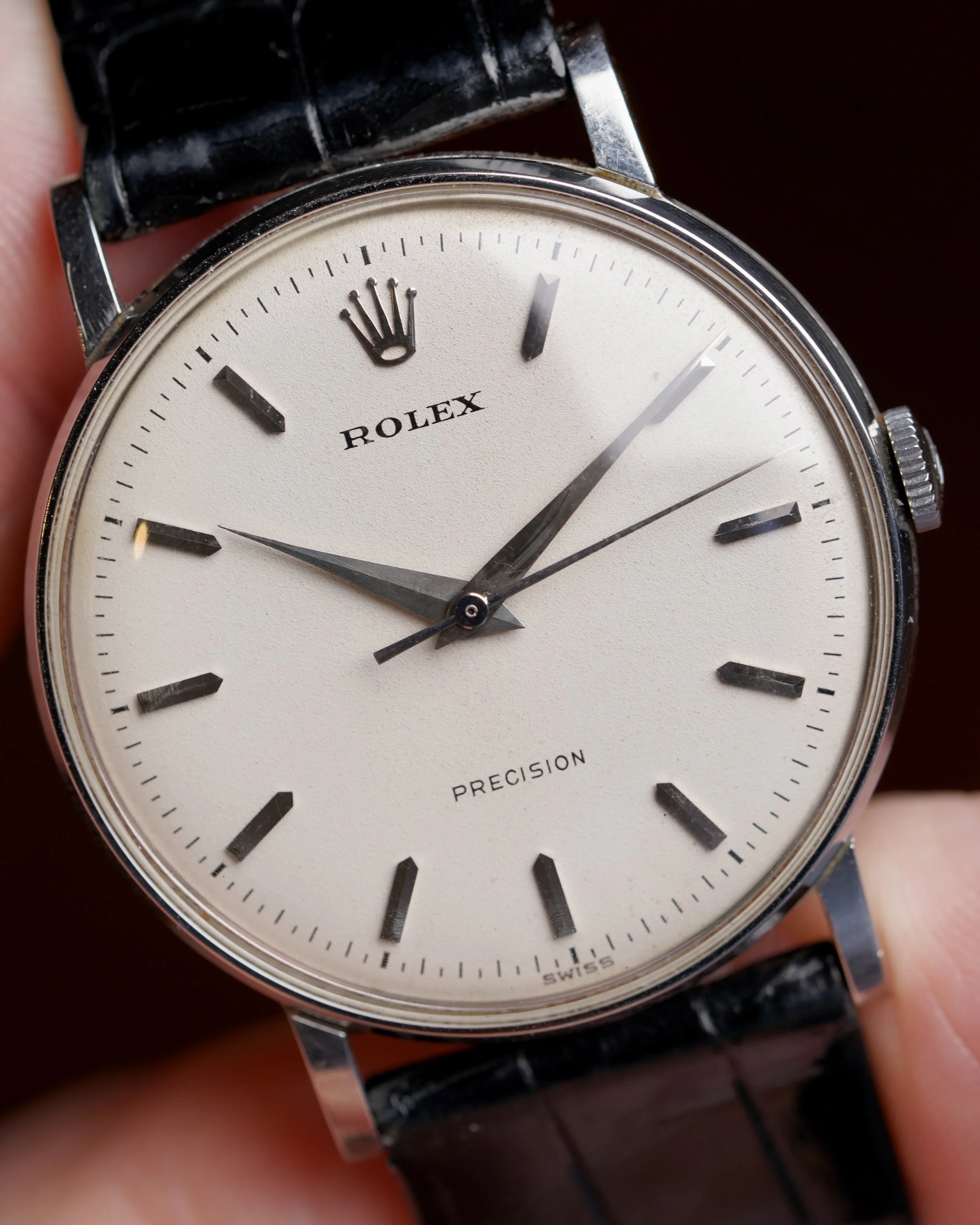 This Rolex Precision is an elegant time only dress watch in stainless steel. The case is in fantastic condition, appears unpolished and measures 34mm in diameter (approximately 41mm lug-to-lug). The non-luminous dial is very nice and the watch features bold dauphine hands. It is paired with a Rolex strap and stainless steel buckle. The watch dates to circa 1966.