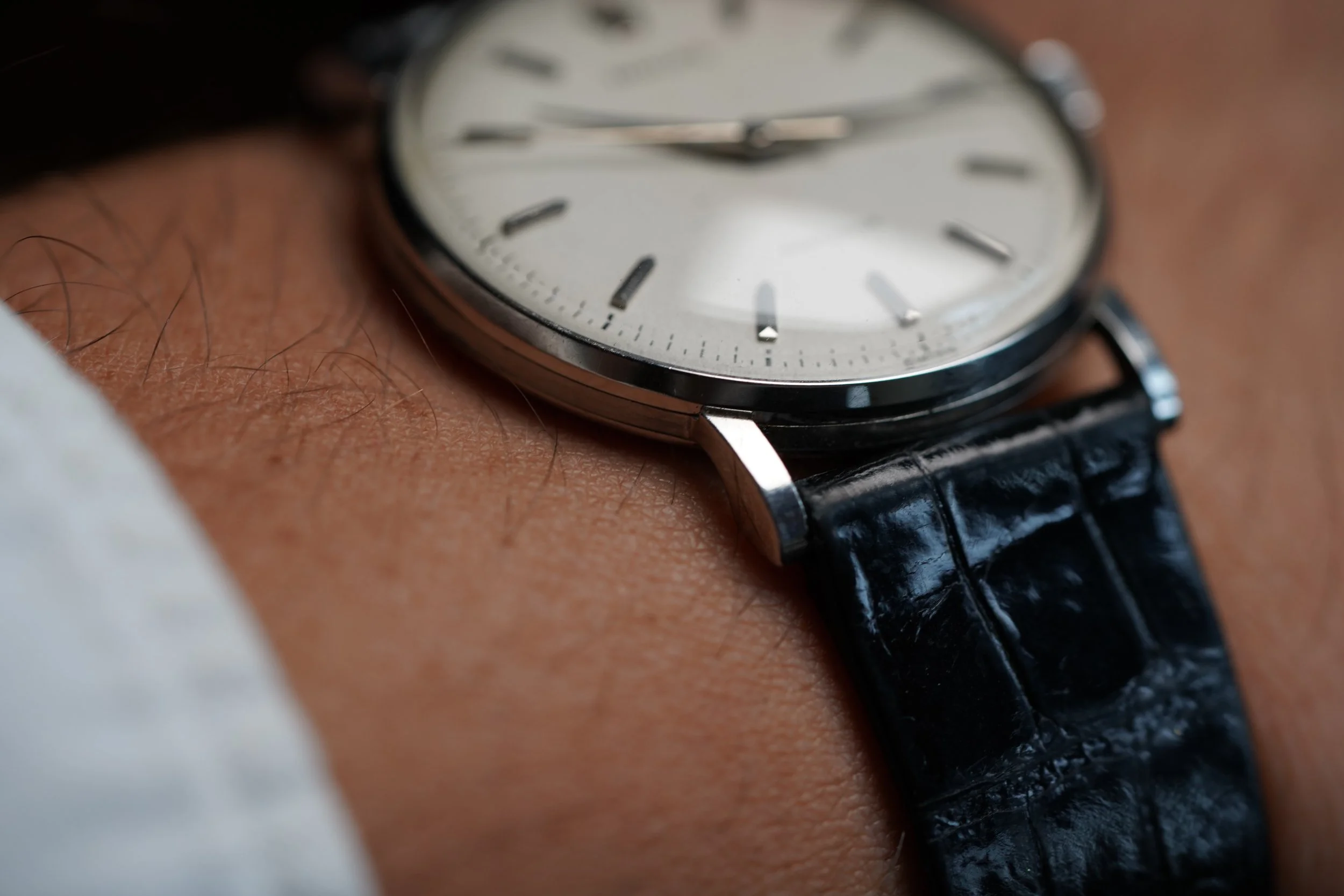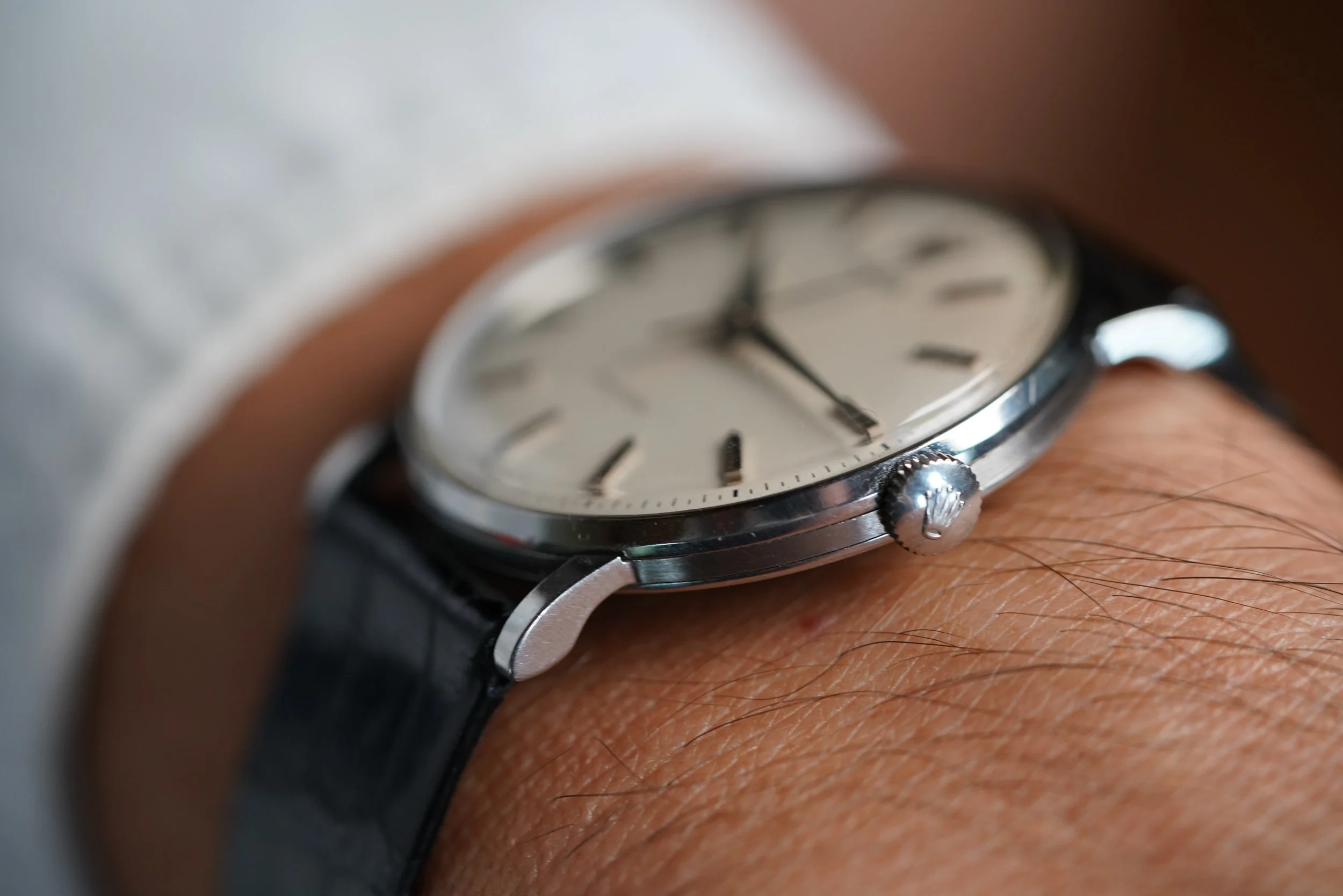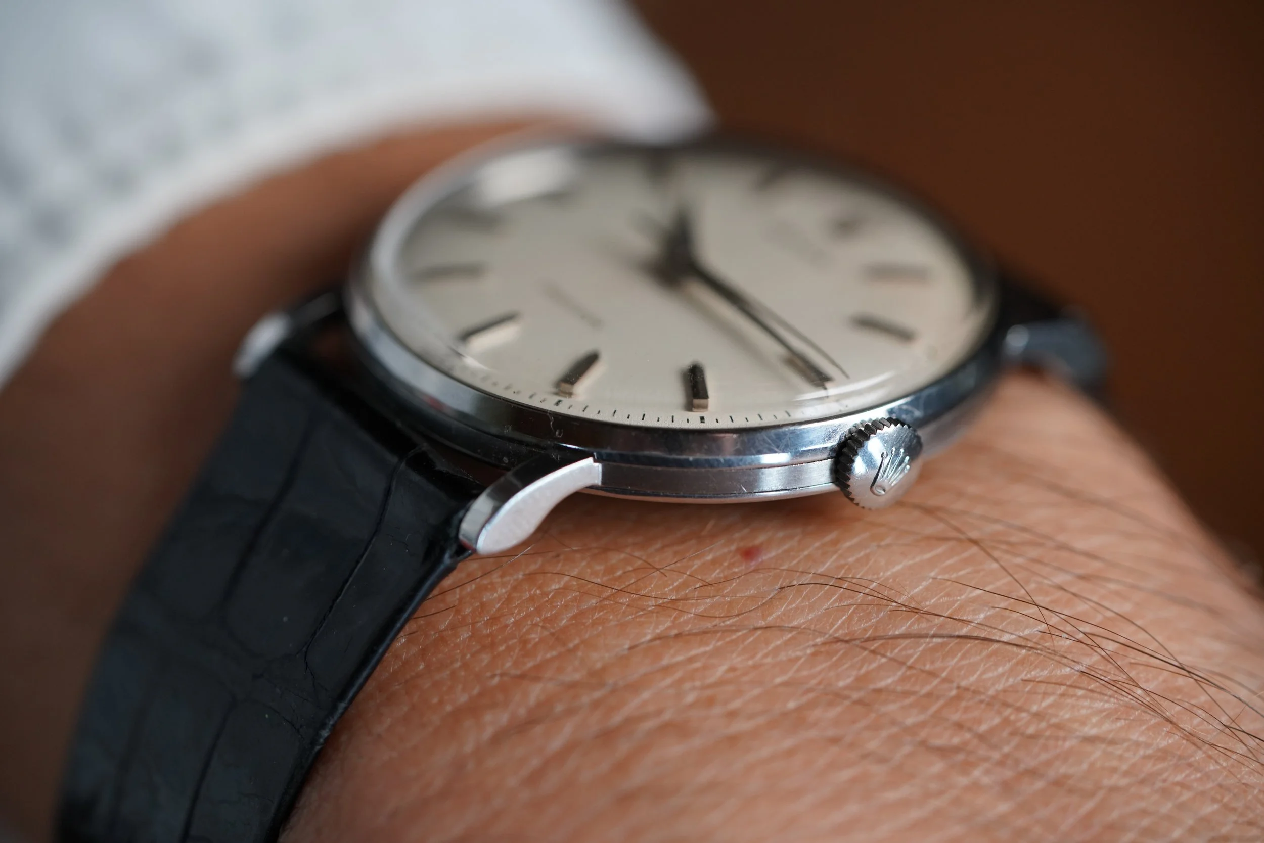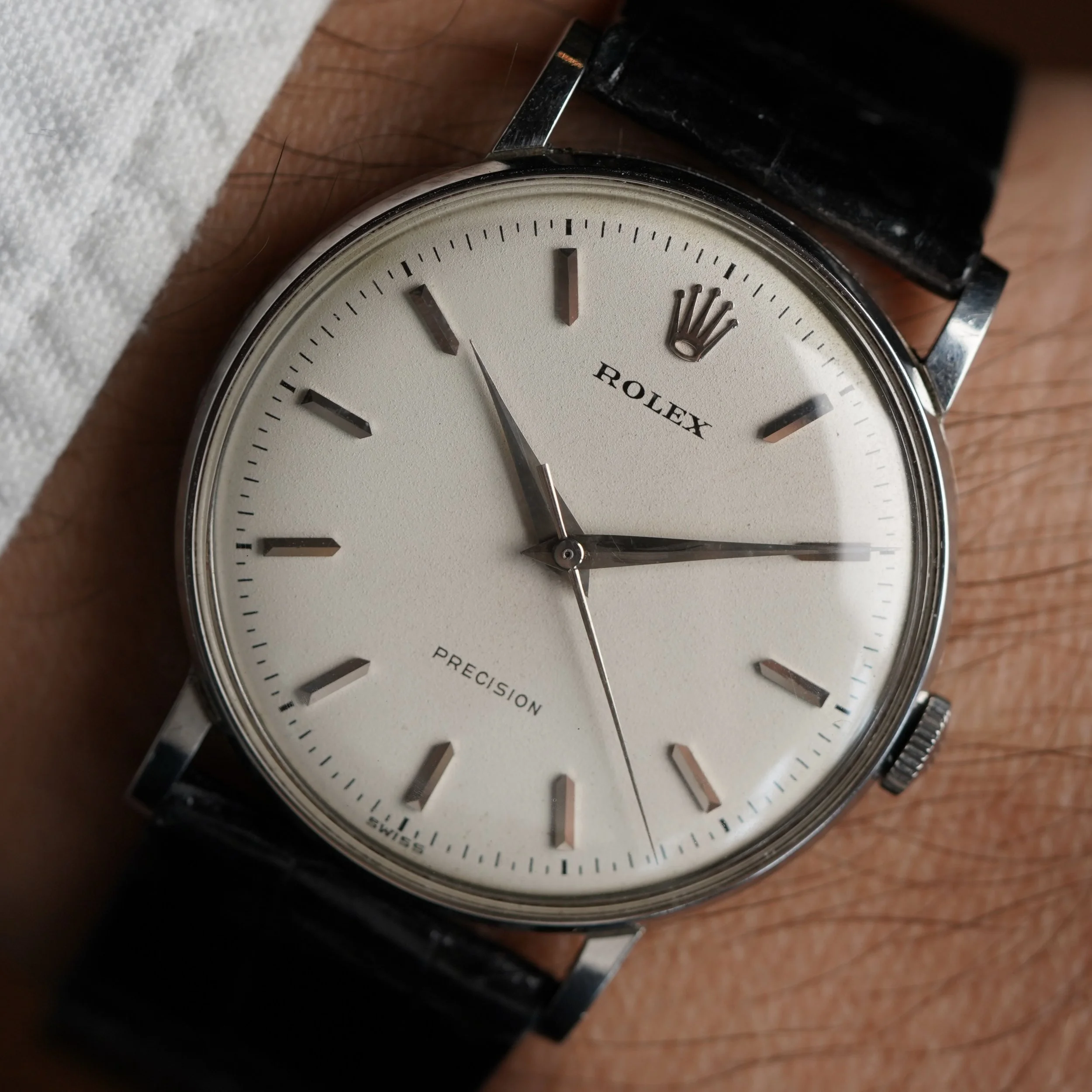 This Rolex Precision is an elegant time only dress watch in stainless steel. The case is in fantastic condition, appears unpolished and measures 34mm in diameter (approximately 41mm lug-to-lug). The non-luminous dial is very nice and the watch features bold dauphine hands. It is paired with a Rolex strap and stainless steel buckle. The watch dates to circa 1966.