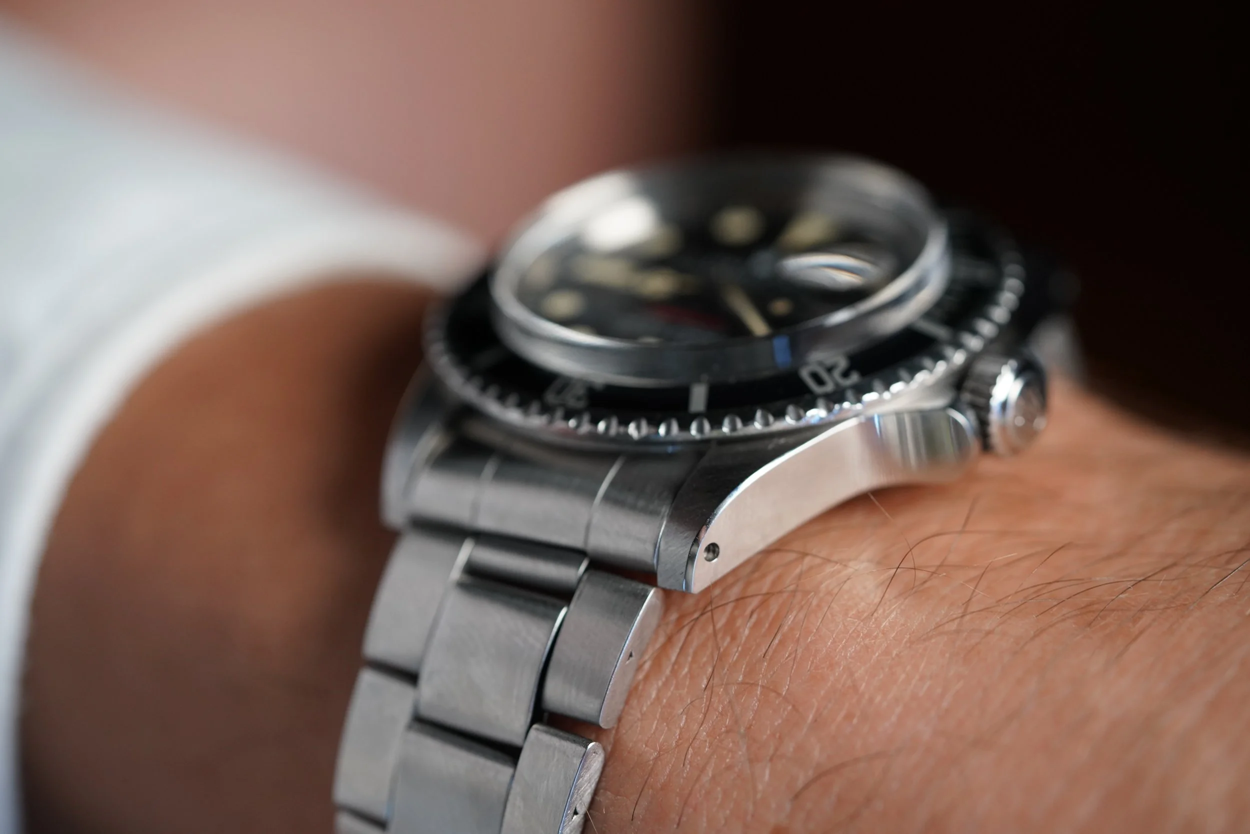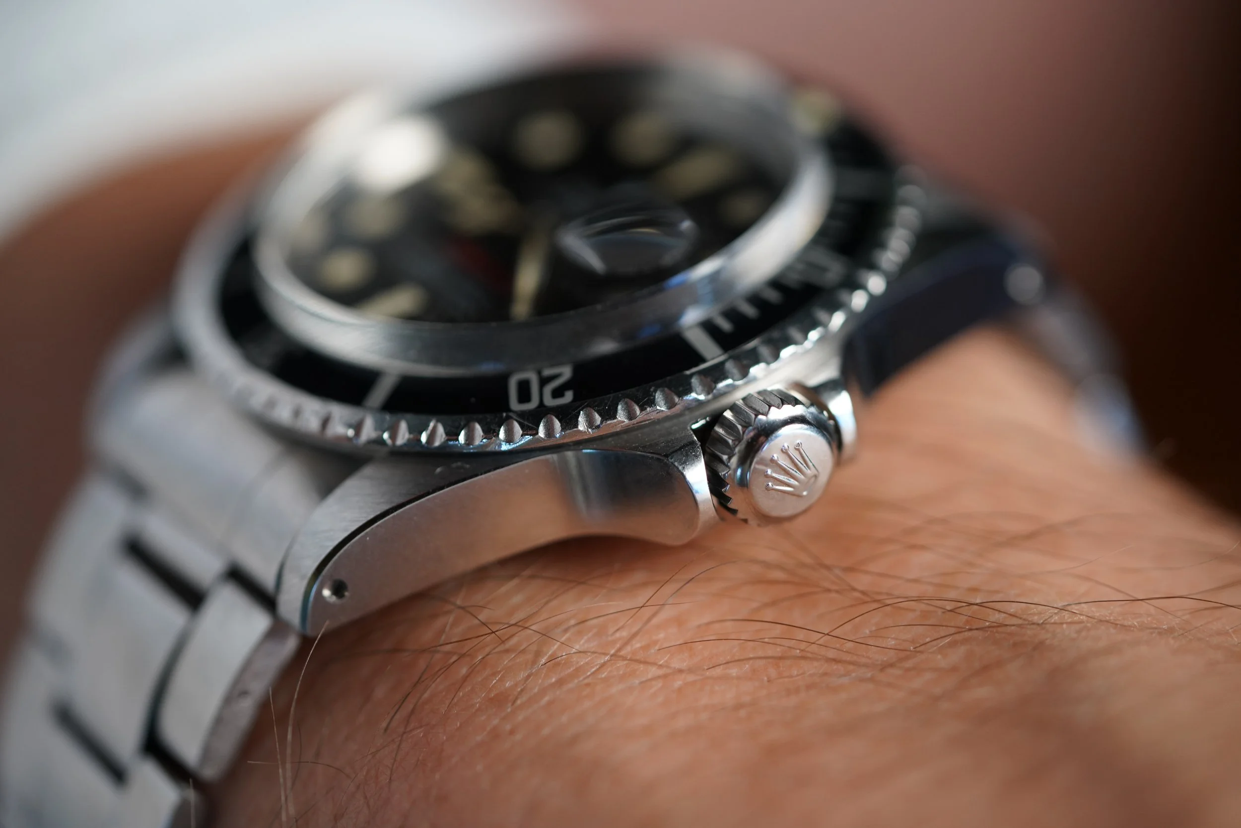 The dial is an attractive example with slightly tropical color. It features Submariner in red writing along with tritium luminous plots that have turned warm with patina. The case has been polished.