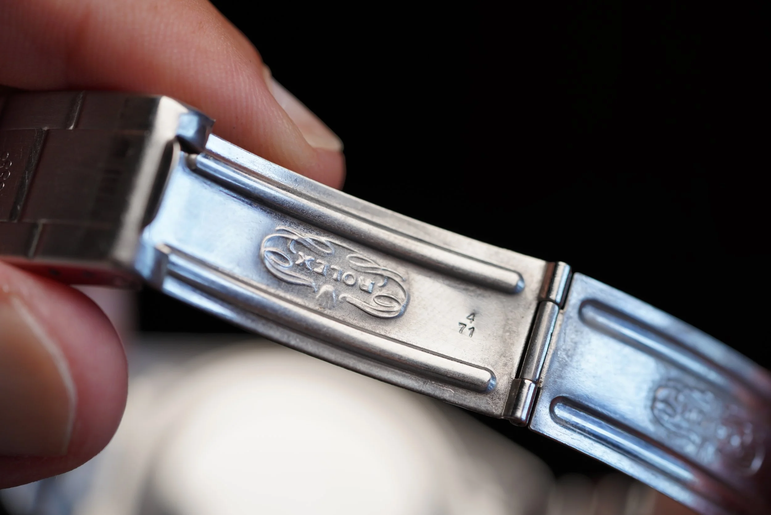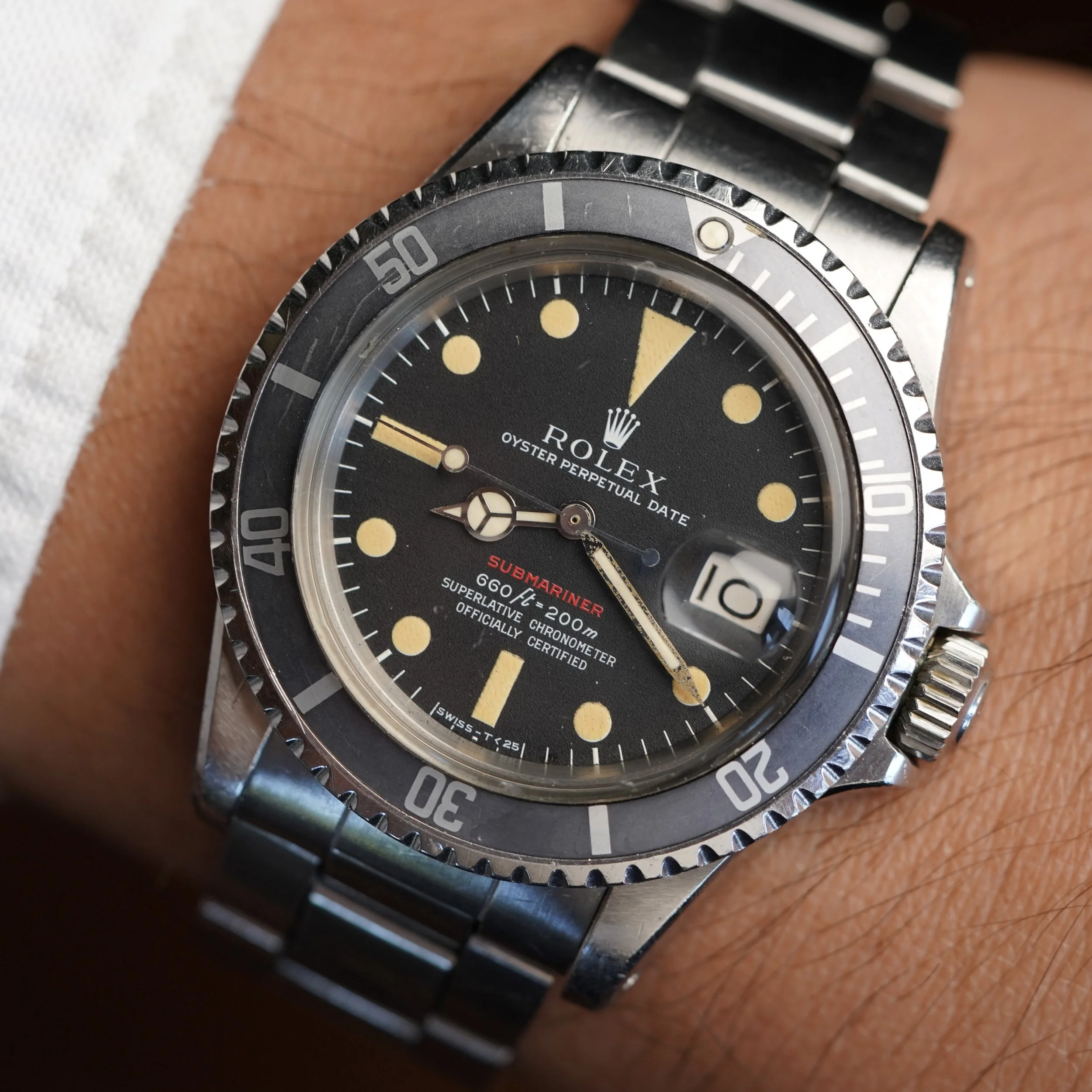 This Rolex Submariner reference 1680 is a very cool sports watch dating to circa late 1972 with a 2.701M serial. The case appears to be unpolished.. The dial, minute and hour hand all have the original lume which is a nice attractive color. It is paired on a folded link bracelet dating to circa 1971 which is likely original. The bezel insert has a nice faded grey which looks incredible.