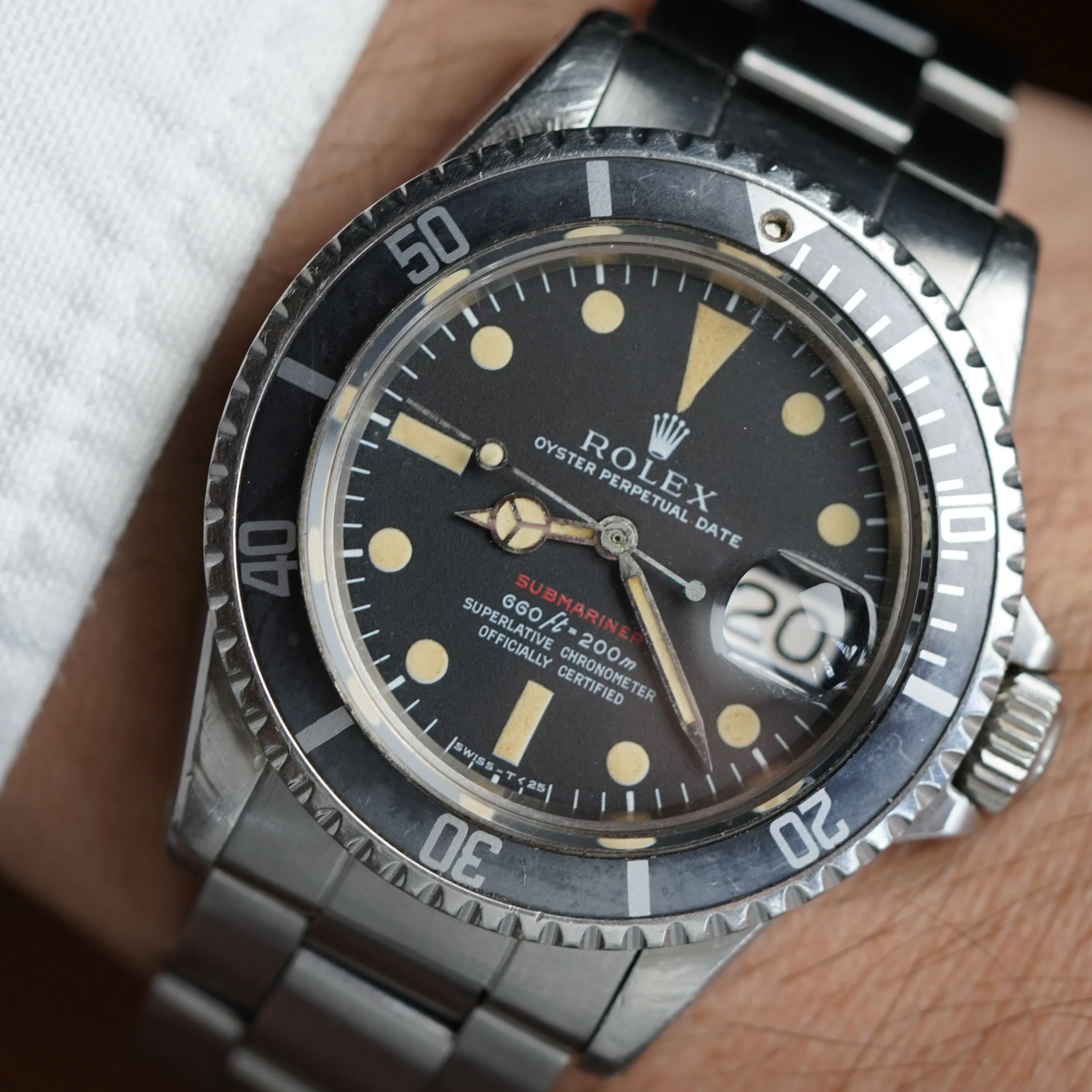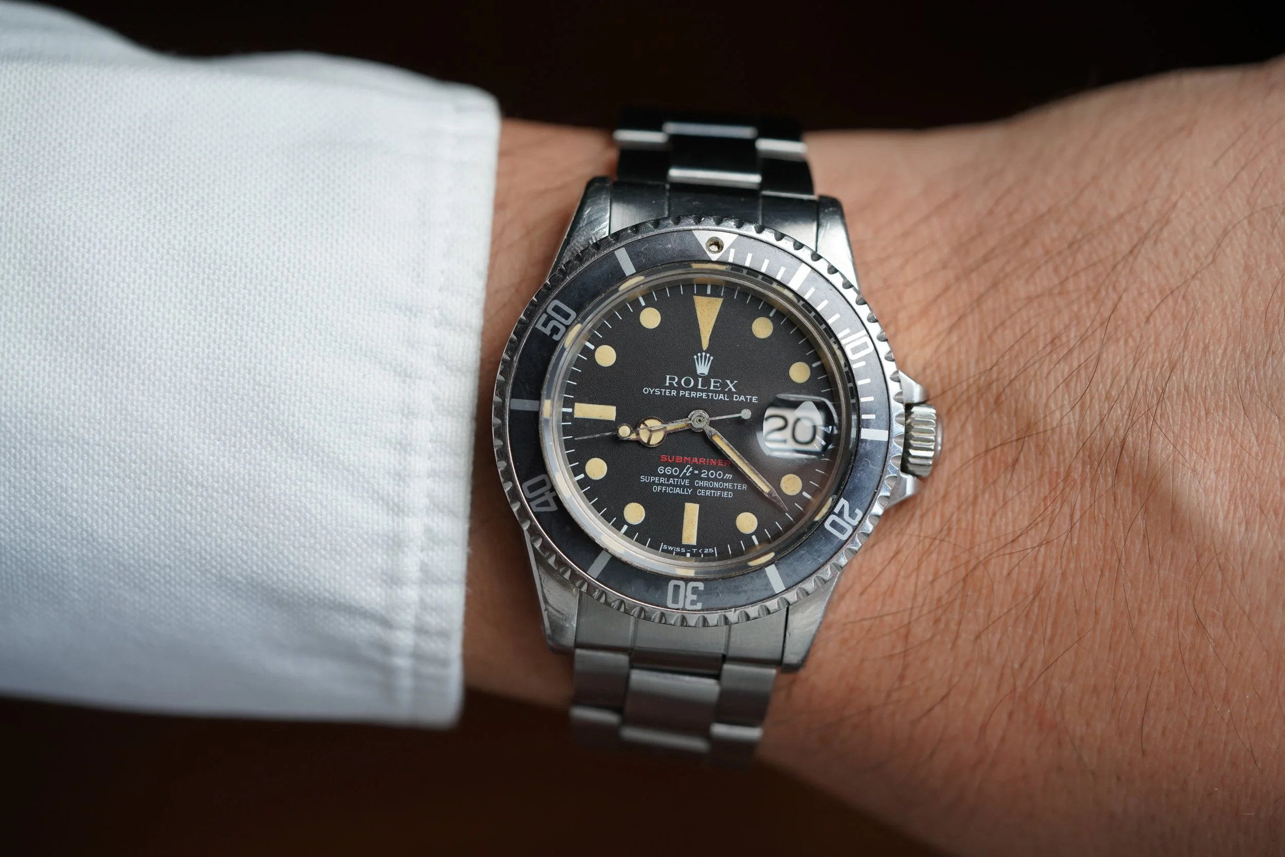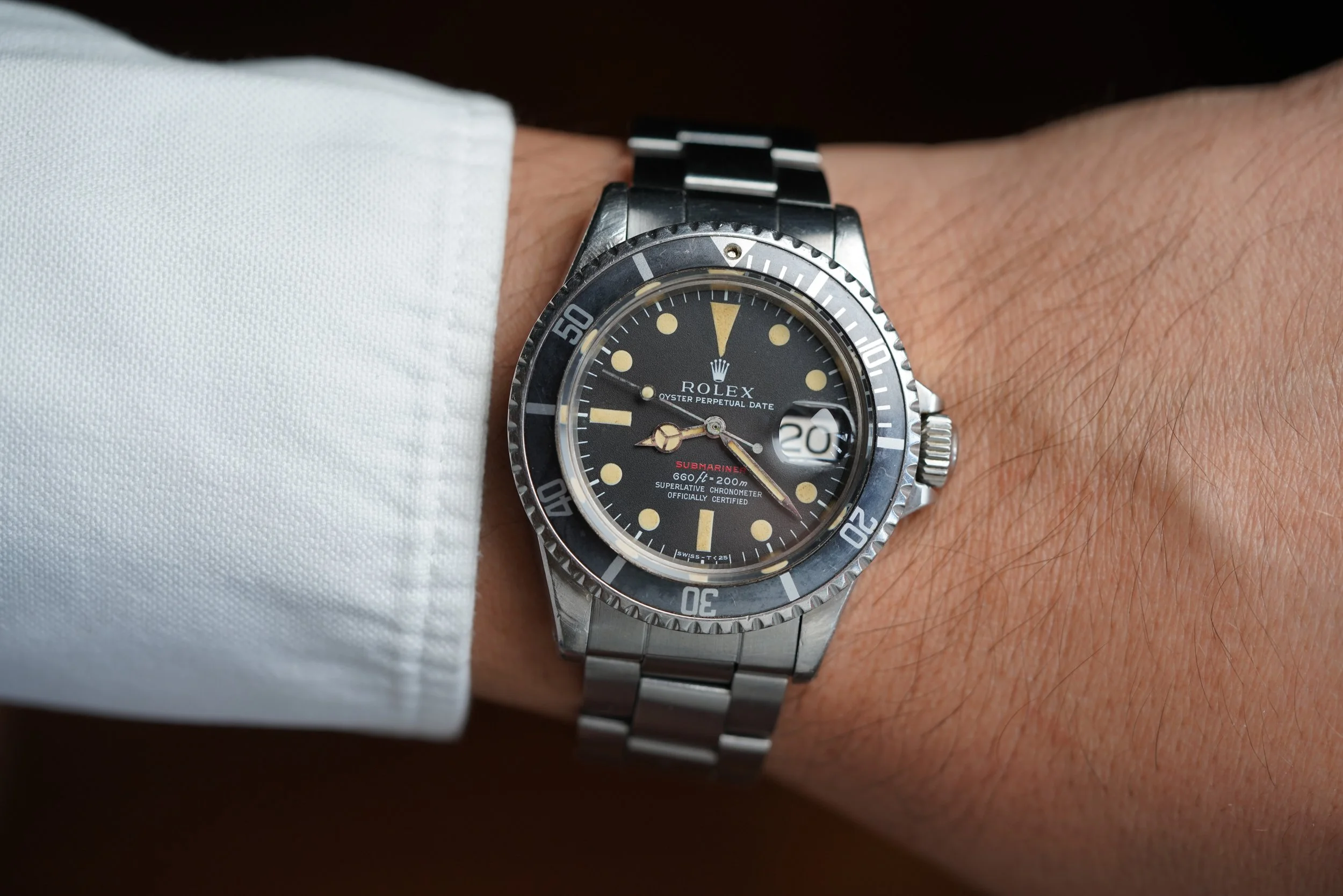 This Rolex Submariner reference 1680 is an attractive example. It is a fantastic sports watch dating to circa 1970 with a 2.38M serial. It is an incredible Red Sub! The case appears to be has been polished. The watch has the original lume which is quite attractive. It is paired on a firm 9315 bracelet with the rare patent pending extension clasp with 280 end links dating to 1970.
