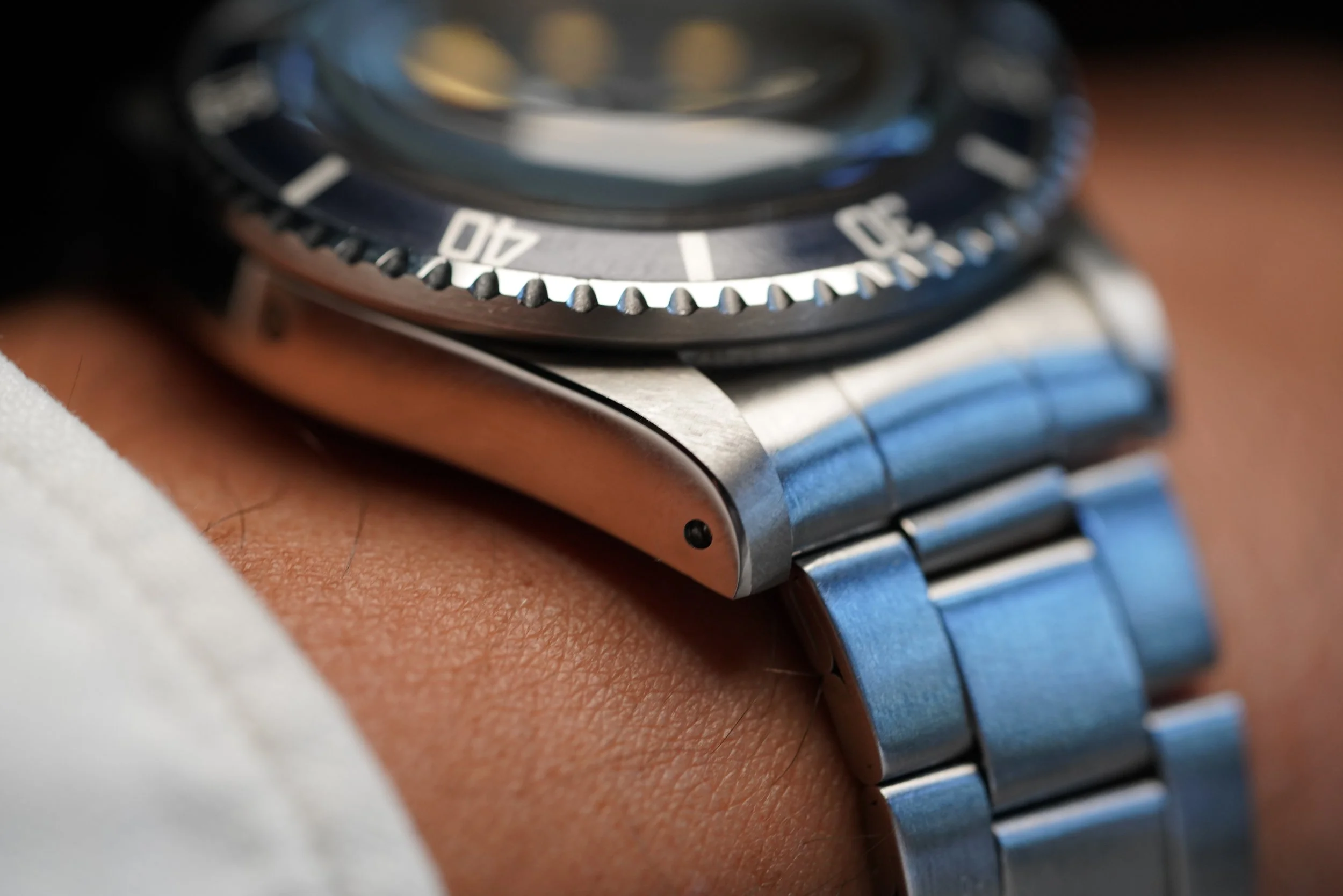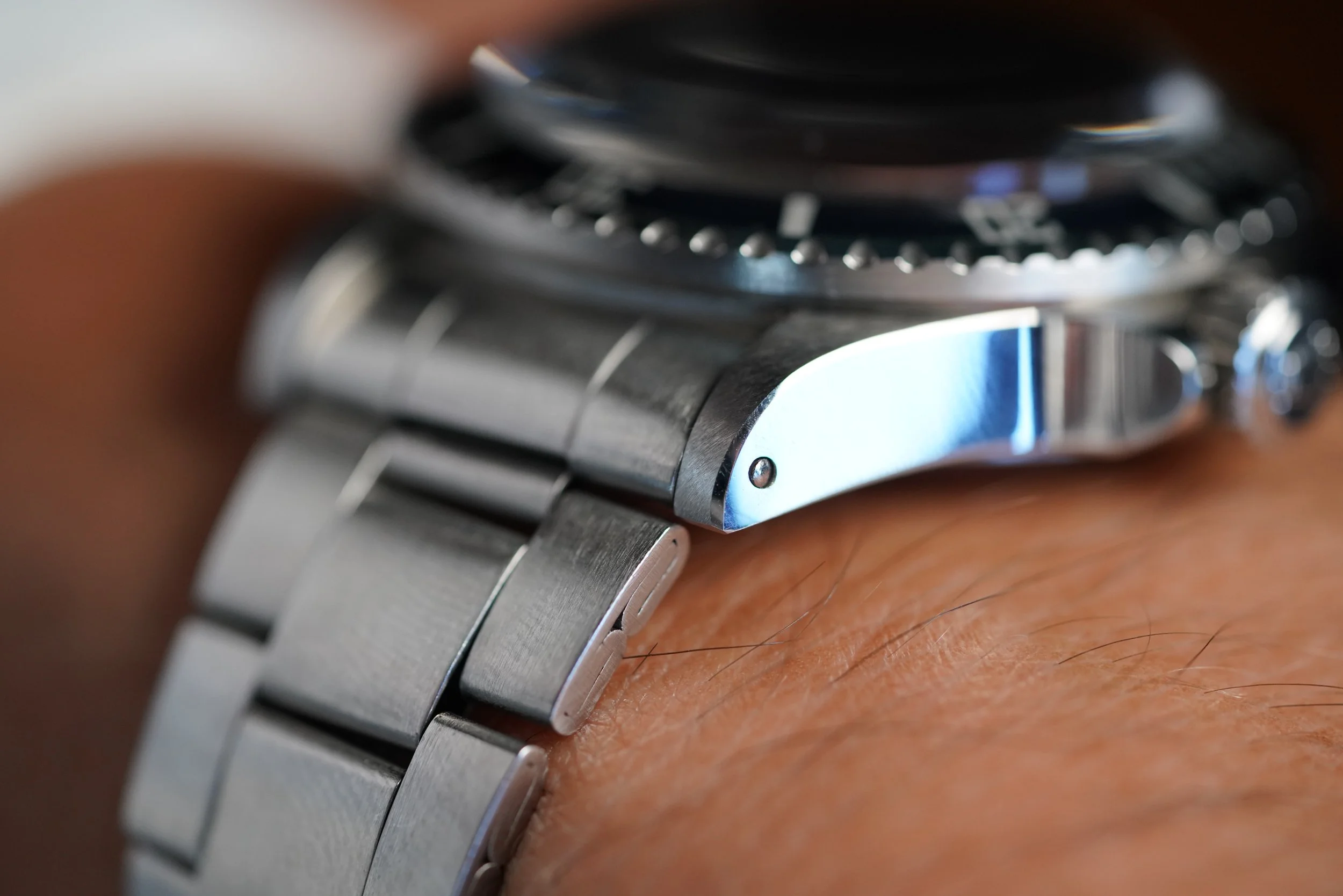 The case and bracelet have been polished. The lug-to-lug length is 47mm and it measures 40mm in diameter excluding the crown. It features the Mk I dial.