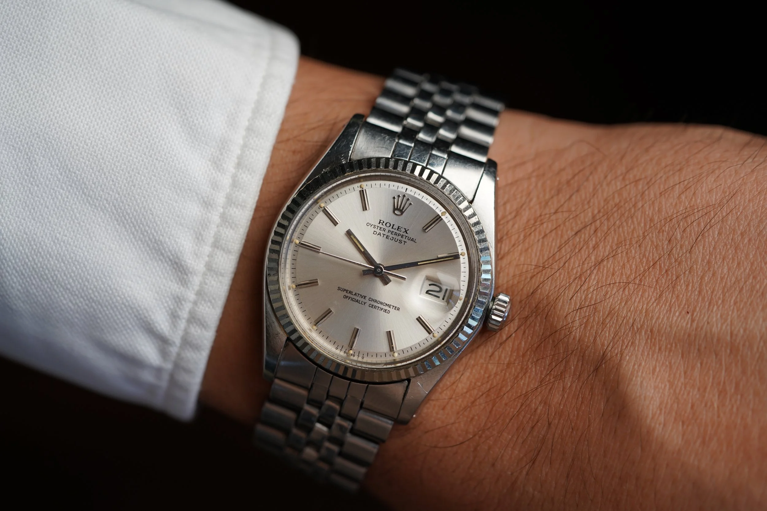 This Rolex Datejust reference 1601 is a superb timepiece. The case measures 36mm in diameter (42mm lug-to-lug). The case appears to be unpolished. It features a Sigma dial. The dates to circa 1975 with a 3.87M serial.