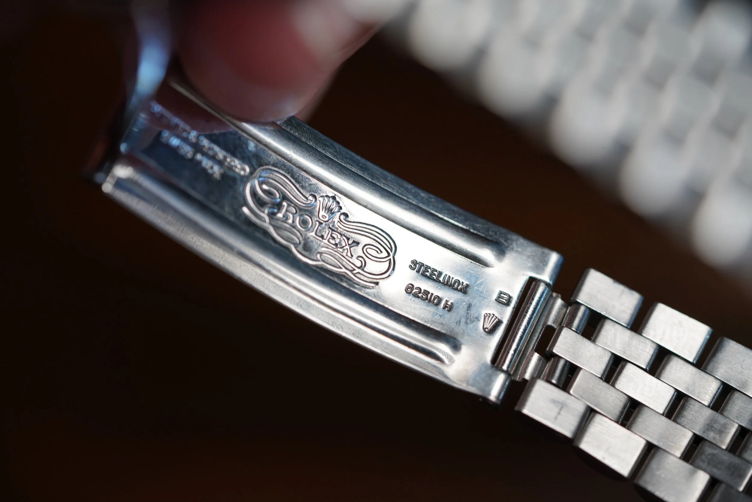 This Datejust features a silver “soleil” dial. This watch dates back to 1979 with a 5.8M serial. It measures 36mm in diameter. The Rolex Jubilee 62510H bracelet features a B date code dating to 1977. It features 555 end links.