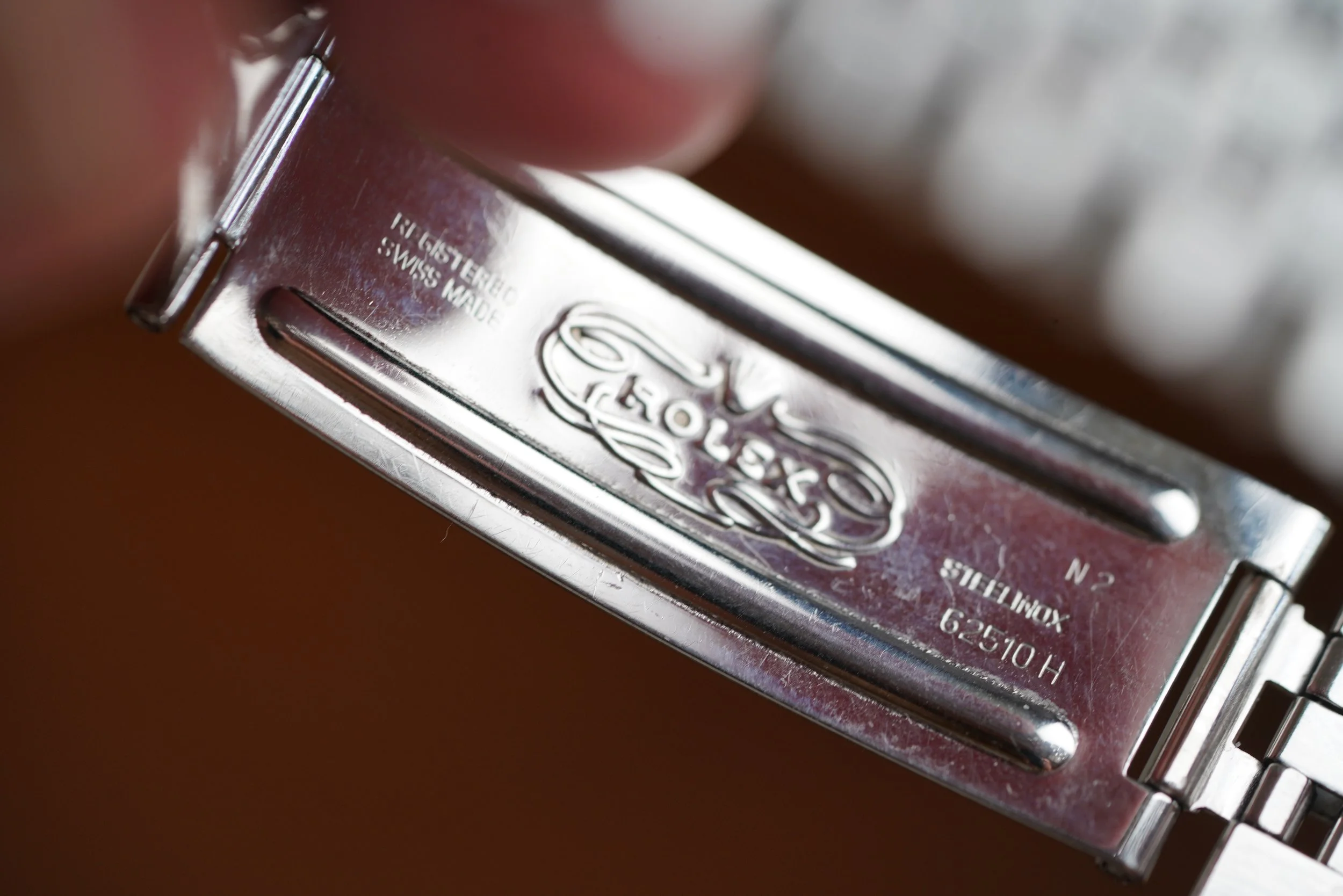 The watch dates to circa 1988 and features an R8 serial. The case measures 36mm in diameter and is paired on a 62510H Rolex Jubilee bracelet and 555B end links. It features a beautiful silver soilel dial. This watch features a quick-set date movement.