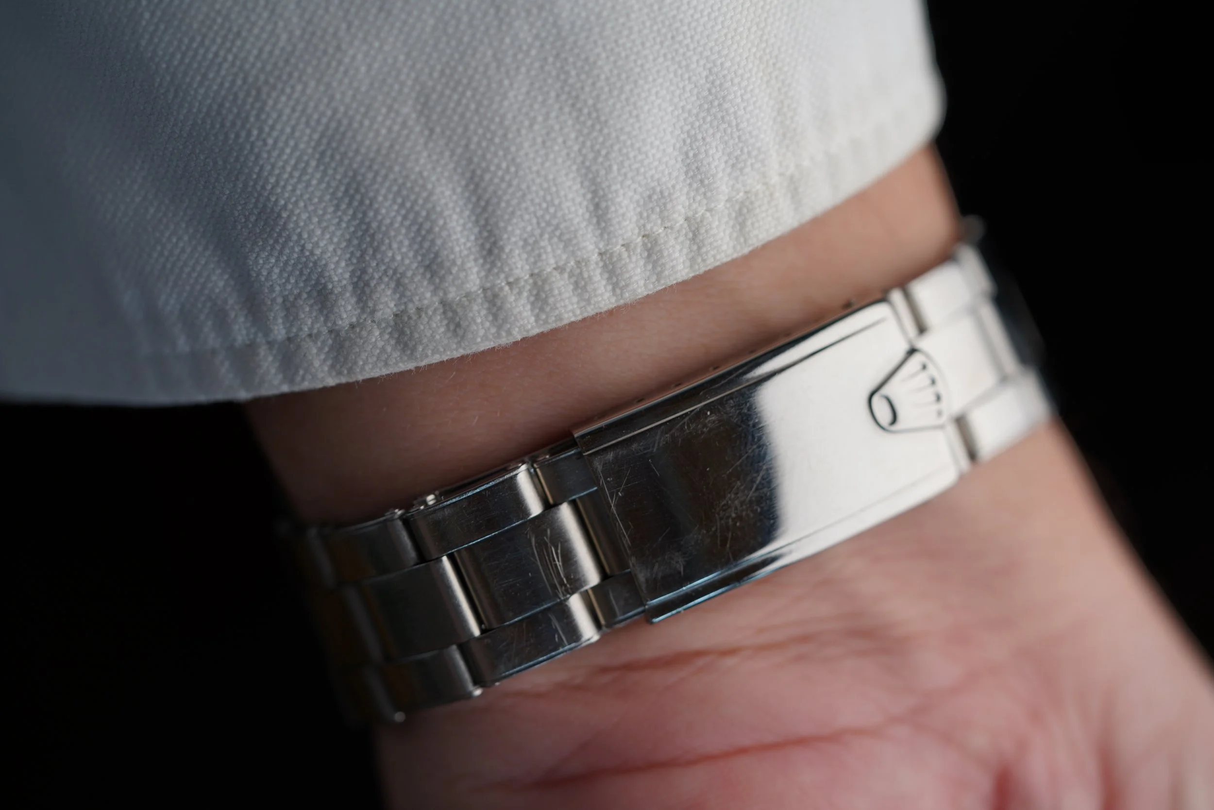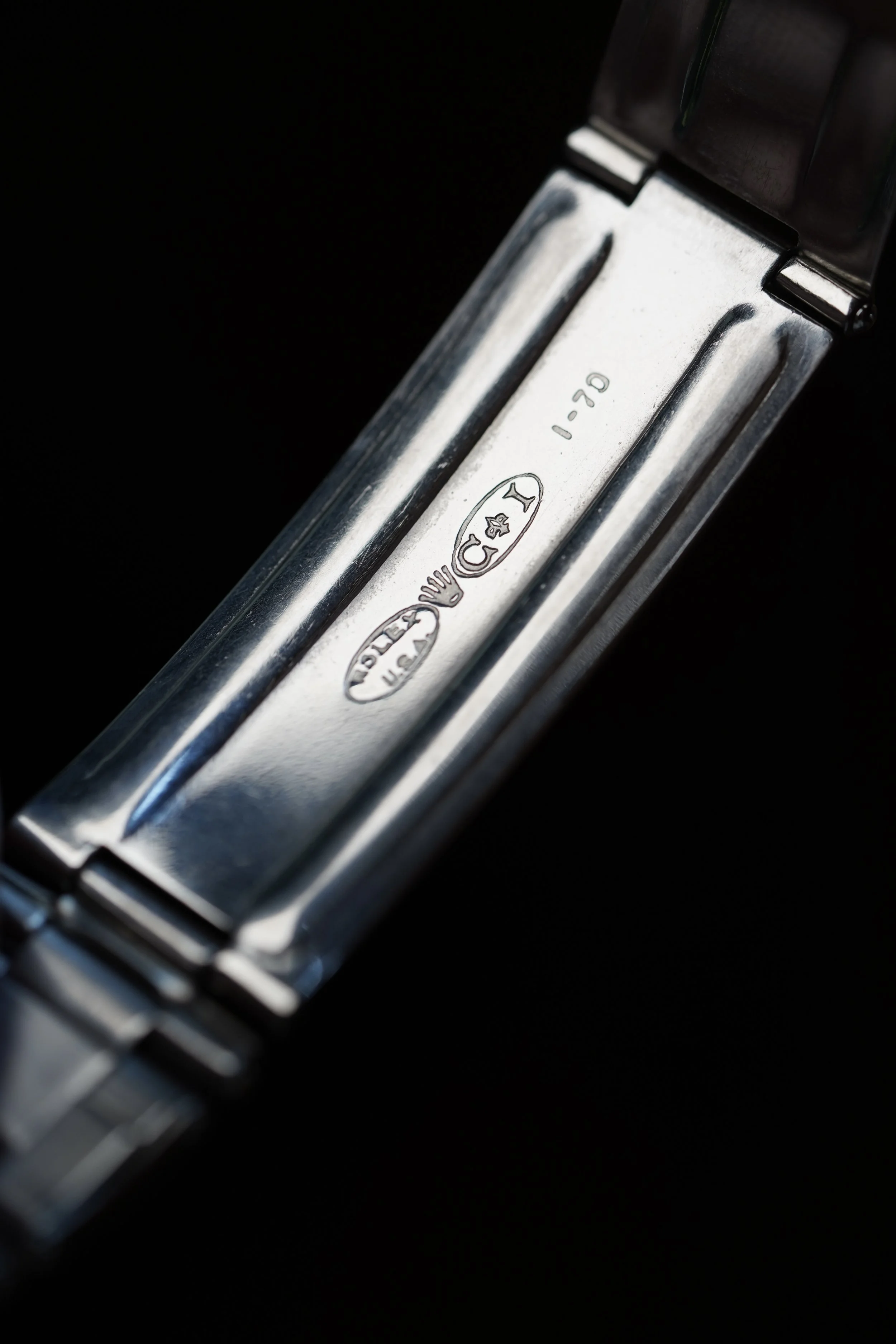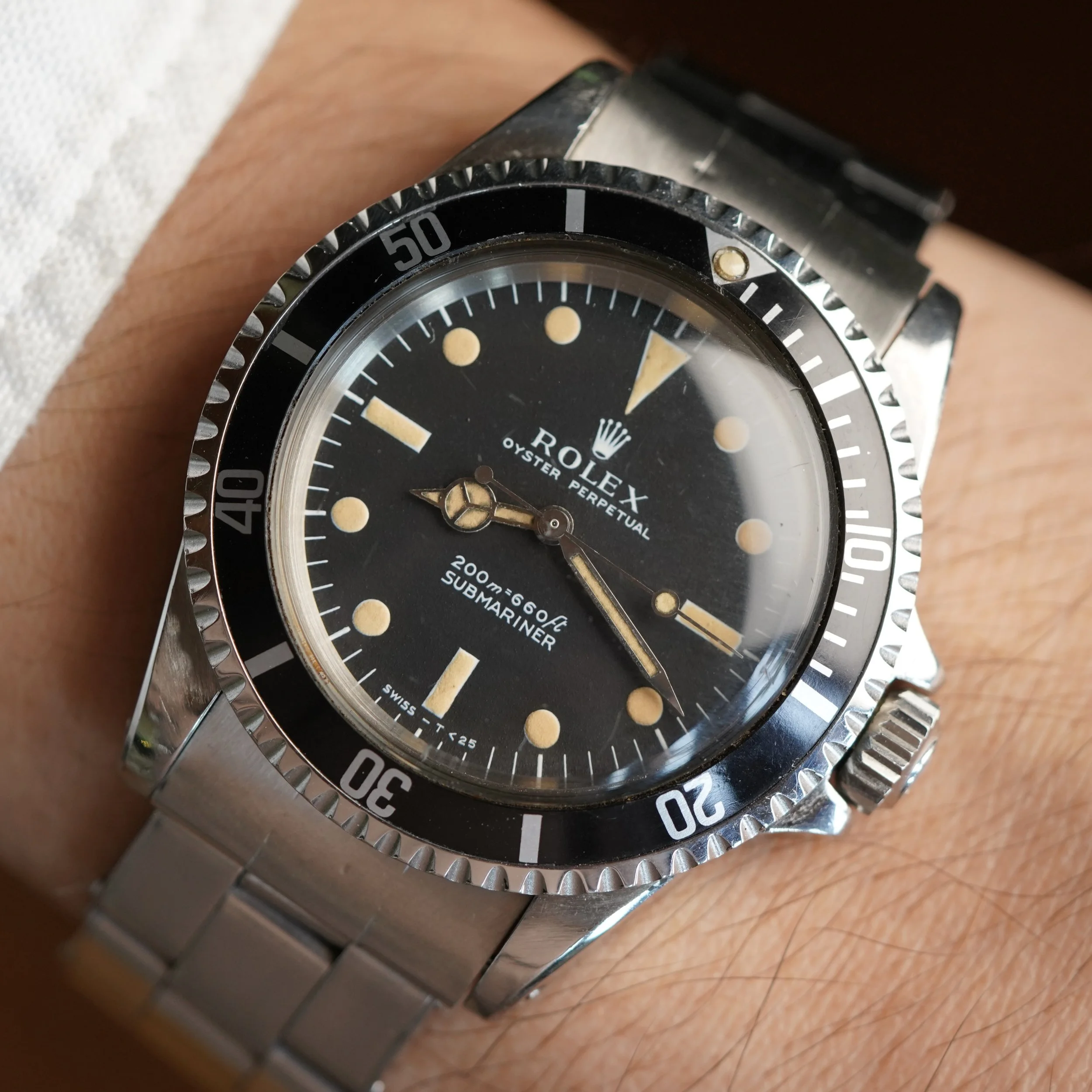 The Rolex Submariner is one of the most iconic watches of all time. This reference 5513 features a 1.81M serial number dating to circa 1968. It is paired with a Rolex C&I rivet bracelet dating to 1970. This example features a “meters first” matte dial. The case has been polished.