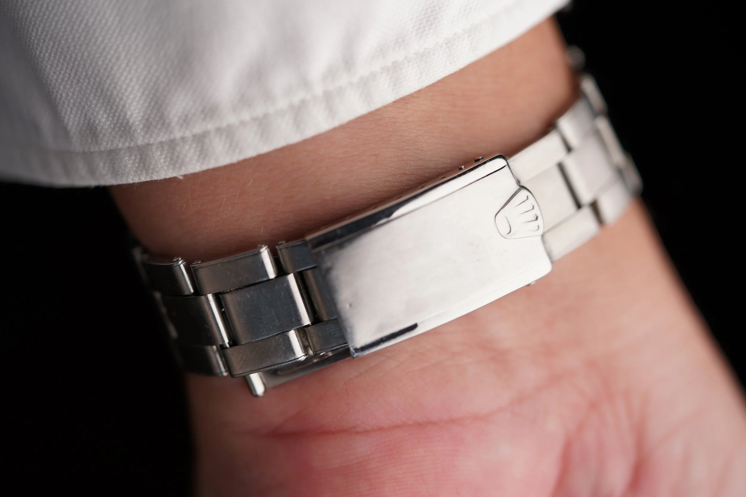 It features a gilt dial. The case has been polished. It is paired on a later Rolex C&I bracelet. The bracelet has been polished. The dial and hands have been relumed. The bezel insert is a later replacement. the case tube and crown are later service replacement parts.