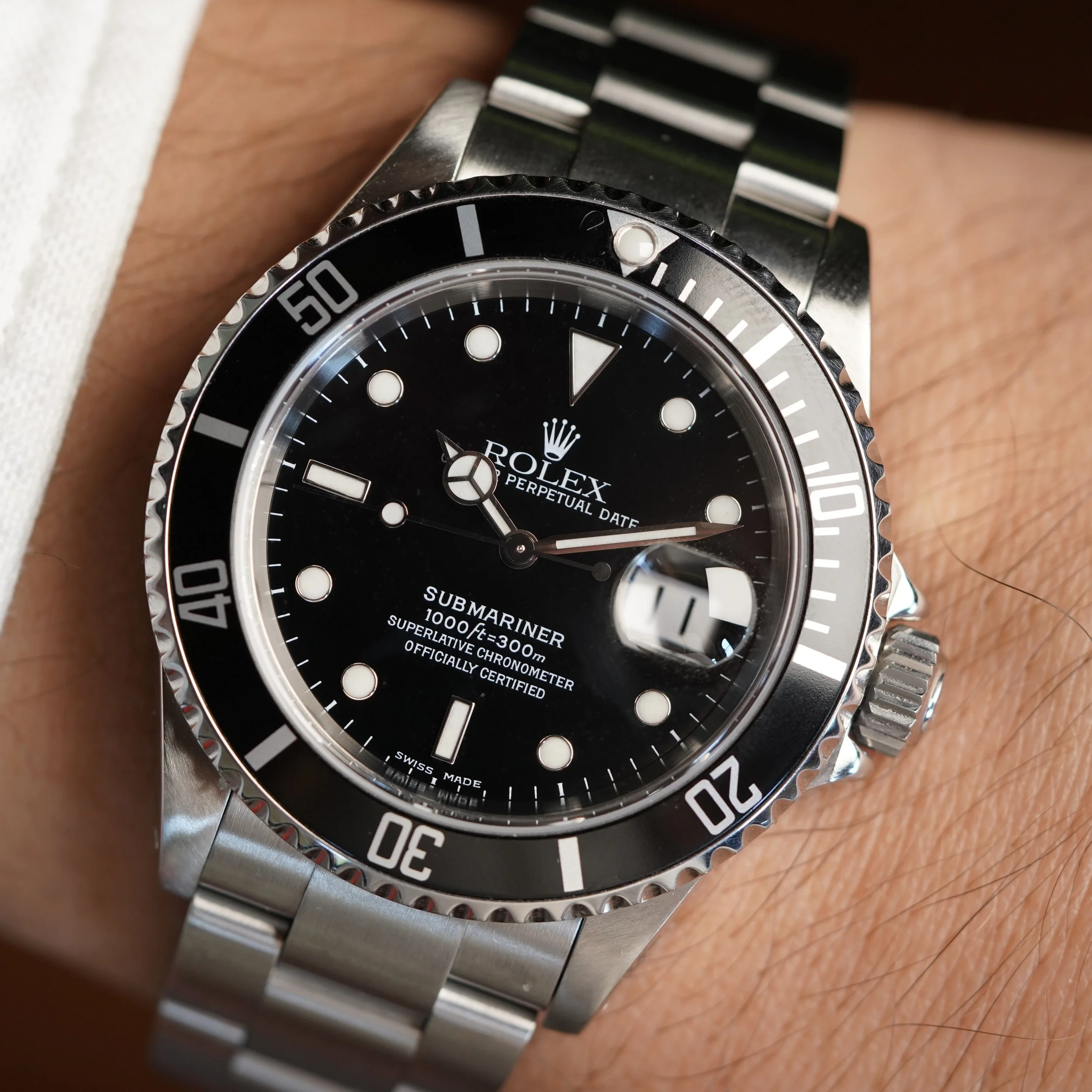 The Rolex Submariner is one of the most renowned sports watches of all time. This 16610 features a K serial number and is paired with a reference 93250 Oyster bracelet, with a DE date code. This reference features a black bezel, dial and a date window at the 3 o'clock position. The case and bracelet have been polished in the past.
