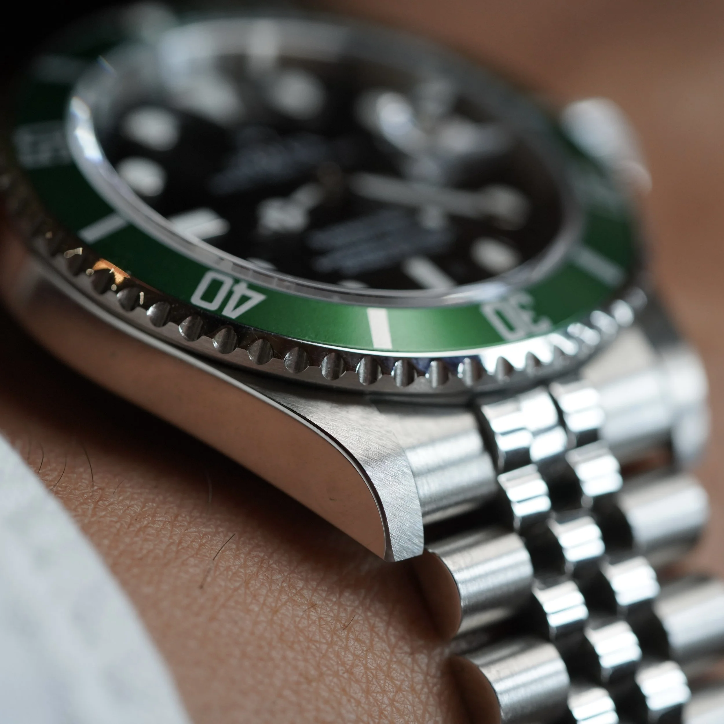 The Rolex Submariner is one of the most renowned sports watches of all time. This 16610LV features an M serial number and is paired with a “super” Jubilee bracelet with hidden clasp. This reference features a green bezel, a black dial and a date window at the 3 o'clock position. The watch is in incredible condition and appears to be unpolished. The watch comes with an additional oyster bracelet that is fully stickered.