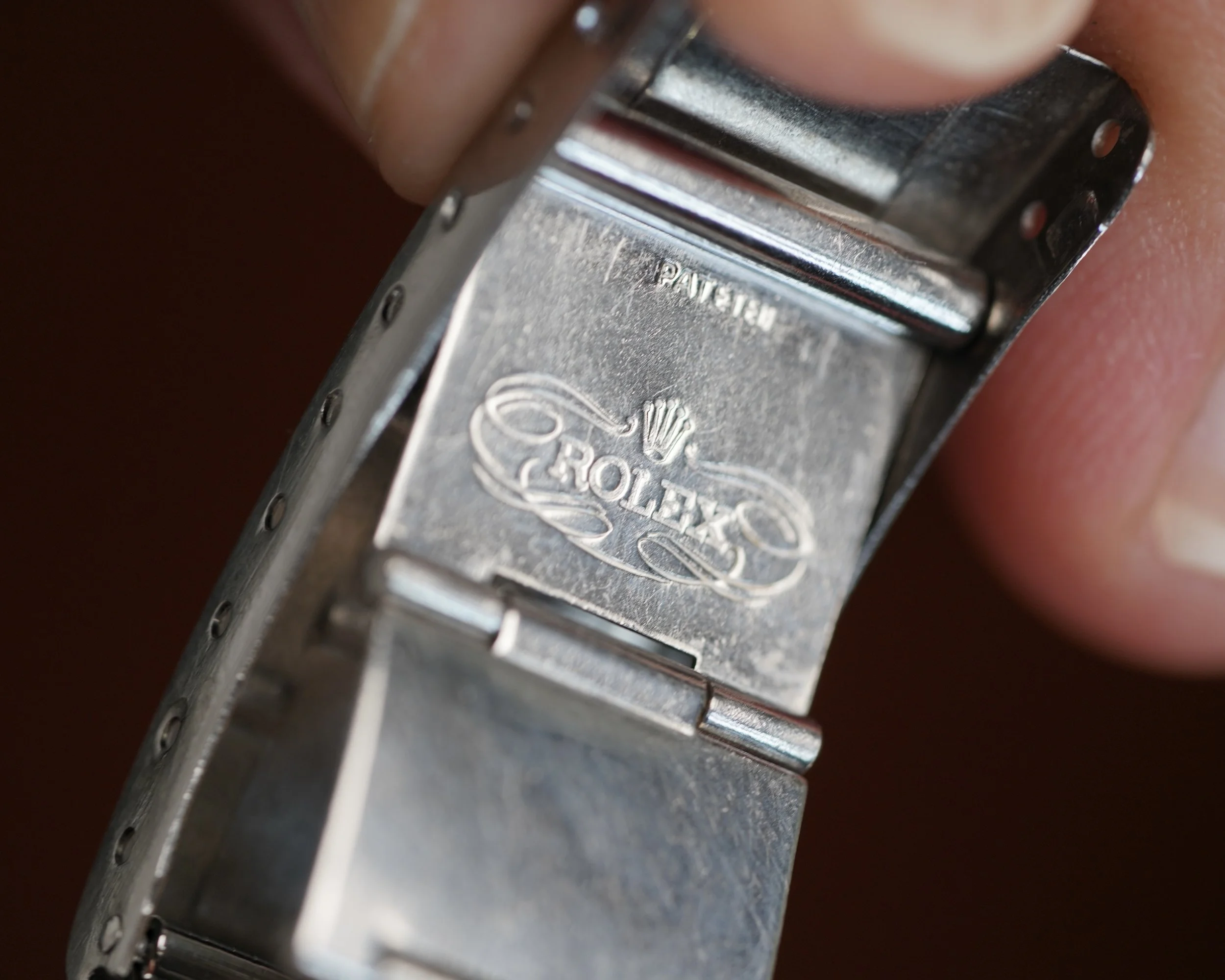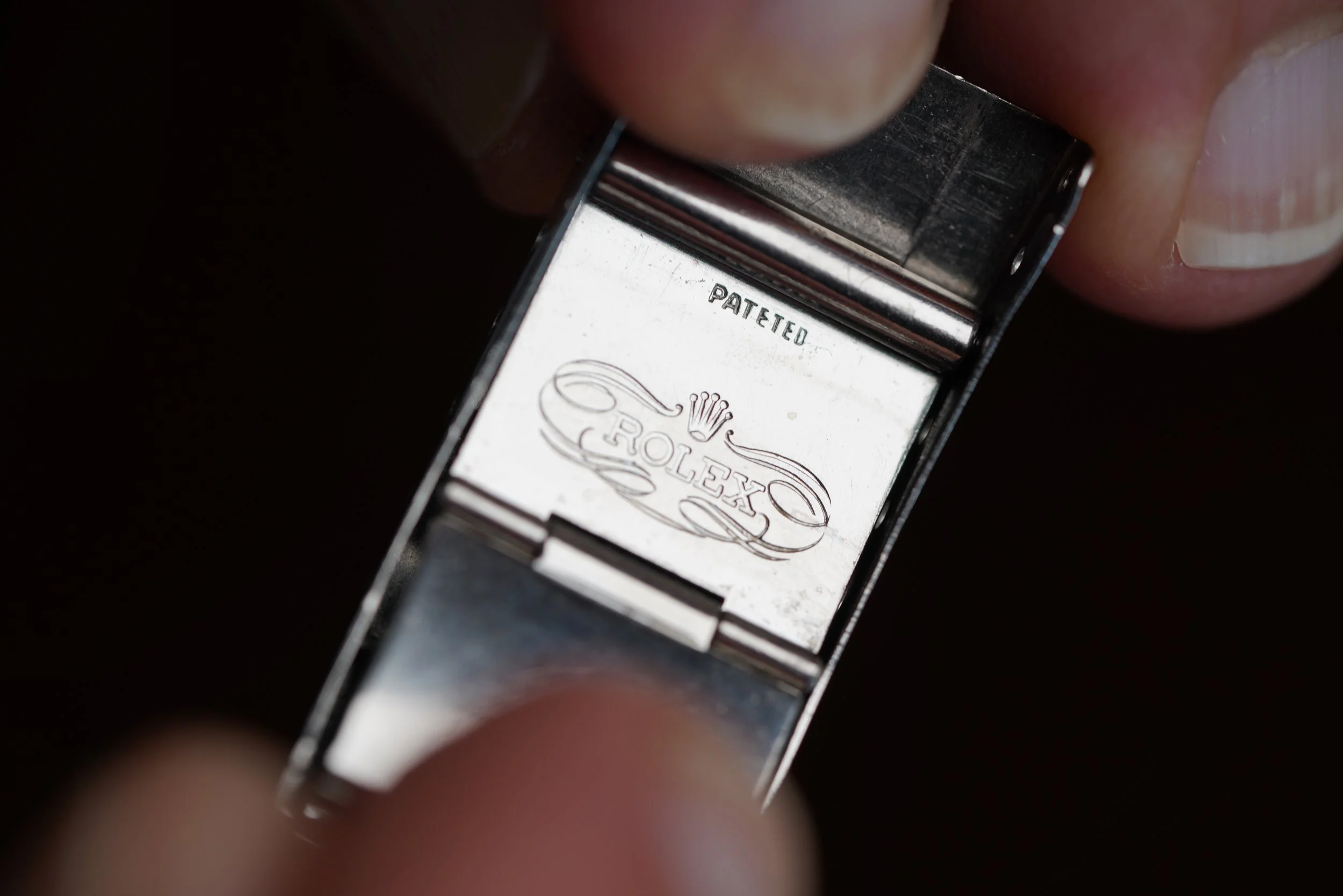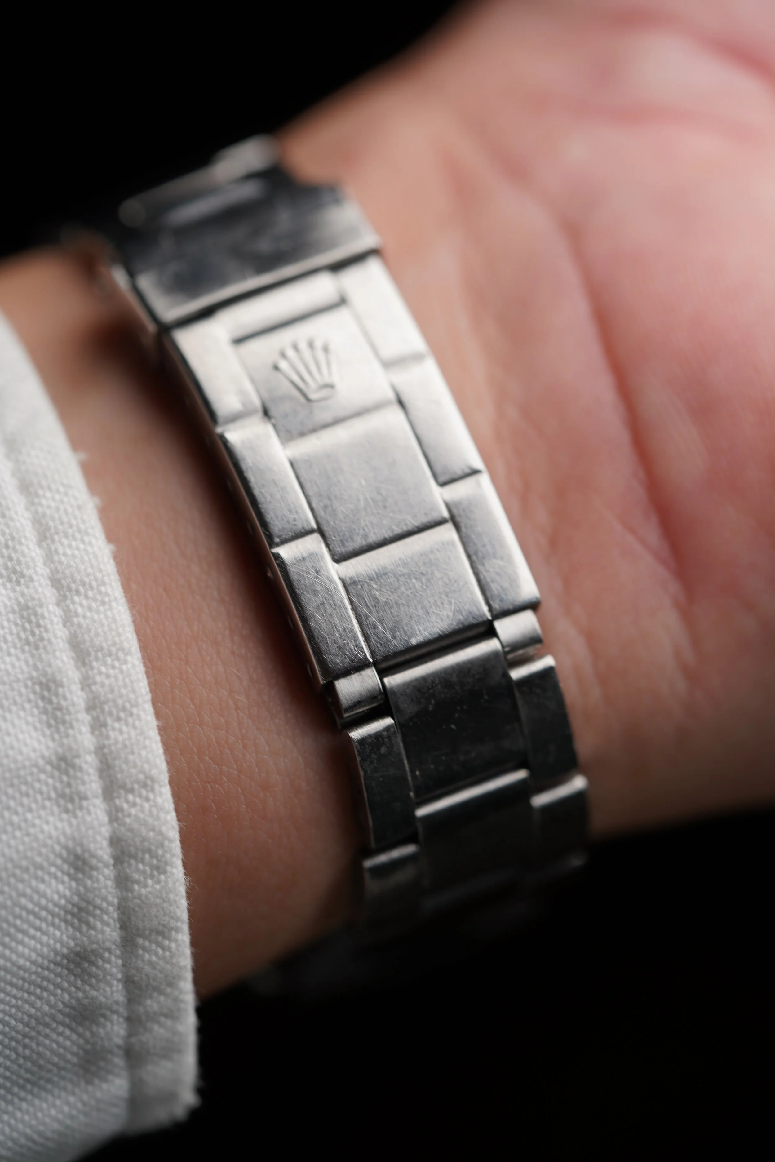 This example has a 1.2M serial number dating the watch to circa 1966. The watch is paired on a folded link Rolex Oyster bracelet with 285 end links dating to 1971. The case has been lightly polished.