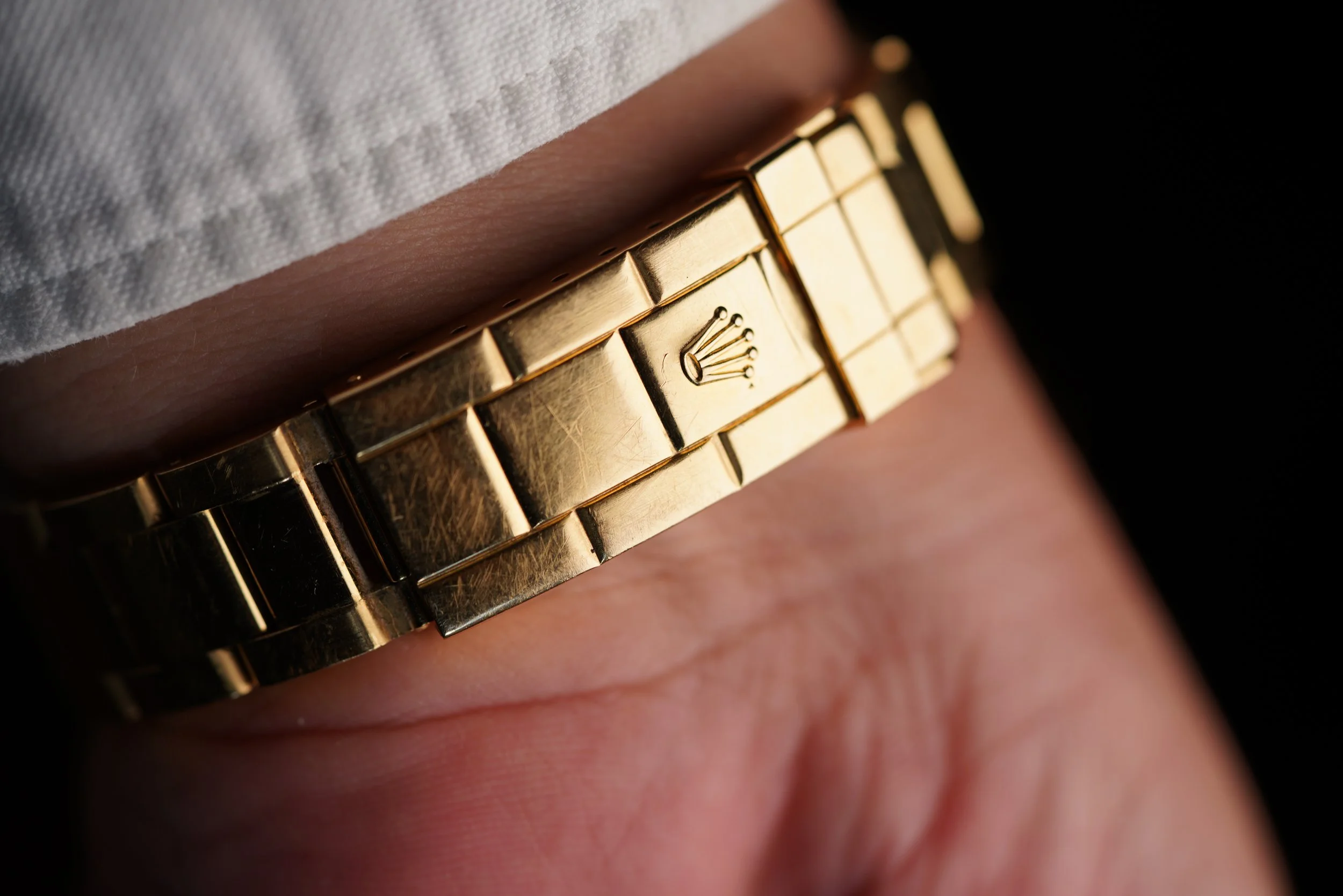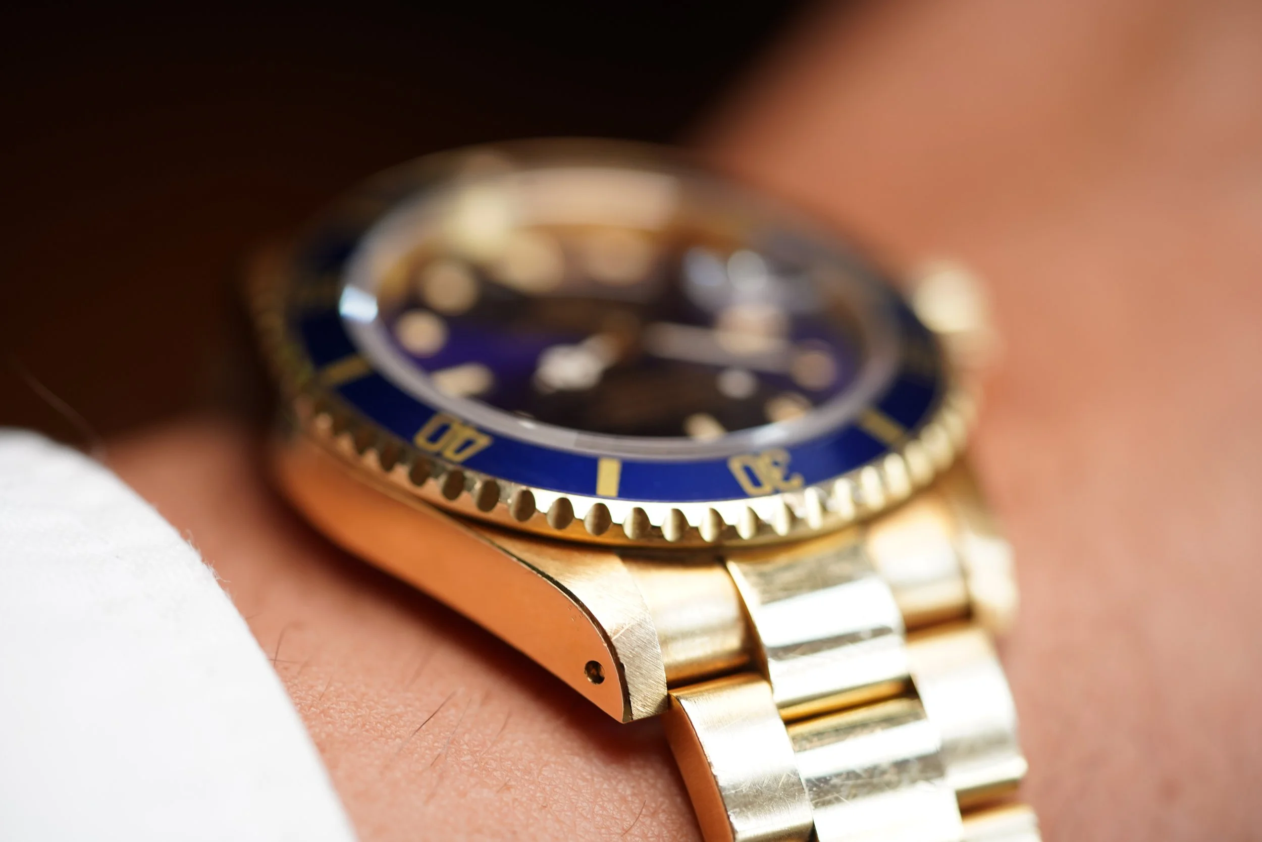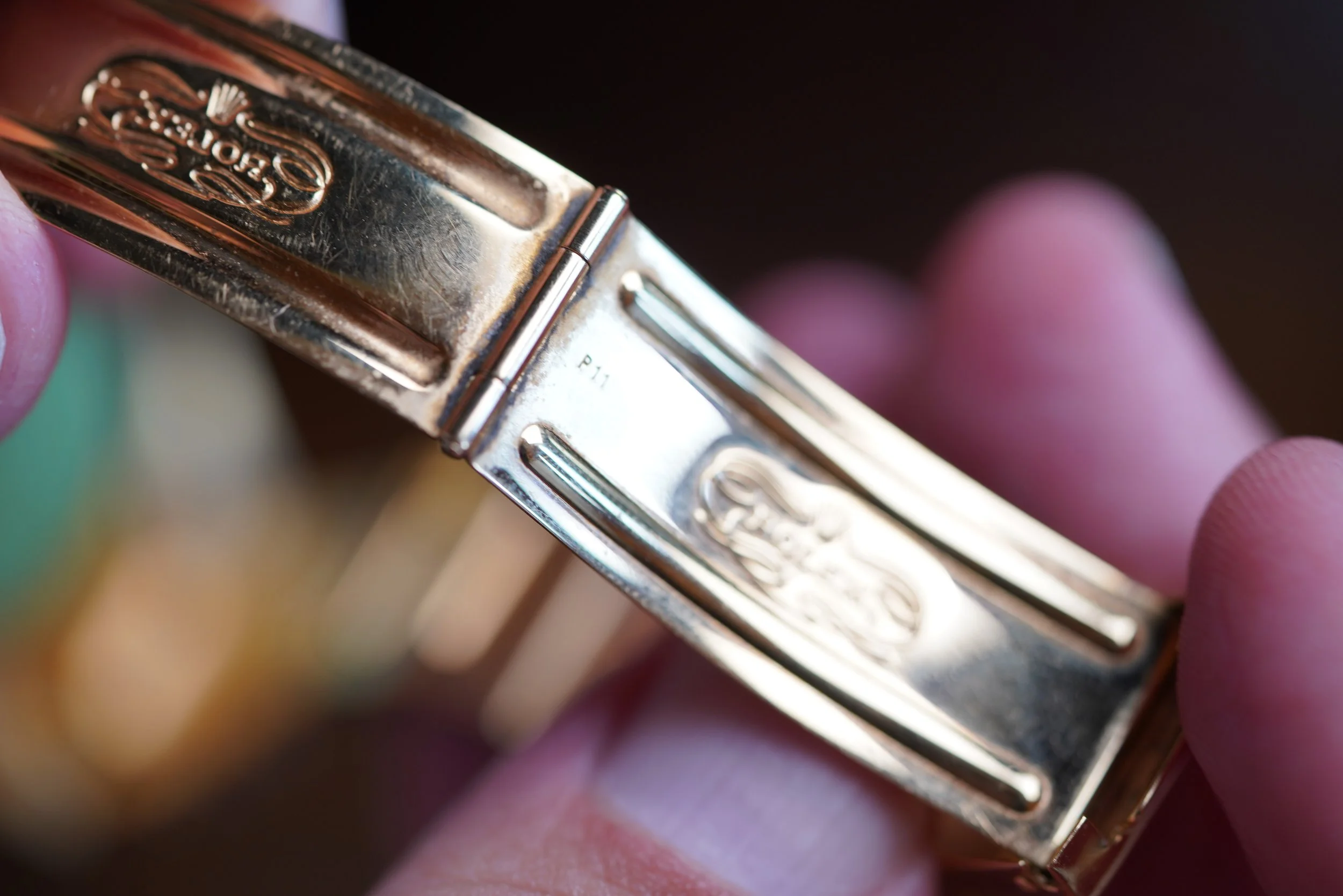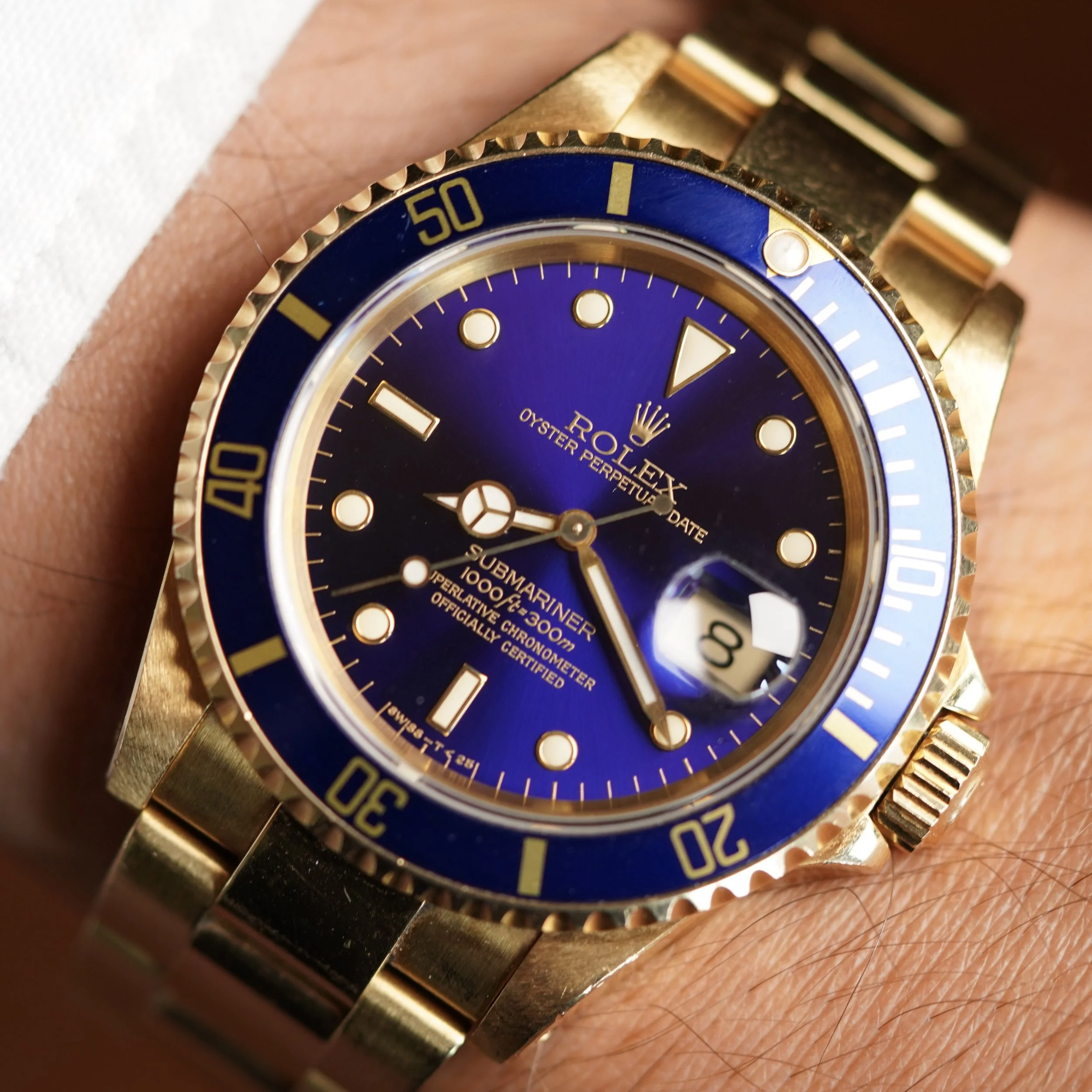 This Rolex Submariner reference 16618 is an outstanding Submariner dating to circa 1991 with an X serial. The 18k yellow fold case is in fantastic condition and appears to be unpolished. We occasionally see blue dial 16618 from 1990-1991 have a purple phenomenon which is extremely exciting to witness on the wrist at different angles.