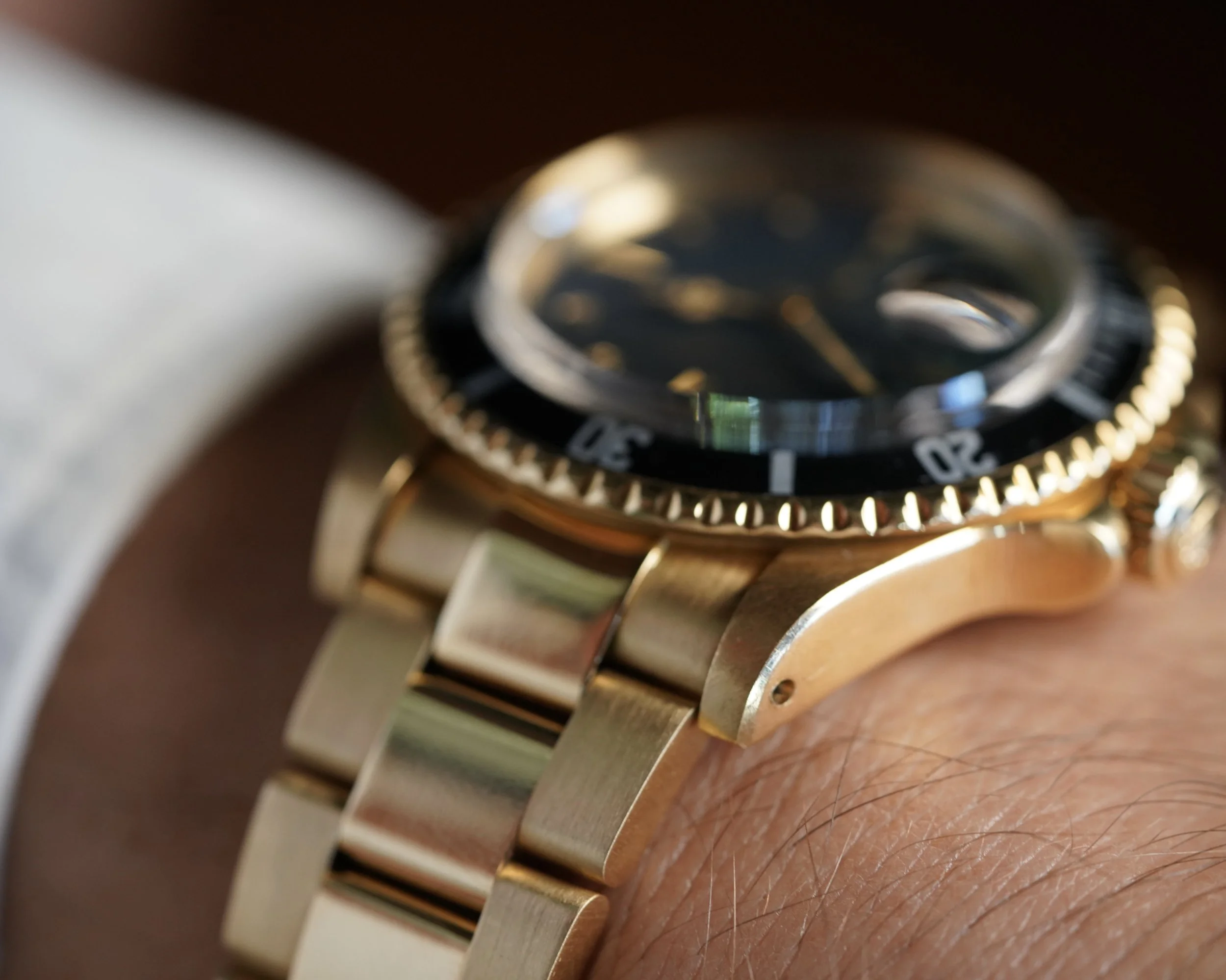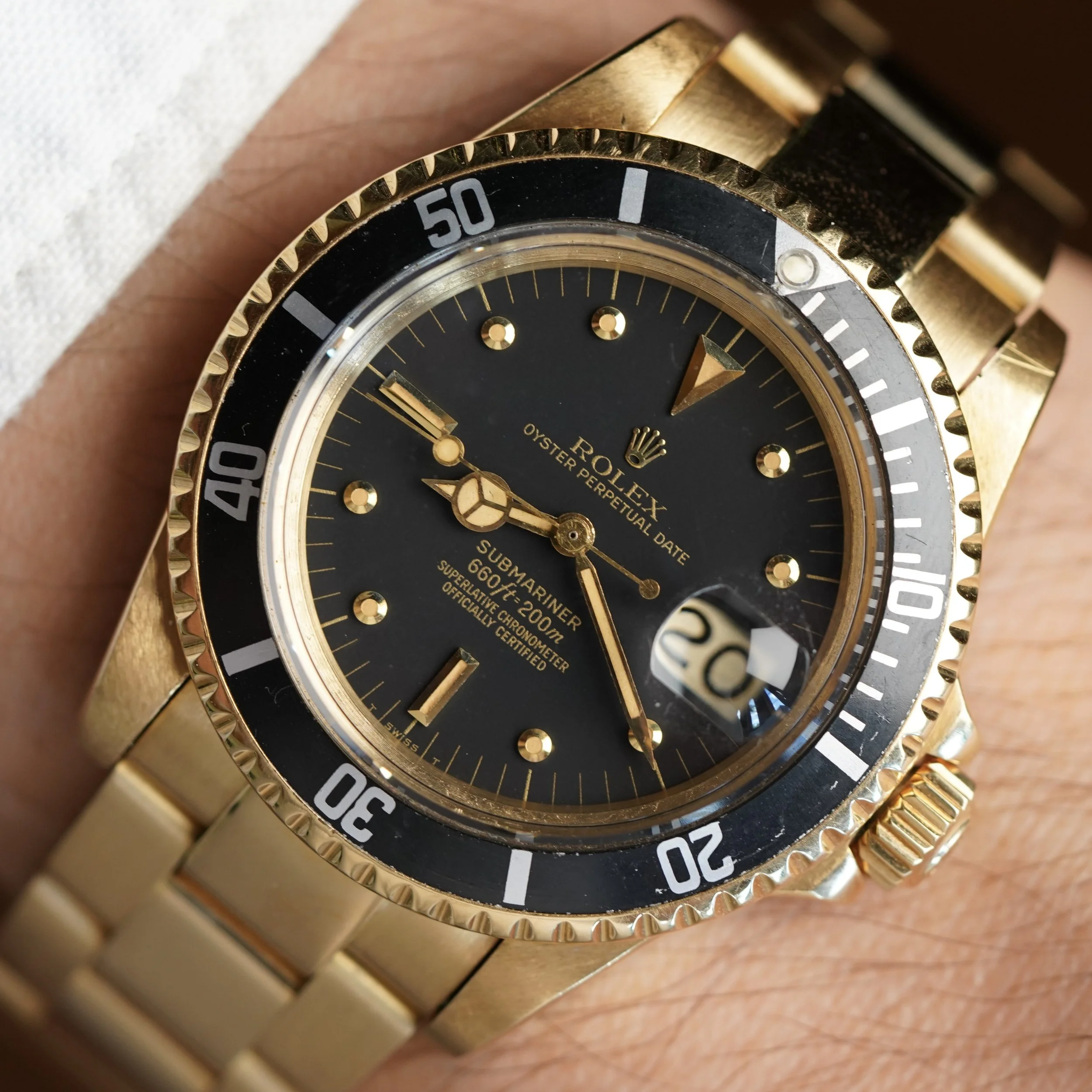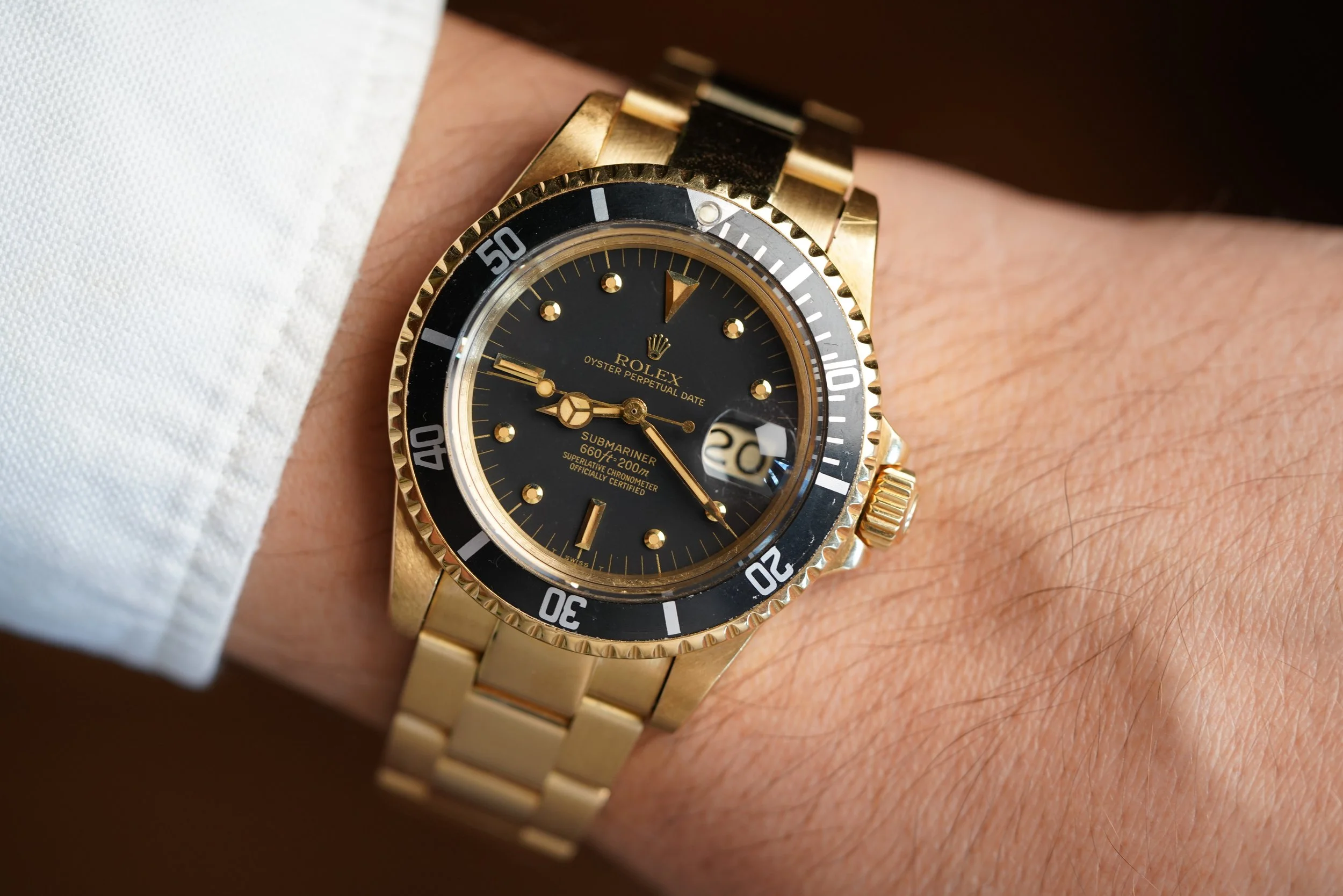 This early gold Submariner reference 1680 is extremely special and rare. This example was produced shortly after the meters-first versions, one of which went for almost $200,000 at auction. Only 5,765 examples of the 1680 in yellow gold were produced according to Rolex.