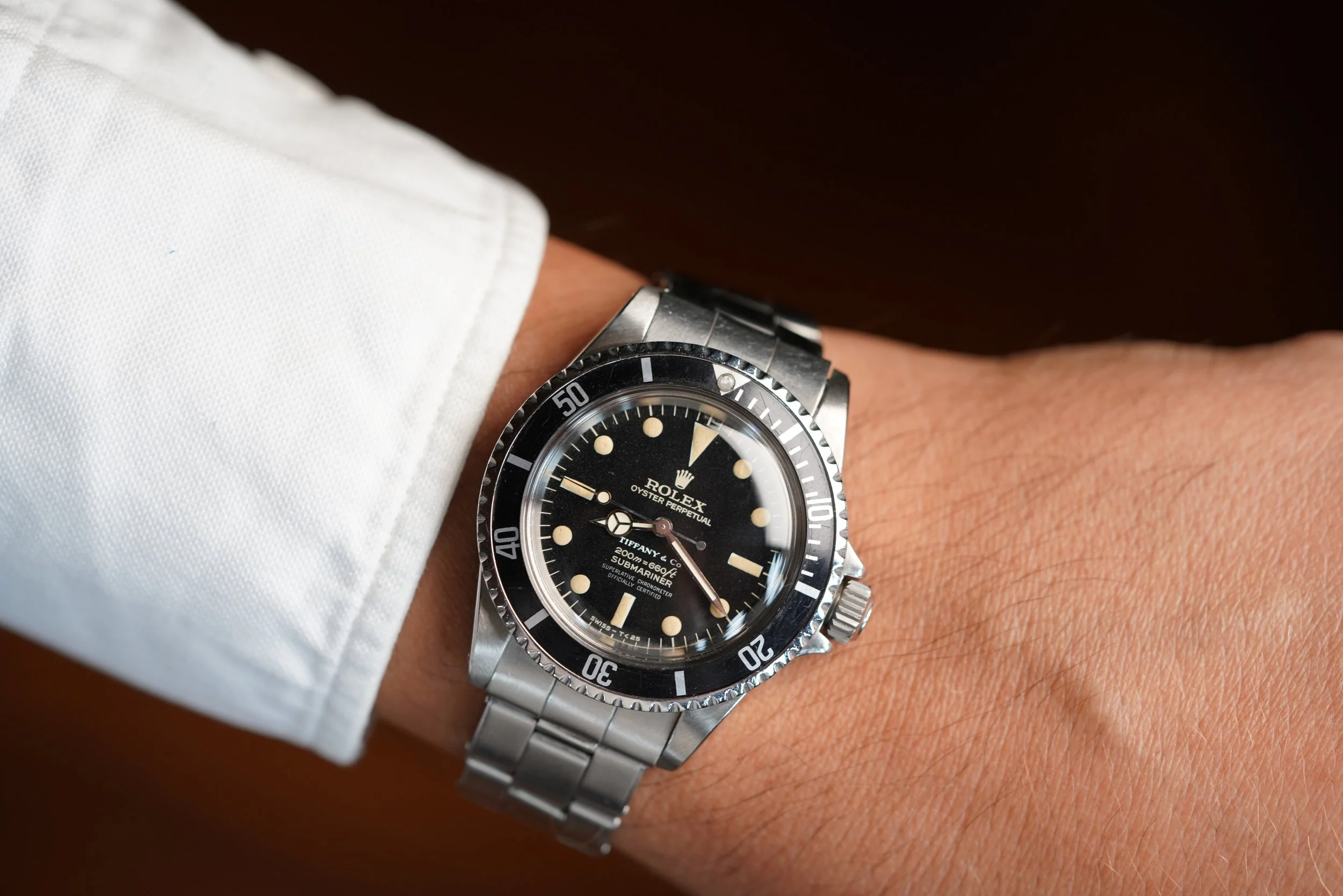 This Rolex Submariner reference 5512 is a special example with a gilt dial and retailer-signed dial by Tiffany & Co. It features a well preserved dial with open-chapter ring with Bart Simpson coronet. The watch has a 1.6M serial dating to circa 1967. It is paired on a C&I Rivet bracelet that was recently added and dates to 1975. The case is polished but is attractive. It features a long 5 bezel insert which was recently added. It has a later Triplock crown which was replaced at some point in the past. This watch came from the daughter of the original owner who purchased it new in New York City. He had it serviced by Rolex in the early 1970s and the bracelet, insert, hands, and crown were replaced at that point.