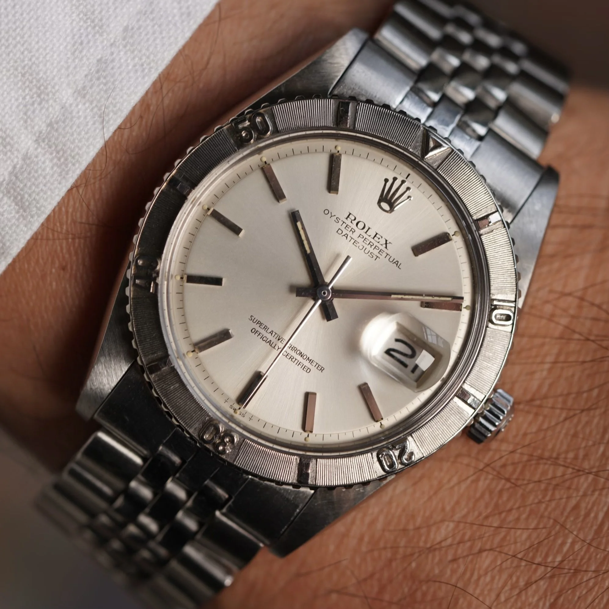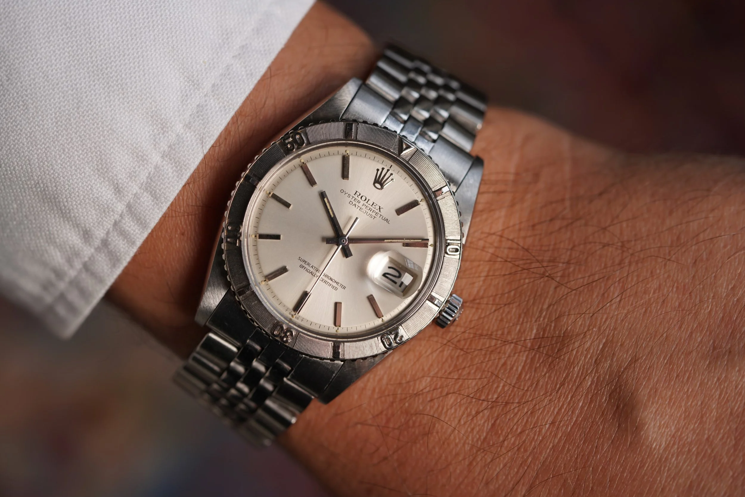 The Rolex Thunderbird Datejust is a very cool watch. They are classic, but also a bit sporty with their robust signature bezels in white gold. The case measures 36mm in diameter (42mm lug-to-lug). It has been lightly polished and features a very attractive pie-pan dial with sunken minute track. The watch recently passed a water resistance test to 3 bars.