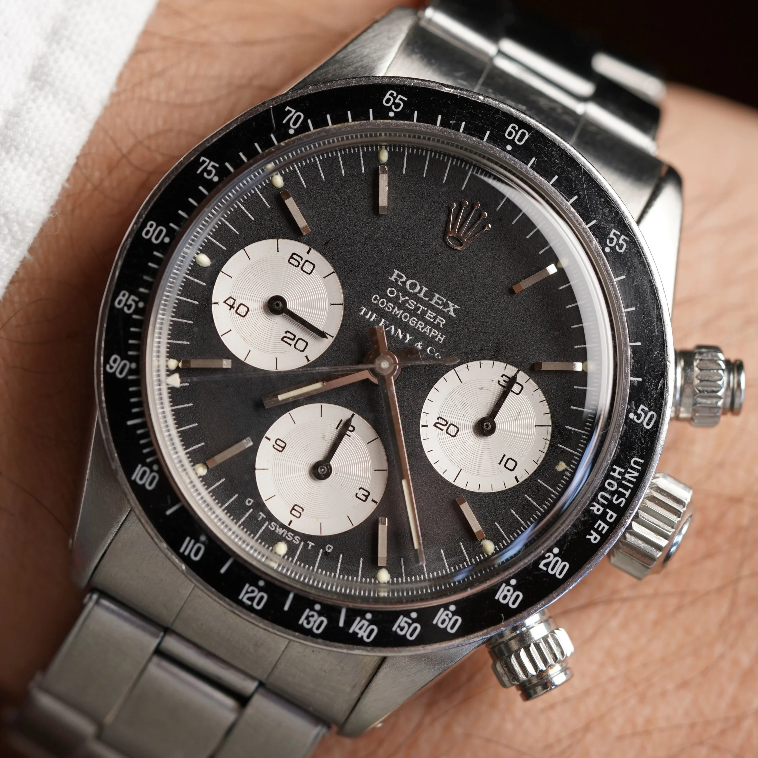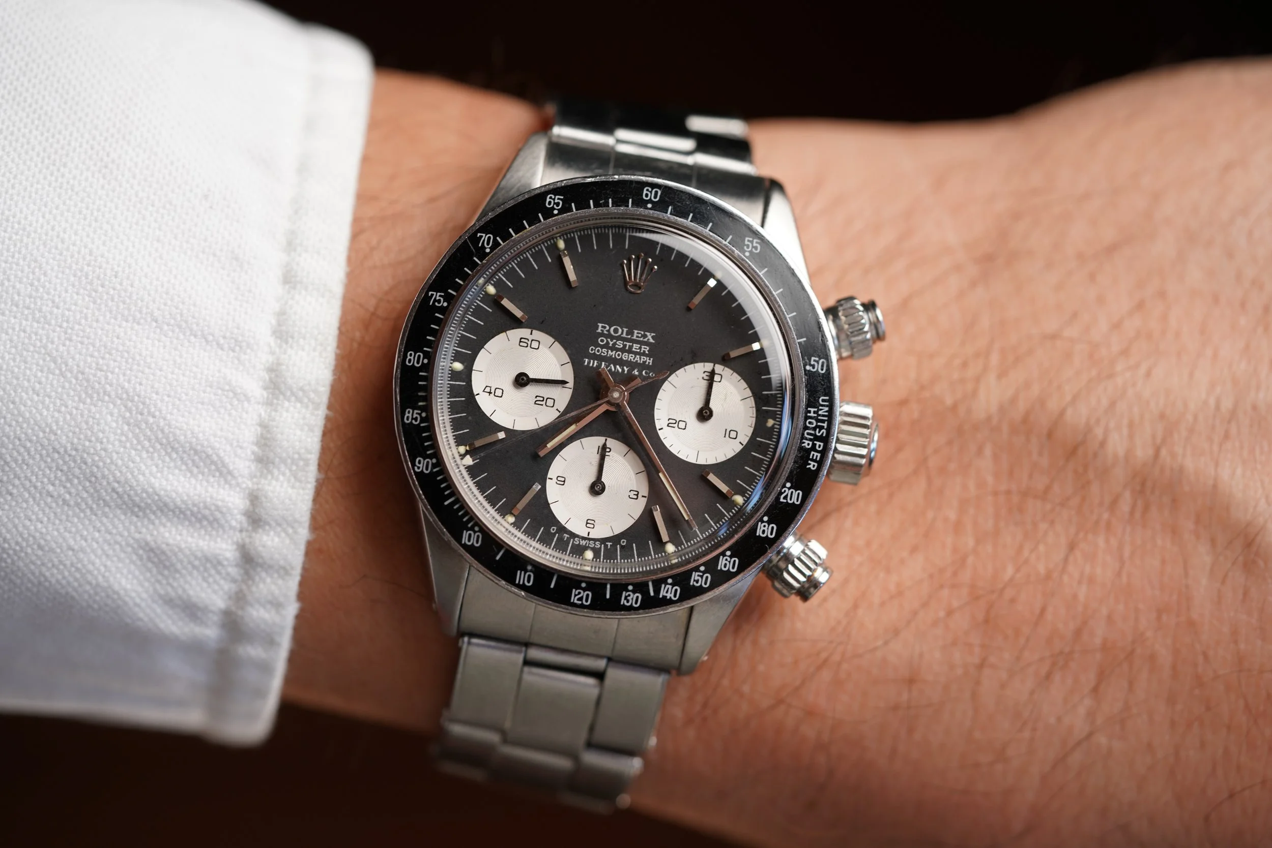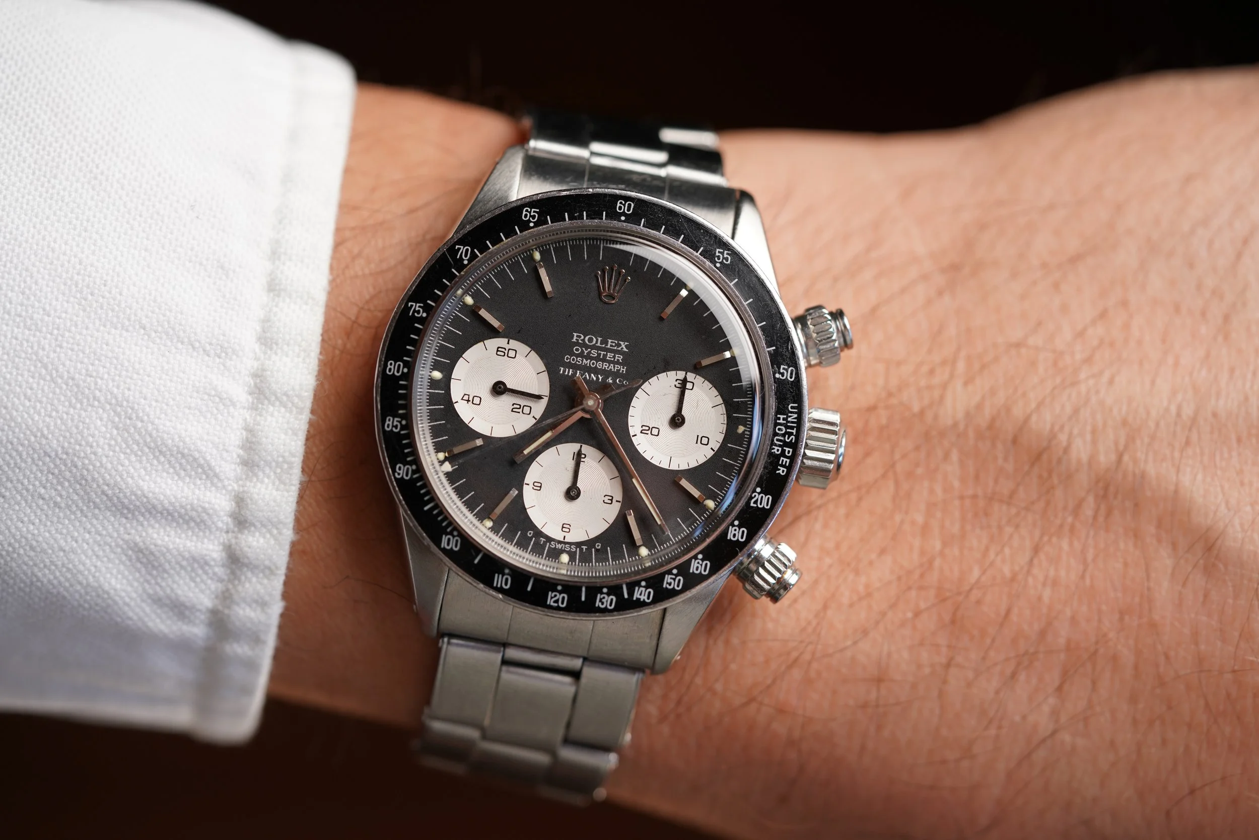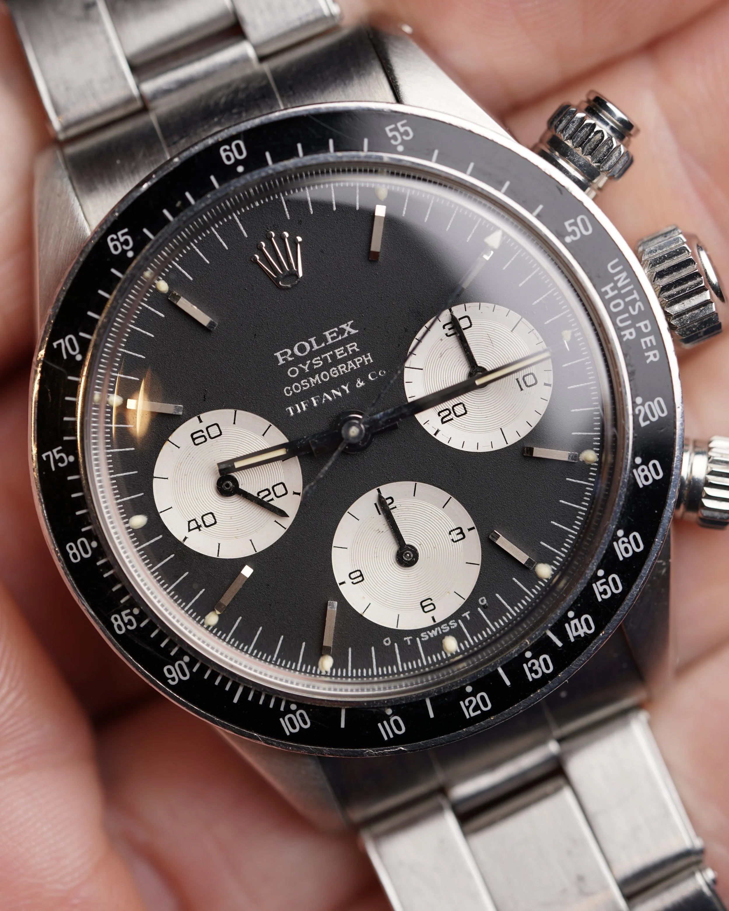 The present watch is a Daytona we have been chasing from the original owner for a long time. The original owner received this Daytona reference 6263 as a wedding present in 1973 from his in-laws just as he was starting medical school.school. His in-laws purchased the watch brand new from the prestigious retailer Tiffany & Co. It is a special example featuring the highly-coveted double-signed dial. It has been a faithful timekeeper for him for several decades. At one point a patient commented on the value and rarity of the watch, which surprised the original owner! Tiffany-signed watches from Rolex and Patek Philippe are among the most desirable category in vintage watches.