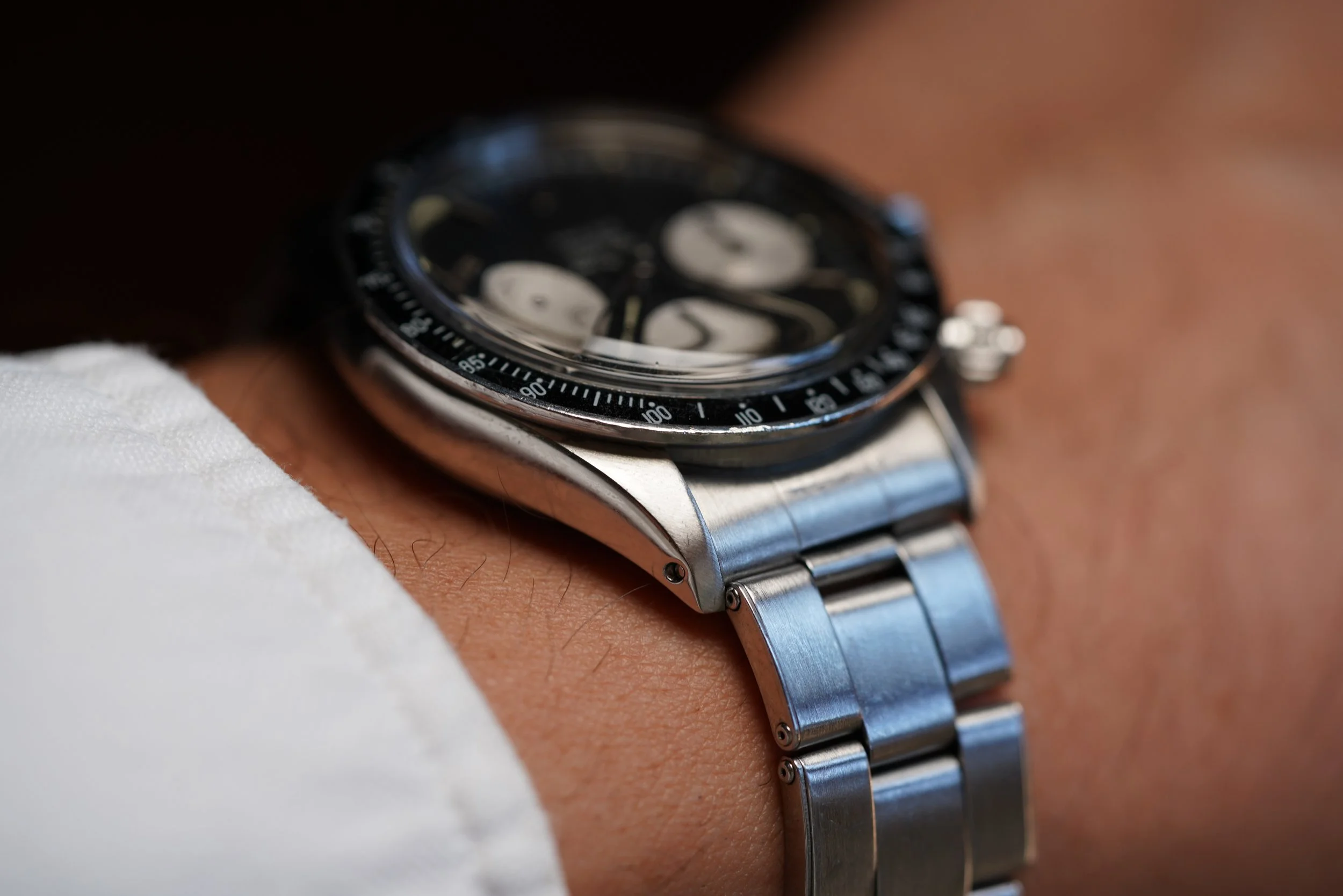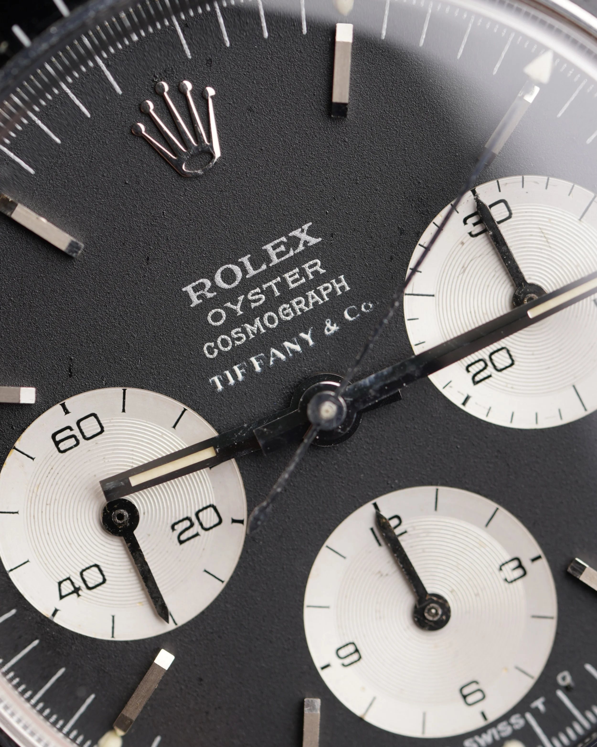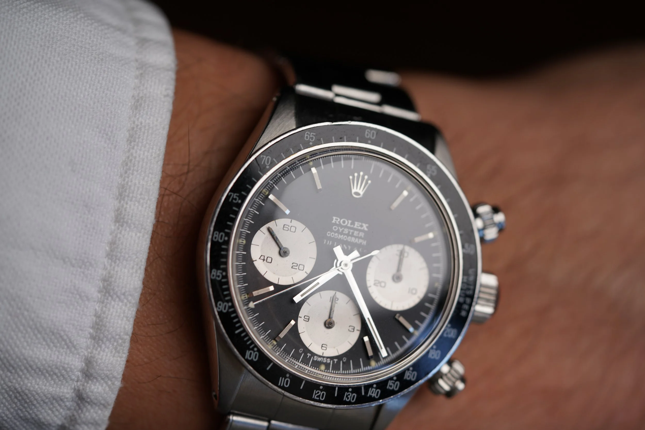 The present watch is a Daytona we have been chasing from the original owner for a long time. The original owner received this Daytona reference 6263 as a wedding present in 1973 from his in-laws just as he was starting medical school.school. His in-laws purchased the watch brand new from the prestigious retailer Tiffany & Co. It is a special example featuring the highly-coveted double-signed dial. It has been a faithful timekeeper for him for several decades. At one point a patient commented on the value and rarity of the watch, which surprised the original owner! Tiffany-signed watches from Rolex and Patek Philippe are among the most desirable category in vintage watches.