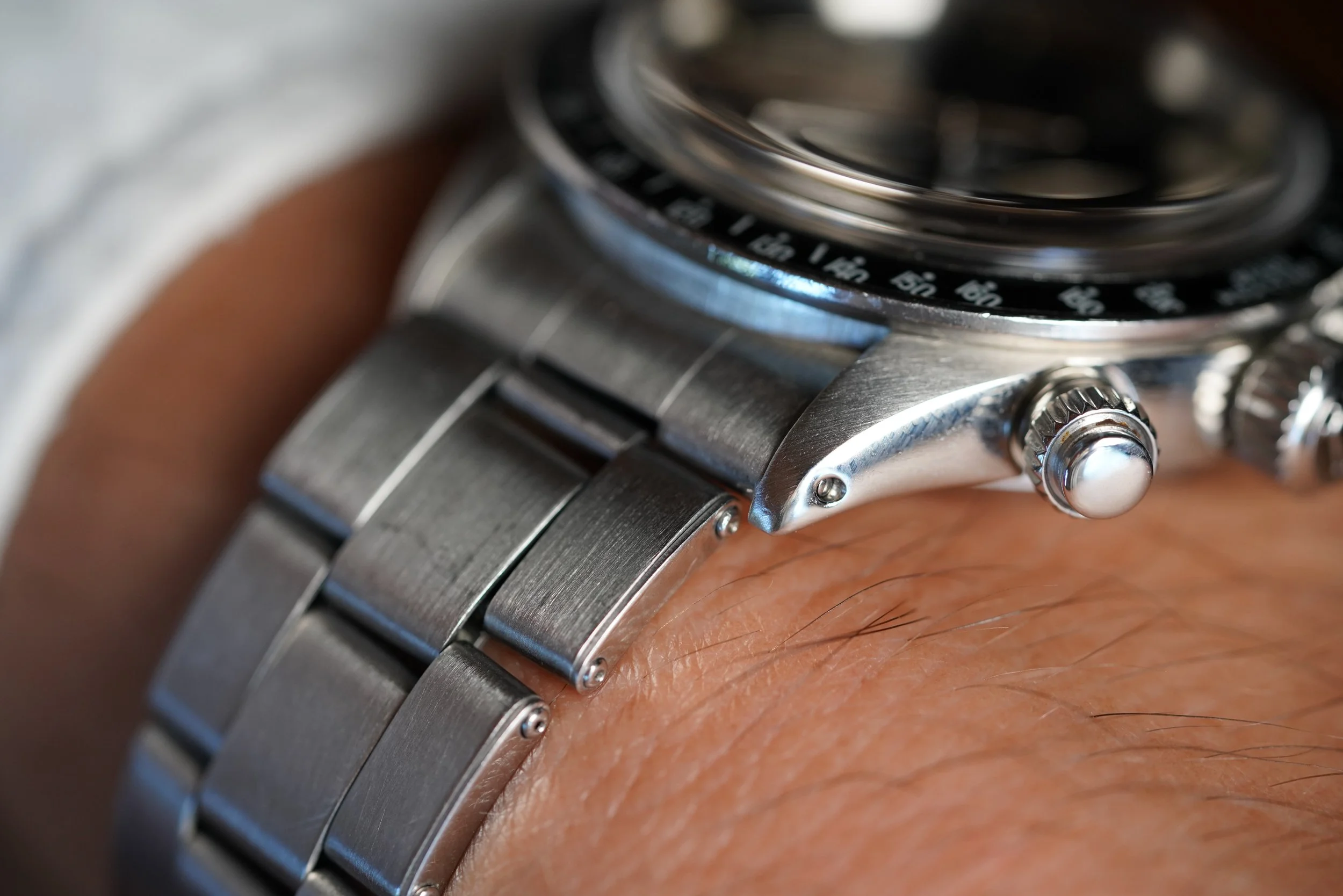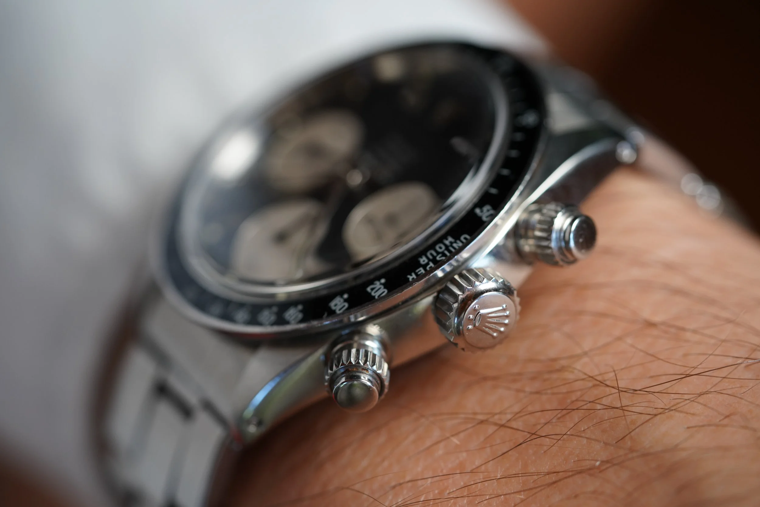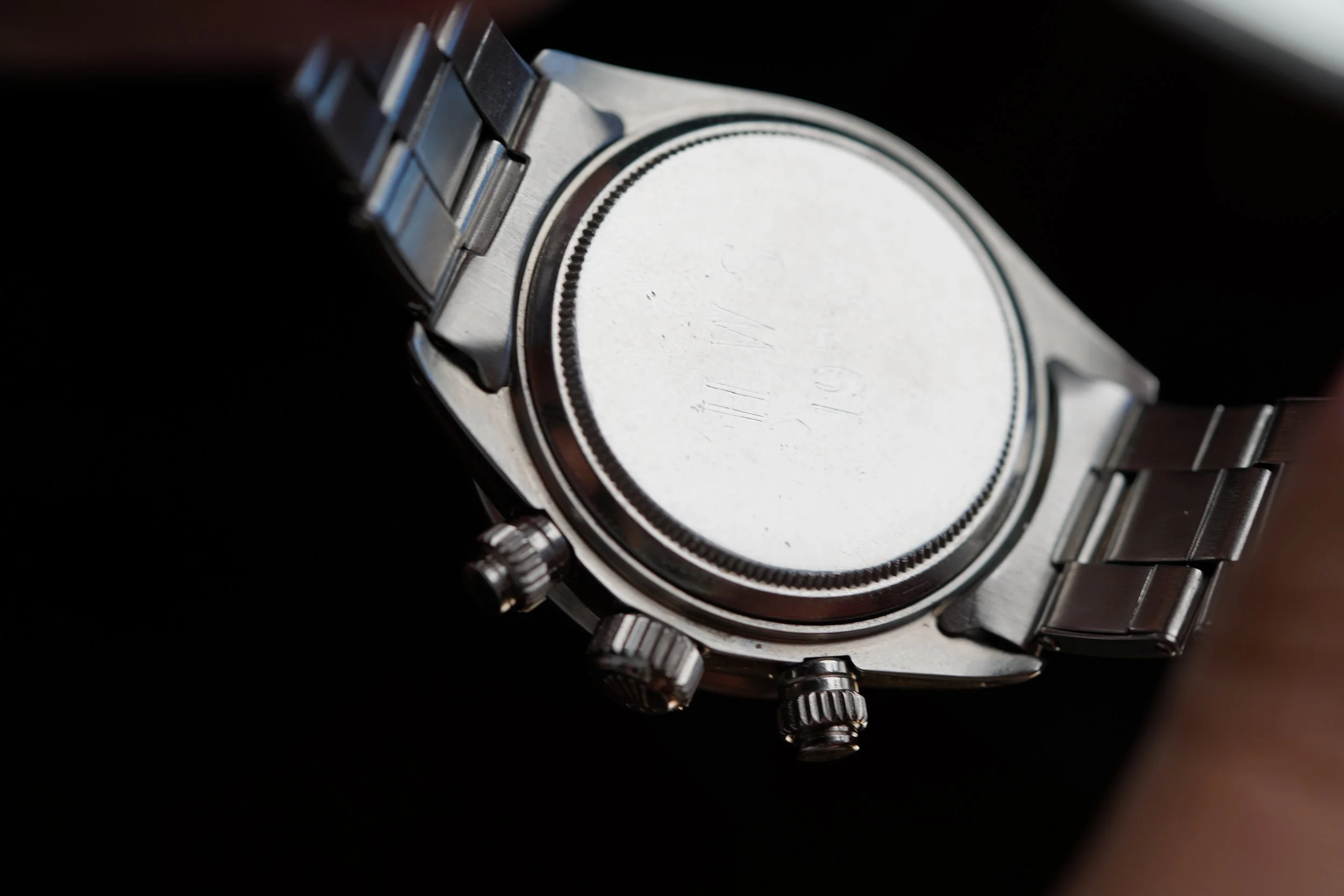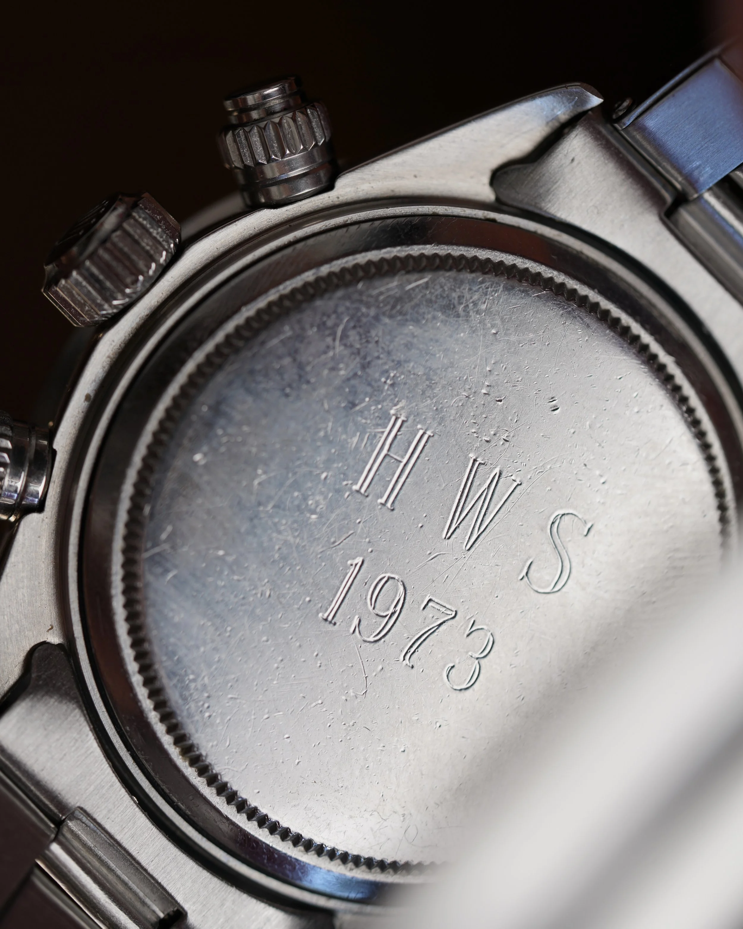 The present watch is a Daytona we have been chasing from the original owner for a long time. The original owner received this Daytona reference 6263 as a wedding present in 1973 from his in-laws just as he was starting medical school.school. His in-laws purchased the watch brand new from the prestigious retailer Tiffany & Co. It is a special example featuring the highly-coveted double-signed dial. It has been a faithful timekeeper for him for several decades. At one point a patient commented on the value and rarity of the watch, which surprised the original owner! Tiffany-signed watches from Rolex and Patek Philippe are among the most desirable category in vintage watches.